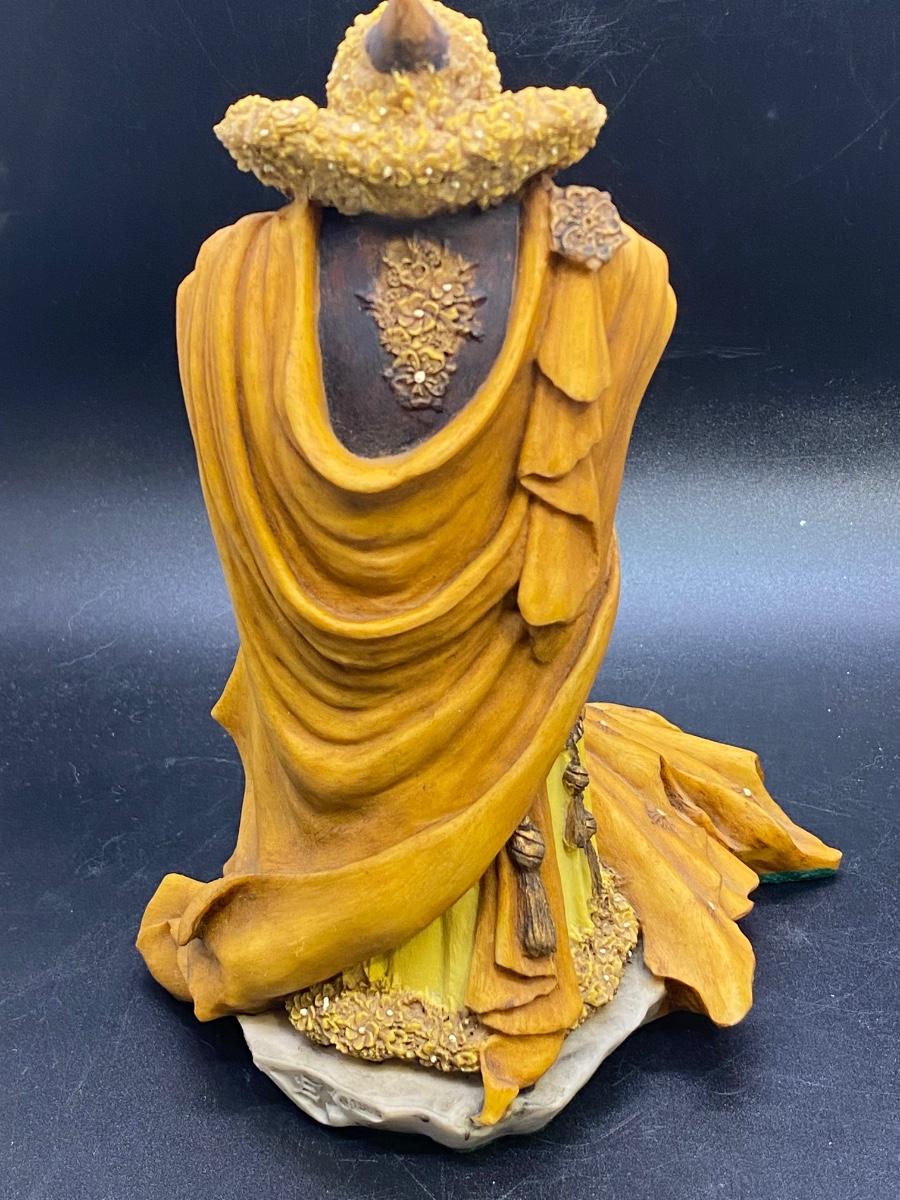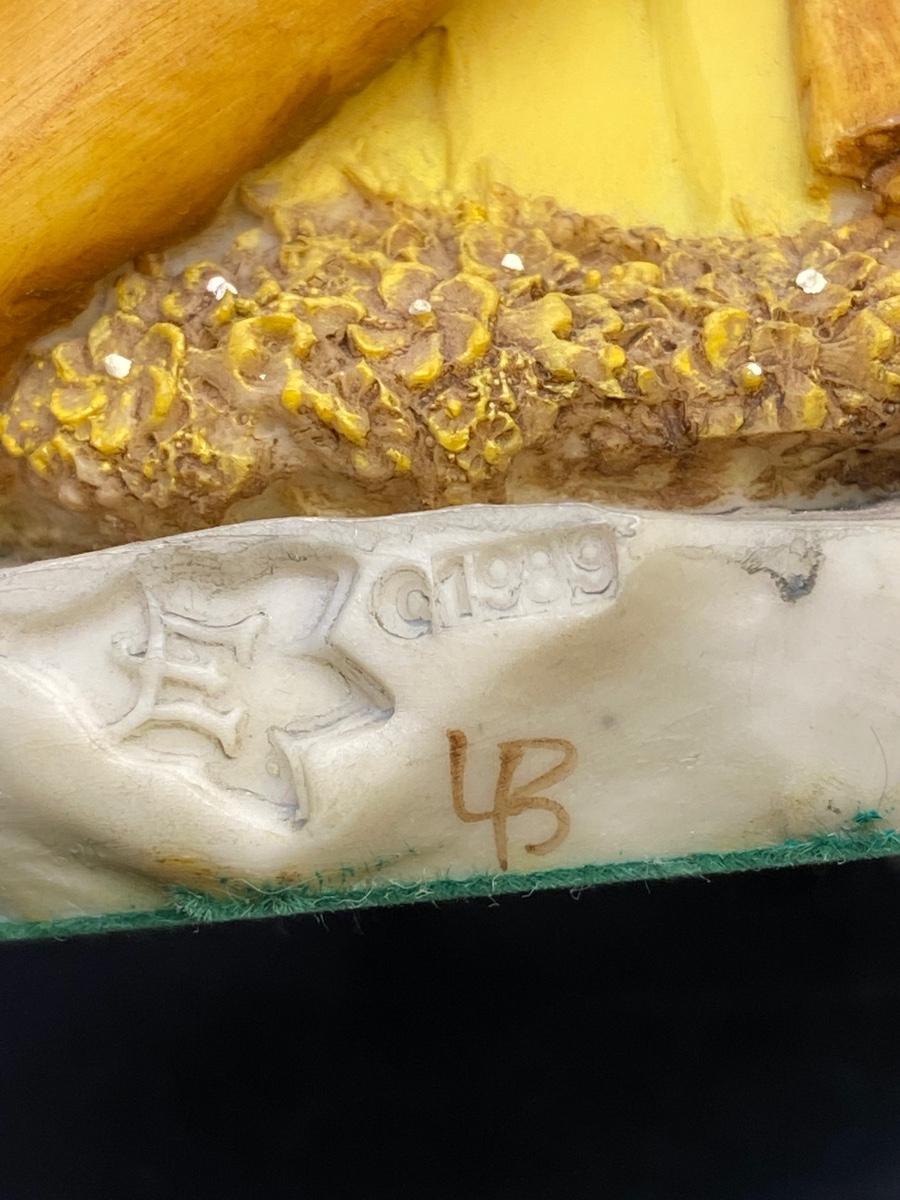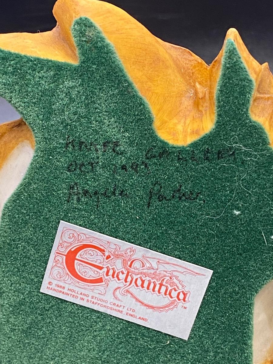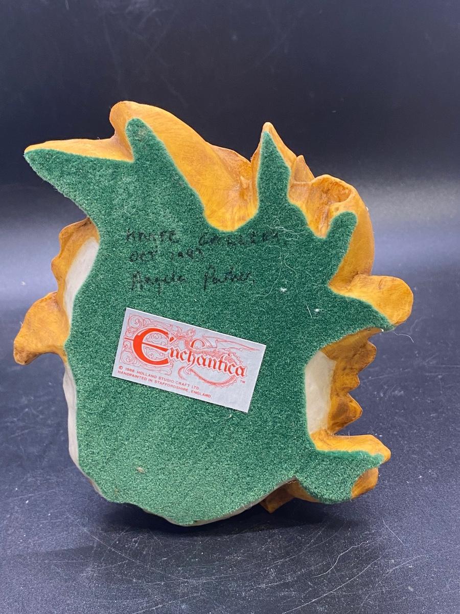 Enchantica crystal ball holding wizard. Nicely detailed. Under 8" size. Sticker on bottom and writing believe it is who gave it to previous owner not artist.