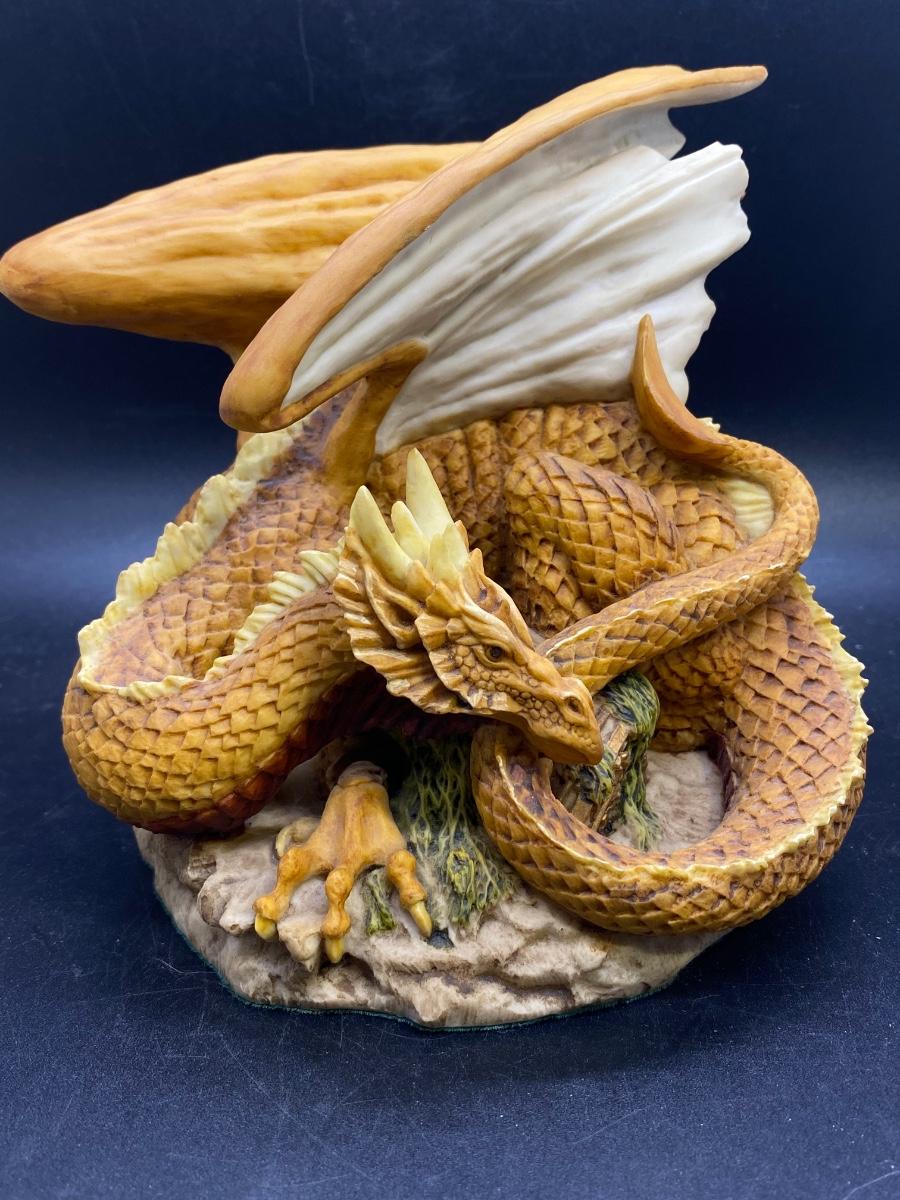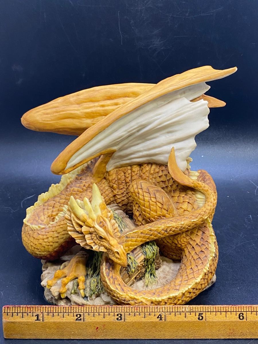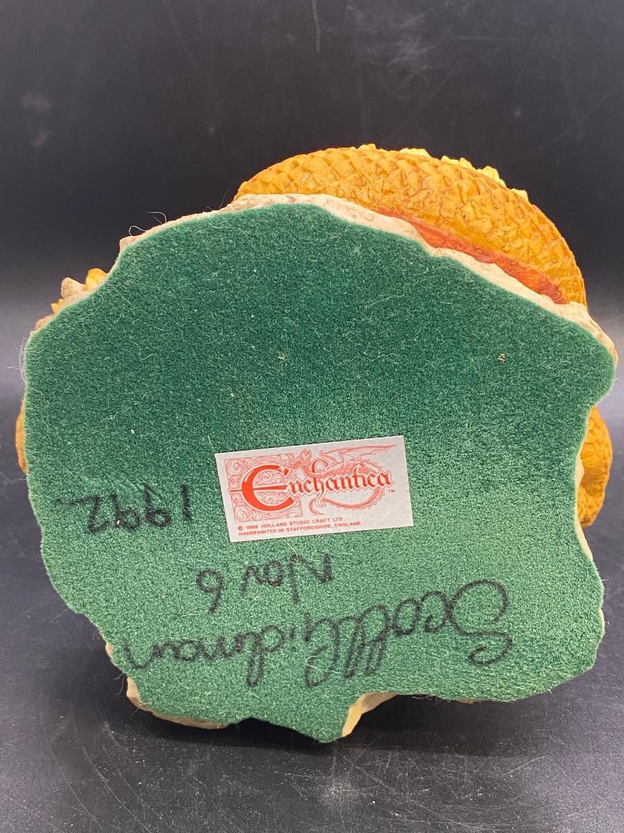 Enchantica mythical creature figurine, coiled up dragon with wings up. Great details. Good condition. About 6" size. Name on bottom is who gave previous owner figurine not artist.