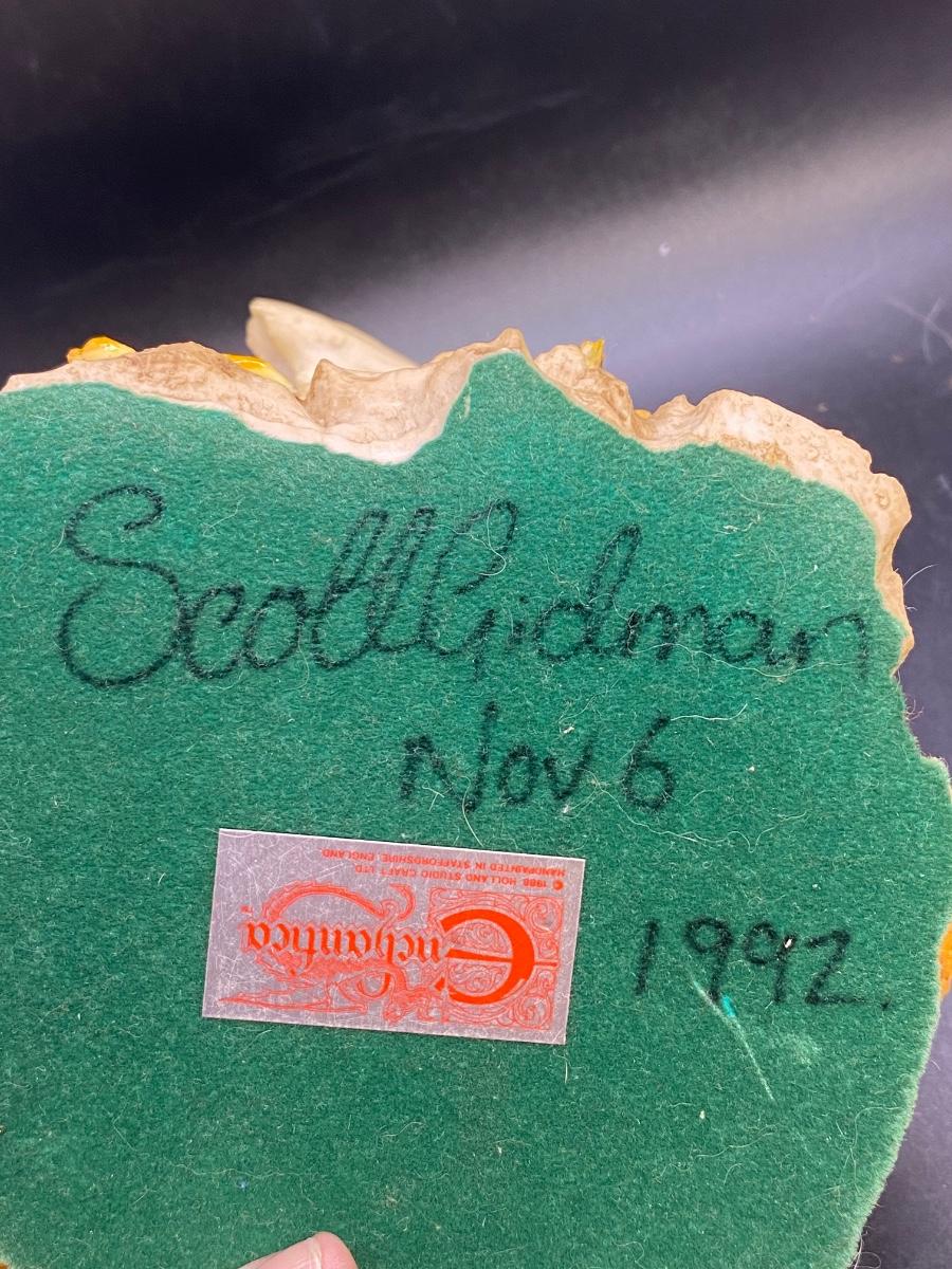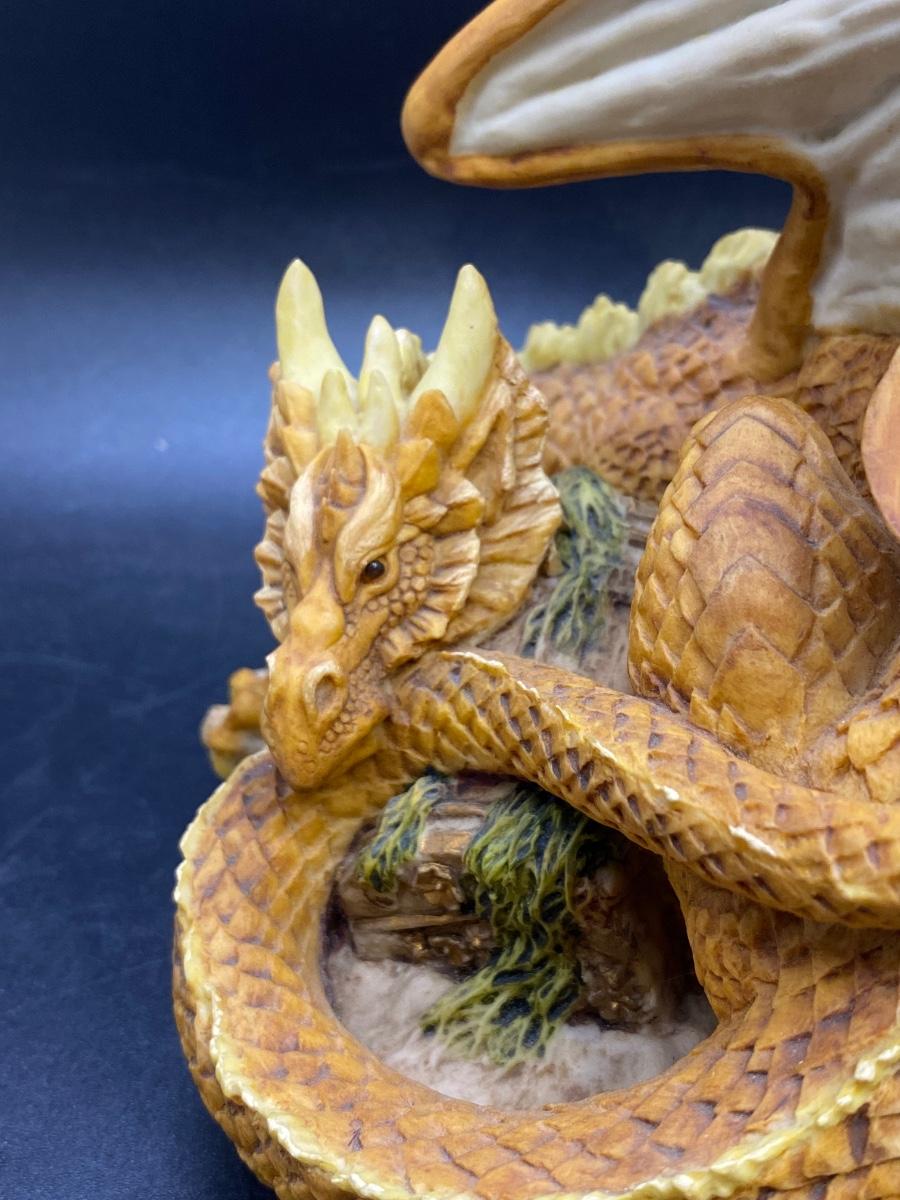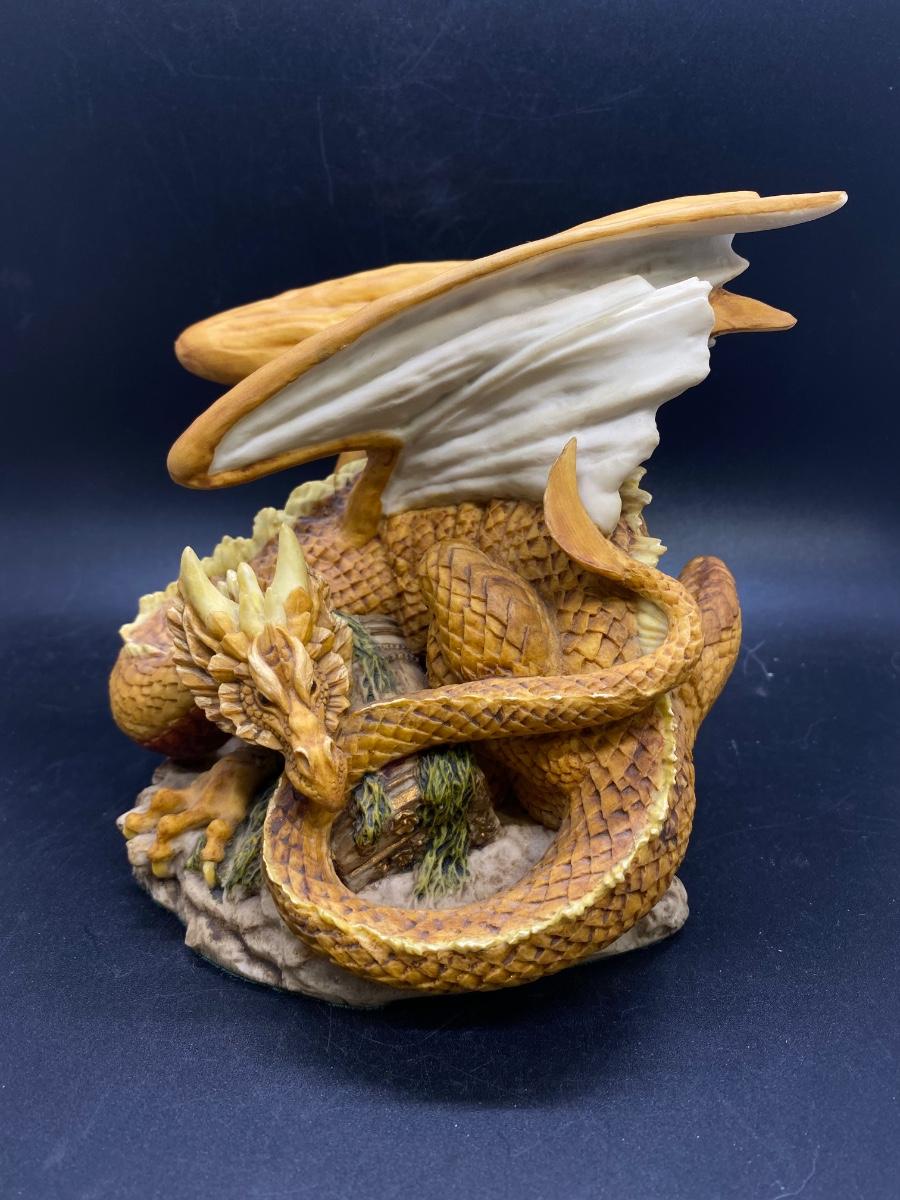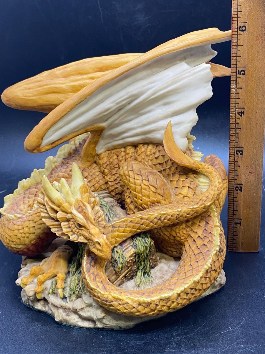 Enchantica mythical creature figurine, coiled up dragon with wings up. Great details. Good condition. About 6" size. Name on bottom is who gave previous owner figurine not artist.