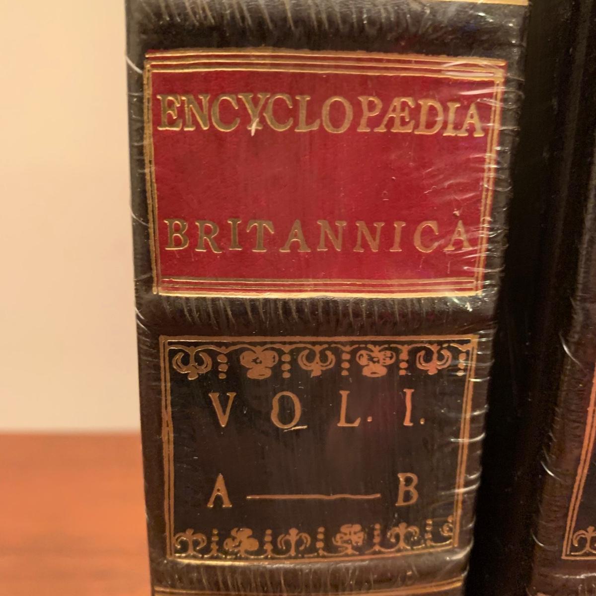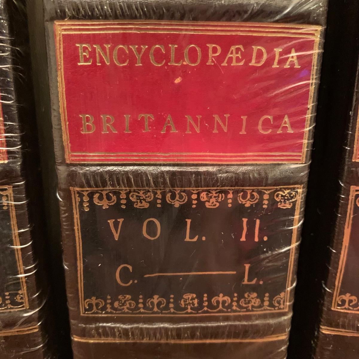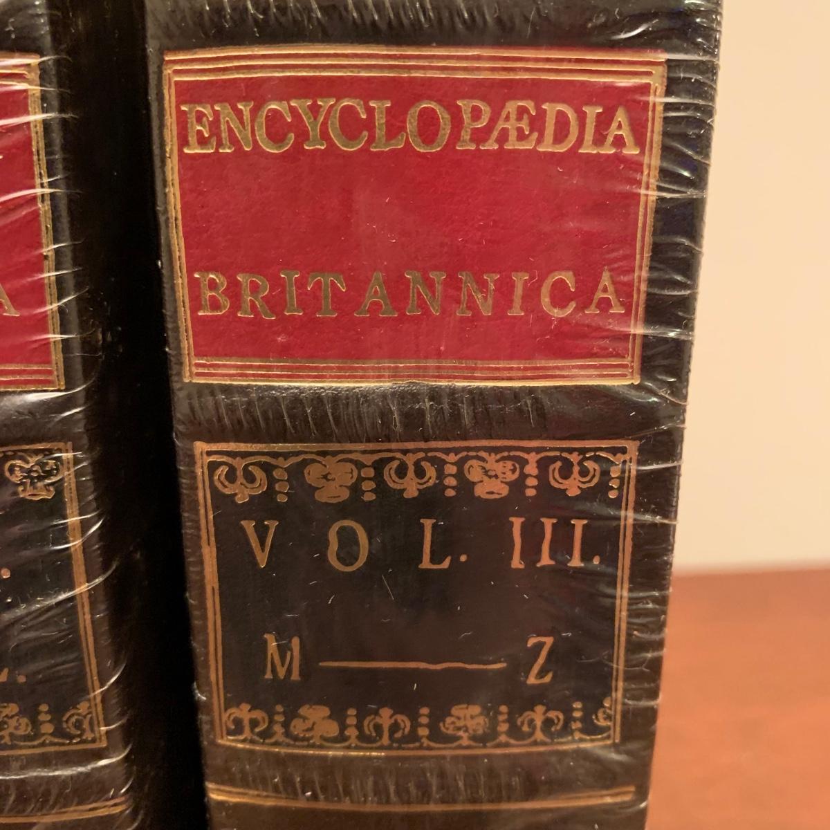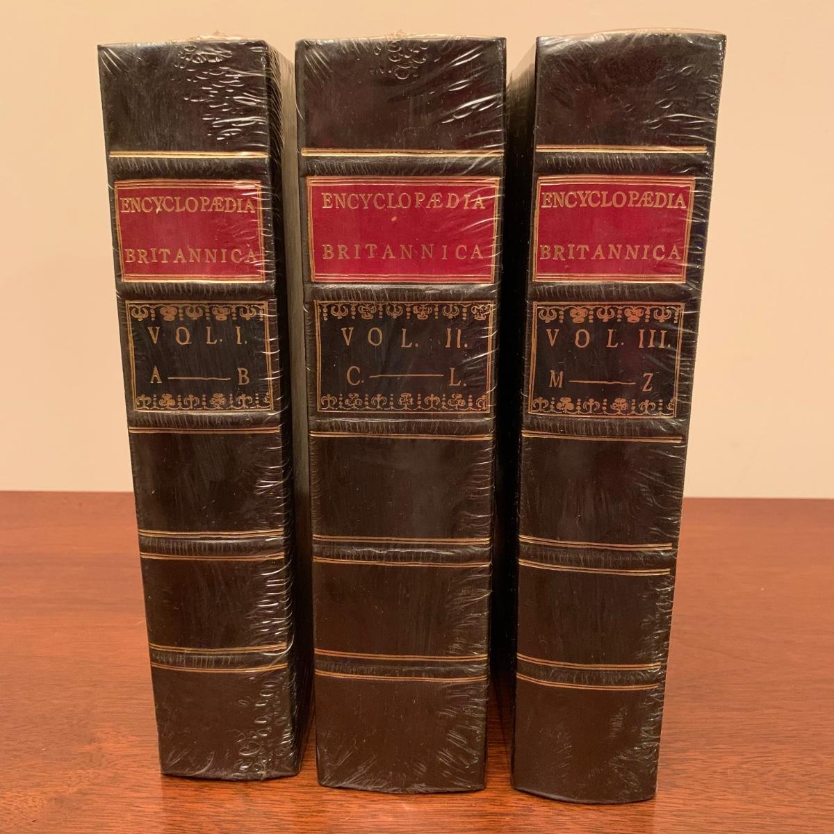 Encyclopædia Britannica hardcover three volume set, unopened as they are each still wrapped in plastic. Each book is approximately 9” x 2.5” x 10.5”.