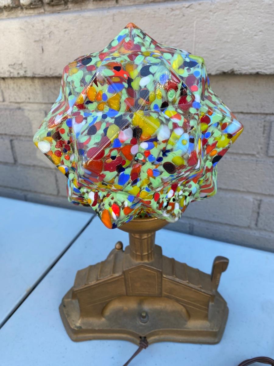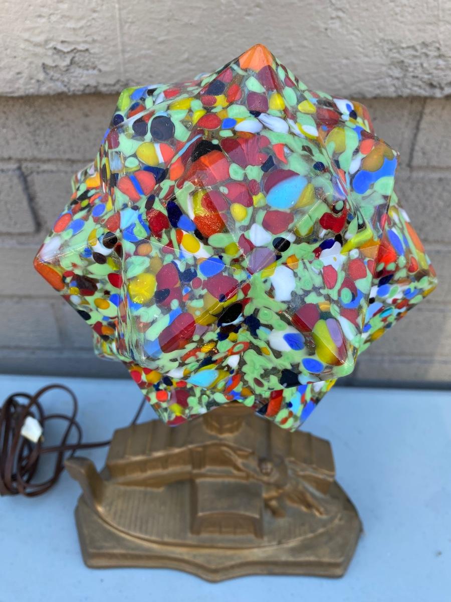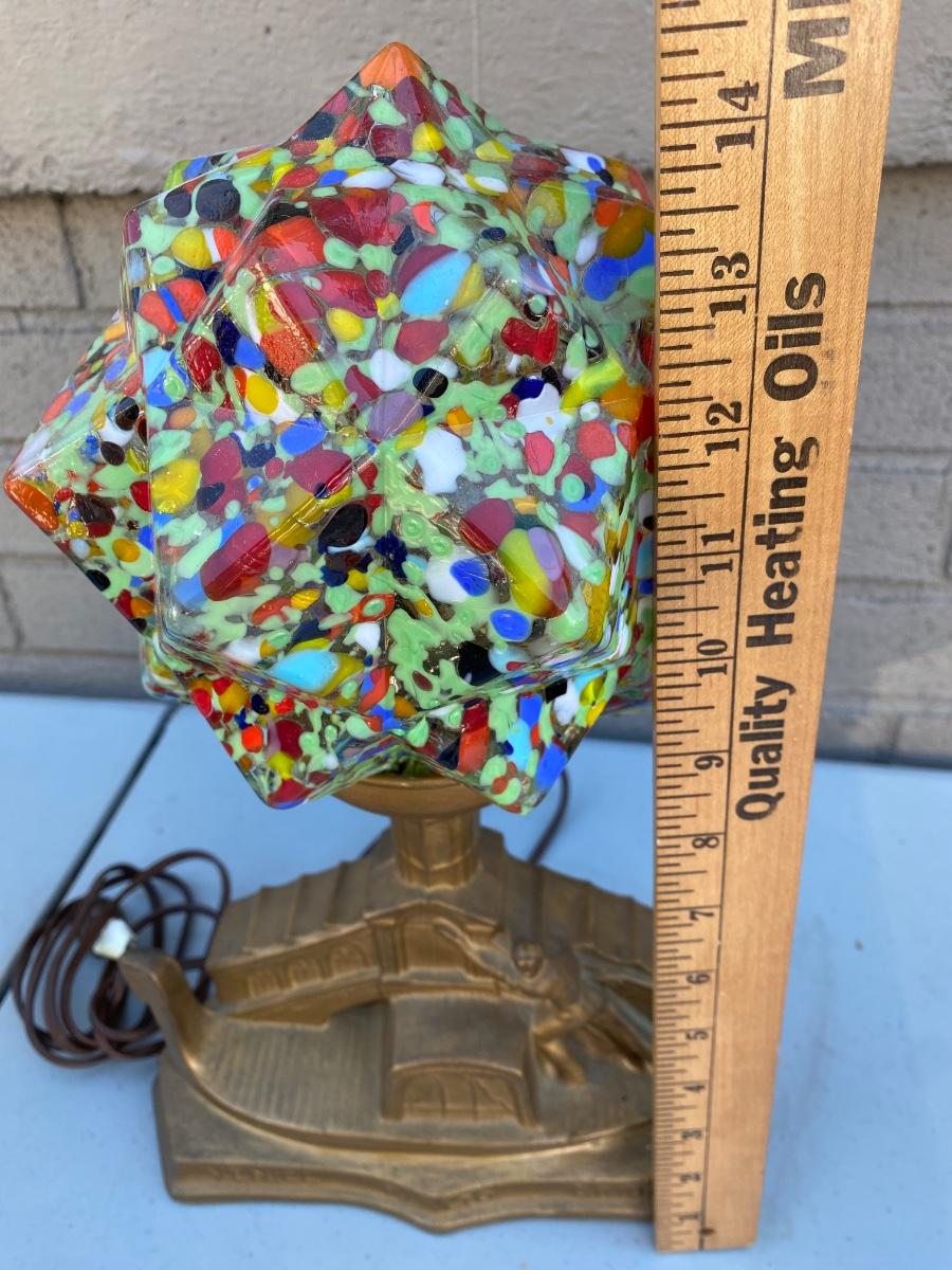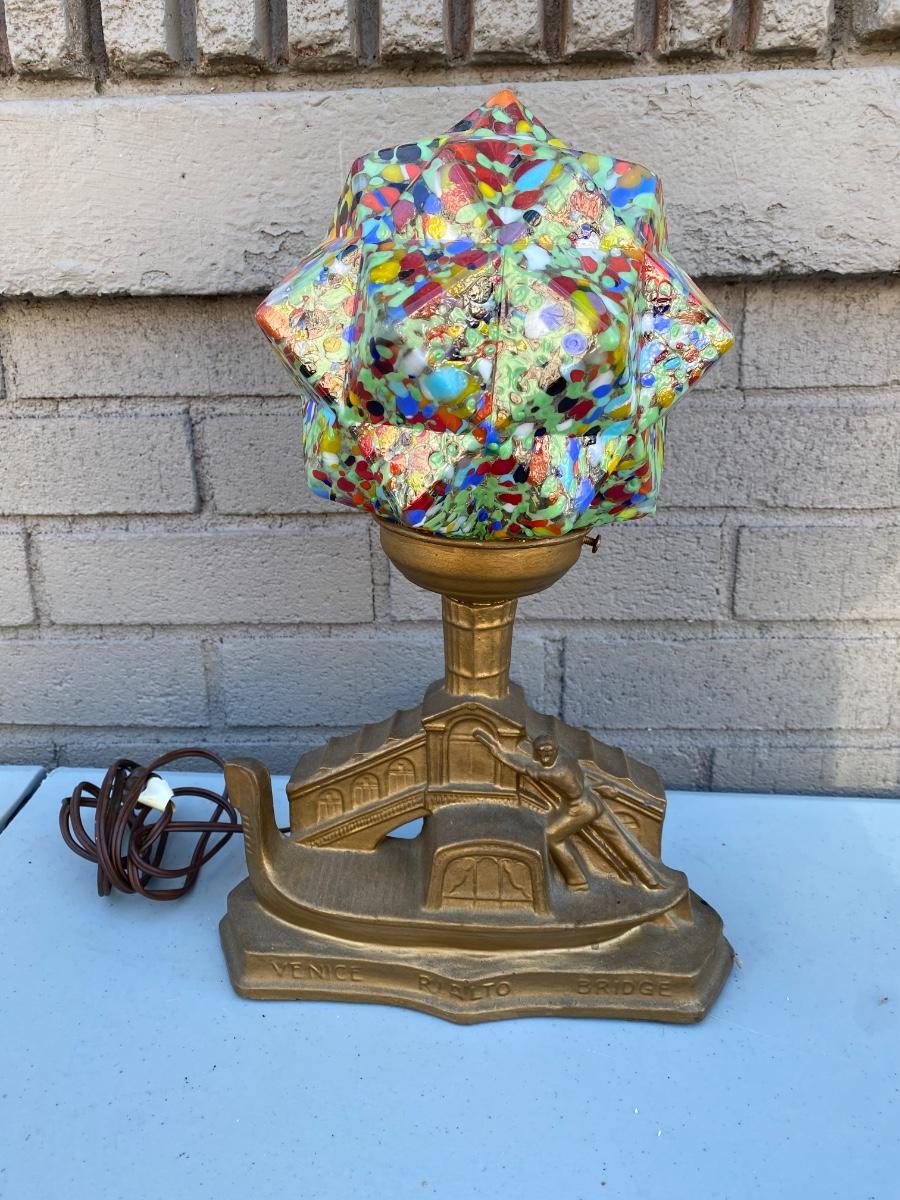 End of Day" Art Deco Glass Lamp, has VEnice Rialto Bridge base . Plug in with on off switch on base. Starburst multi colored glass glove. Beautiful lamp in excellent condition.