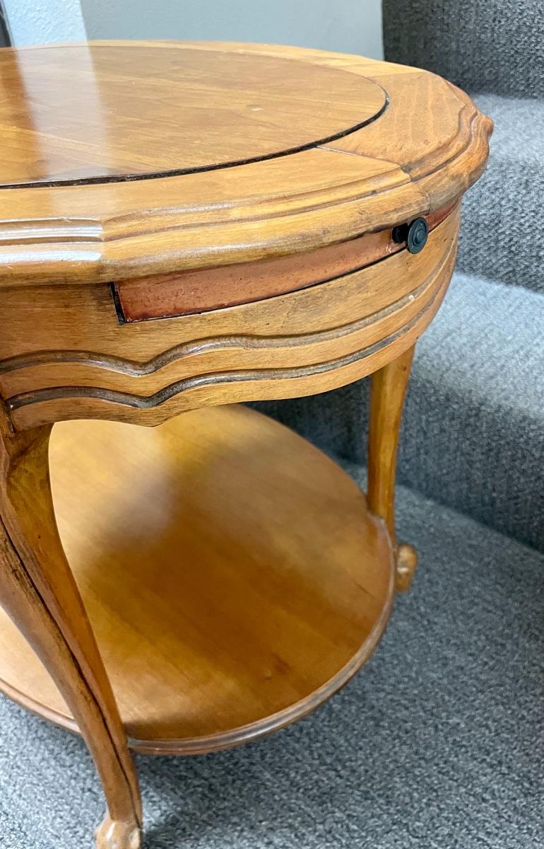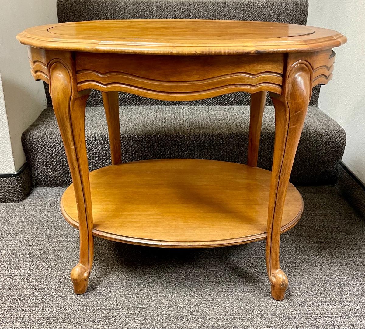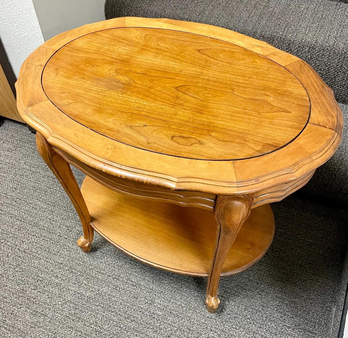 Wood oval end table with pull-out shelf. Approx 21” tall, 27” x 20” for table top.
