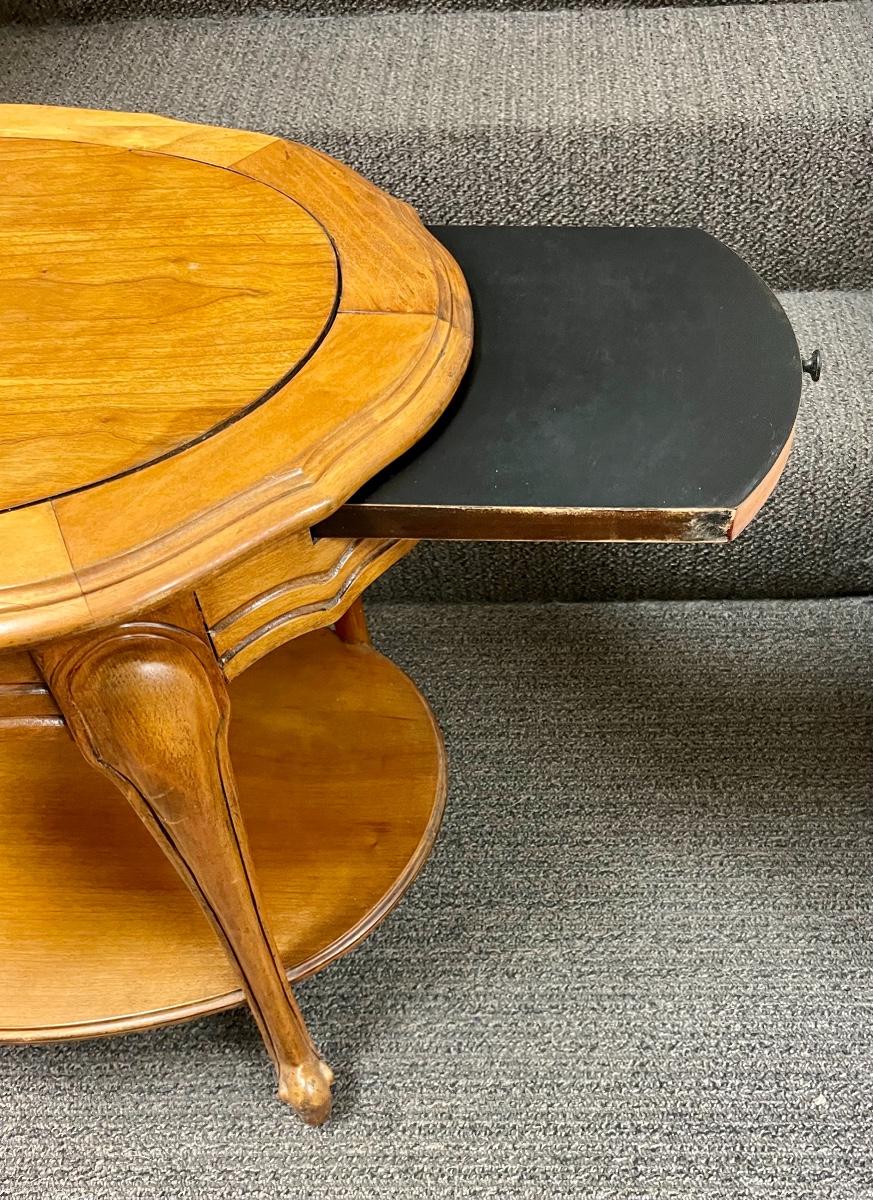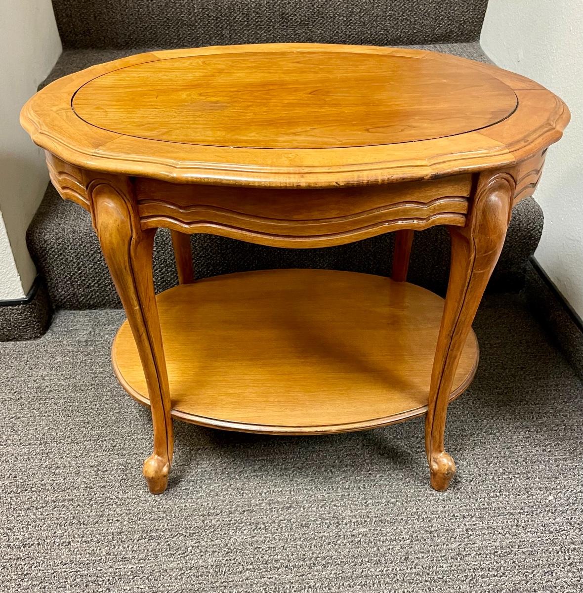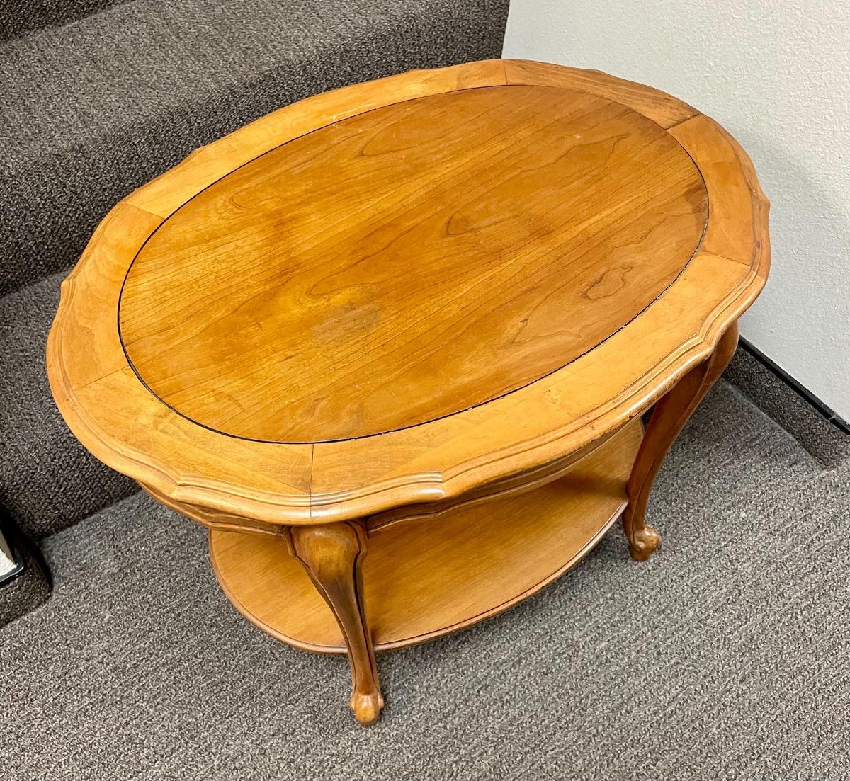 Wood oval end table with pull-out shelf. Approx 21” tall, 27” x 20” for table top.