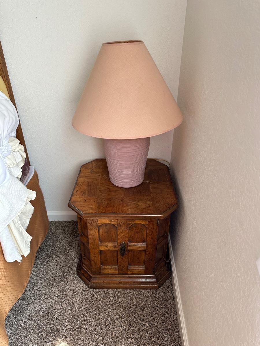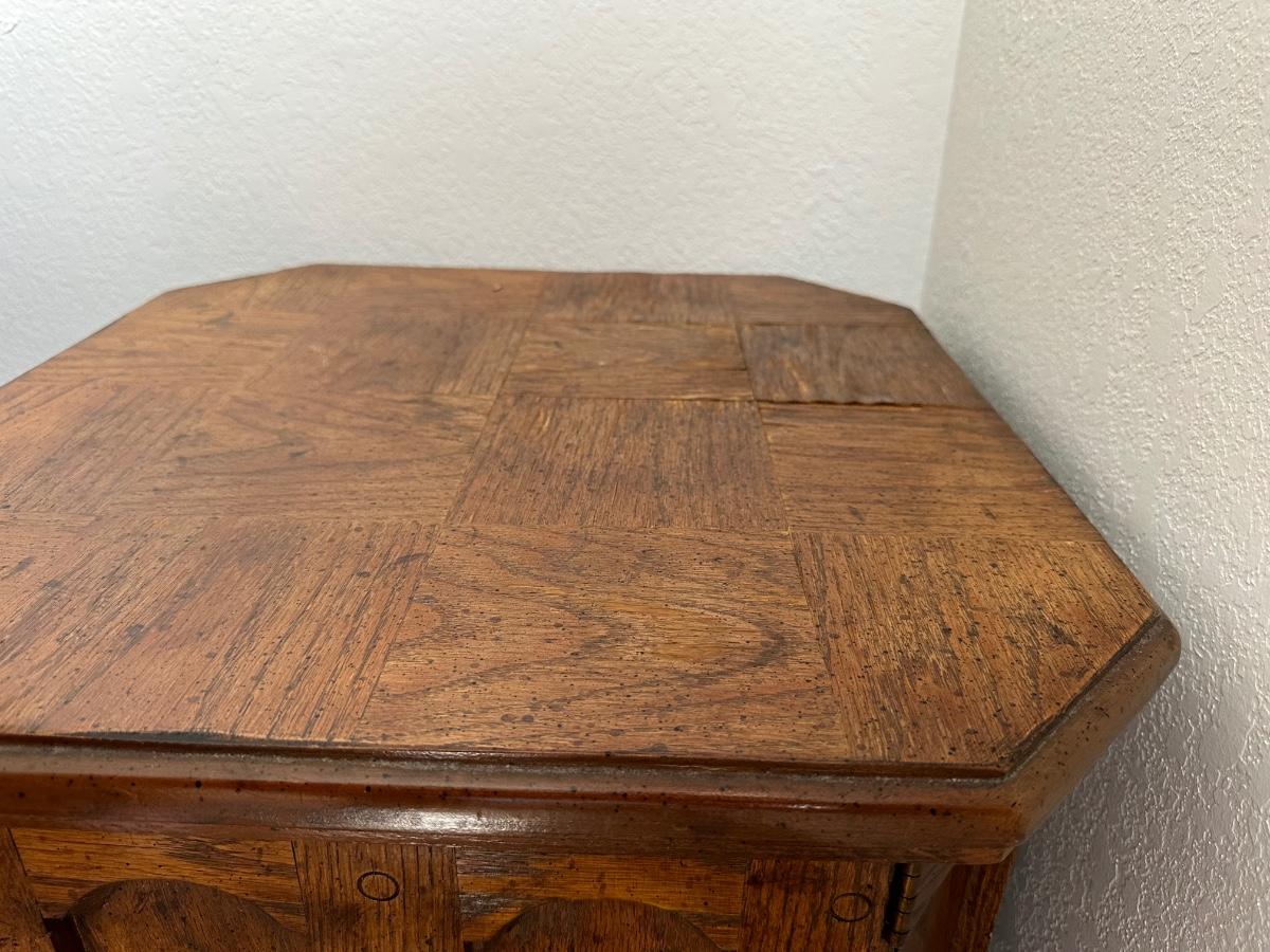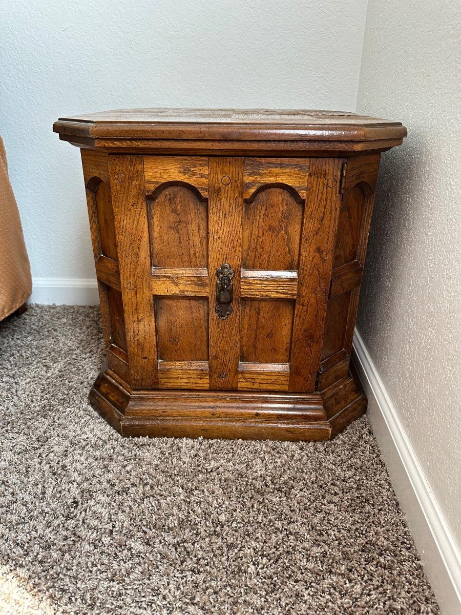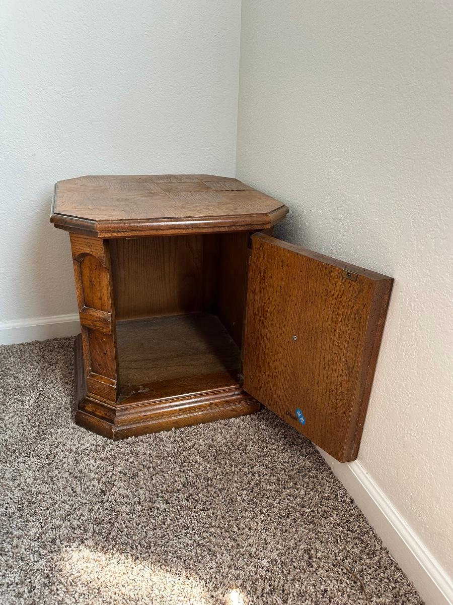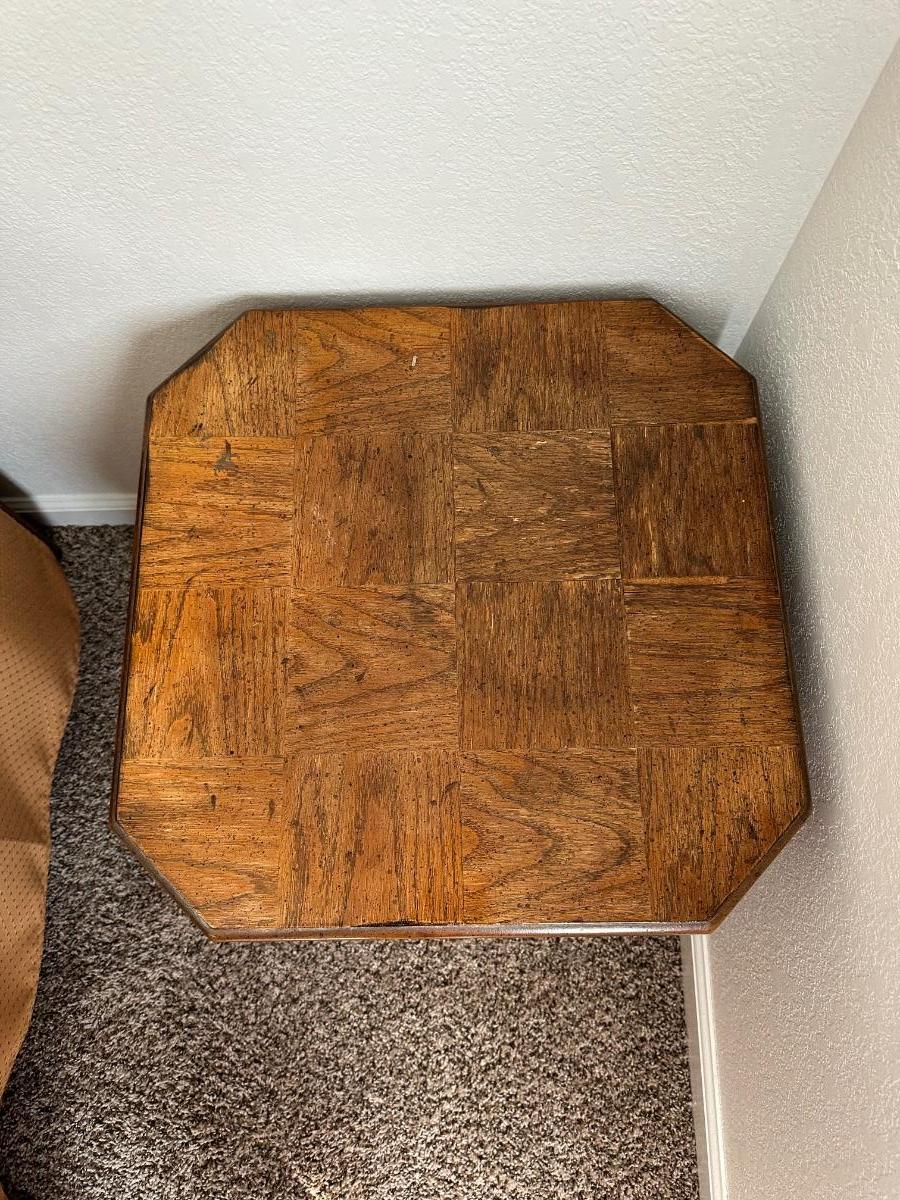 End table measures 20”H x 19-3/4” x 19-3/4” there is some damage to the top