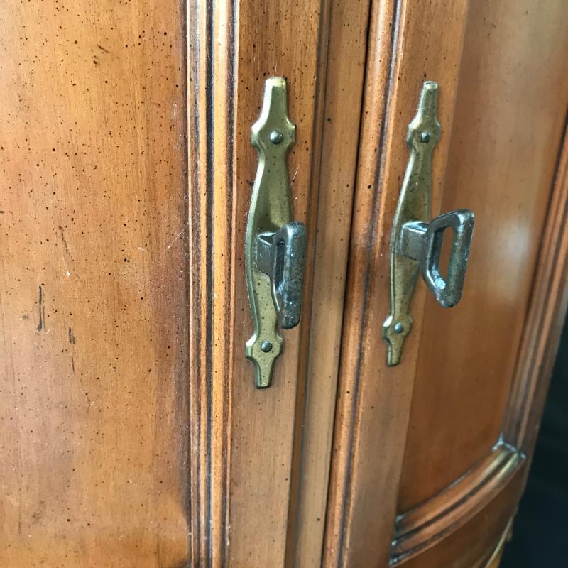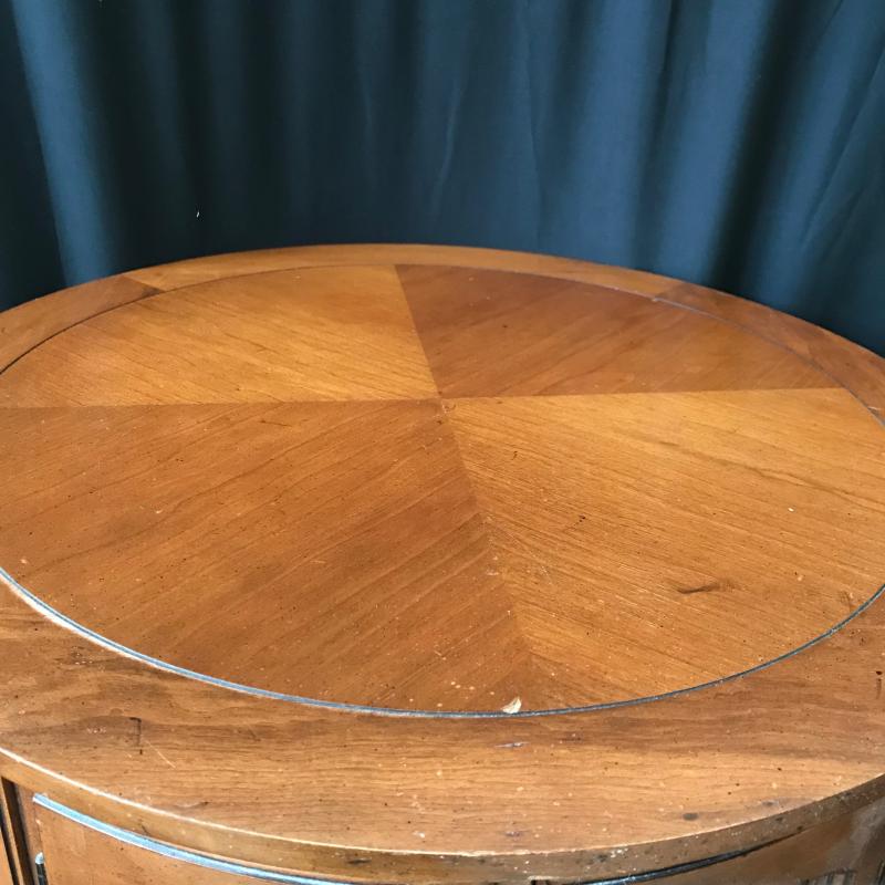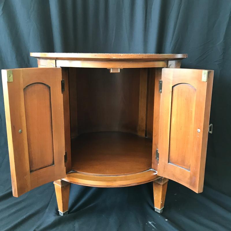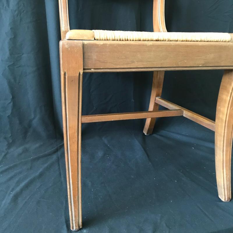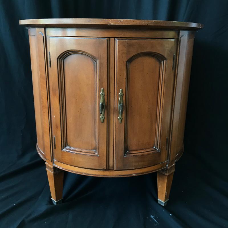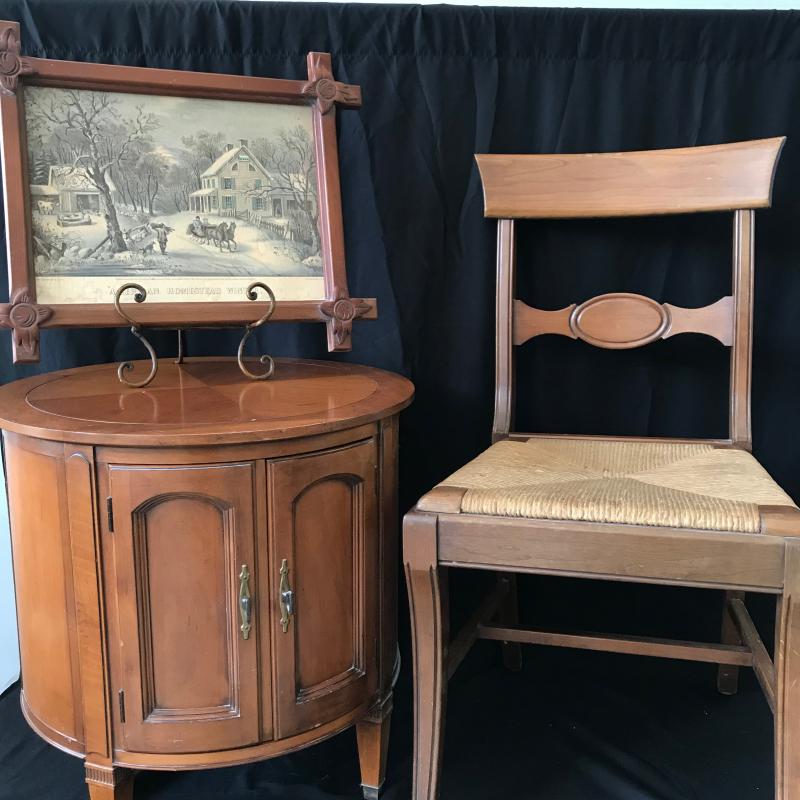 Lot contains round end table/cabinet (approx. 21.5” tall x 22” in diameter), rattan bottom chair (approx. 18” x 17.5” x 34.5”) and framed homestead print (approx. 21.5” x 17.5”). No shipping available. Local pickup only in Hendersonville, NC.