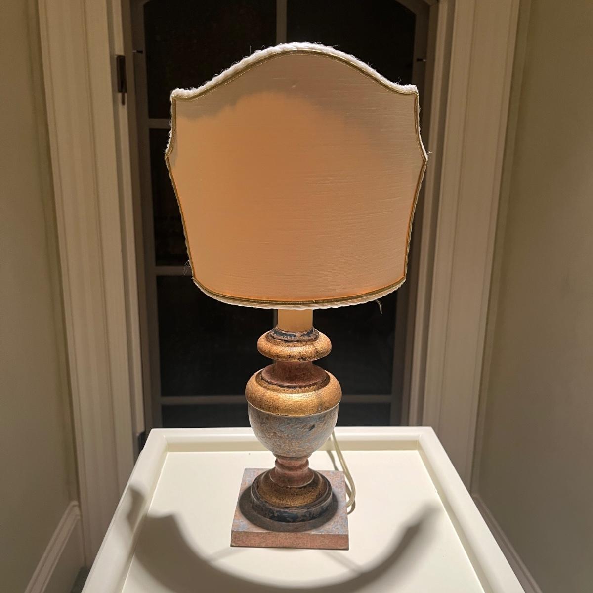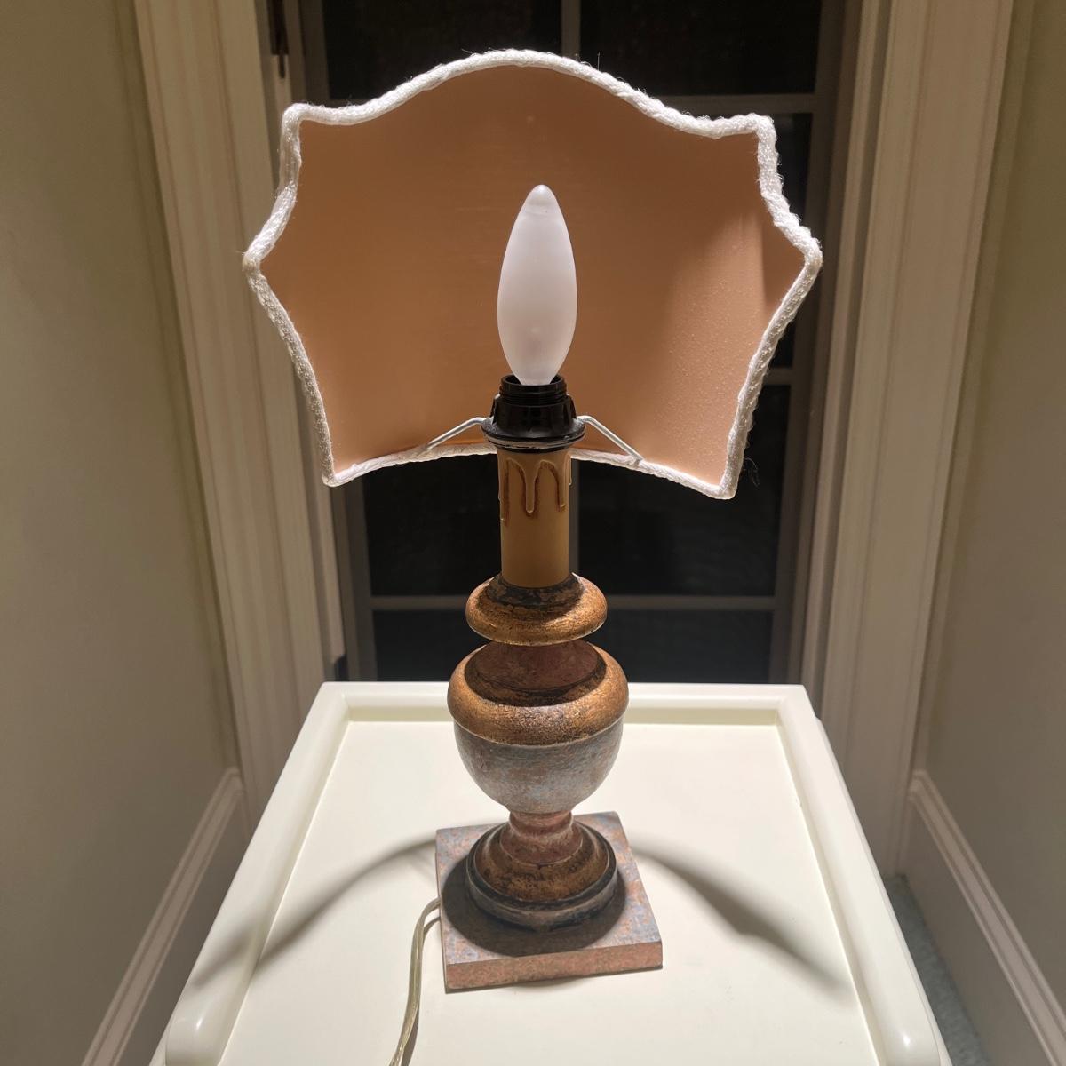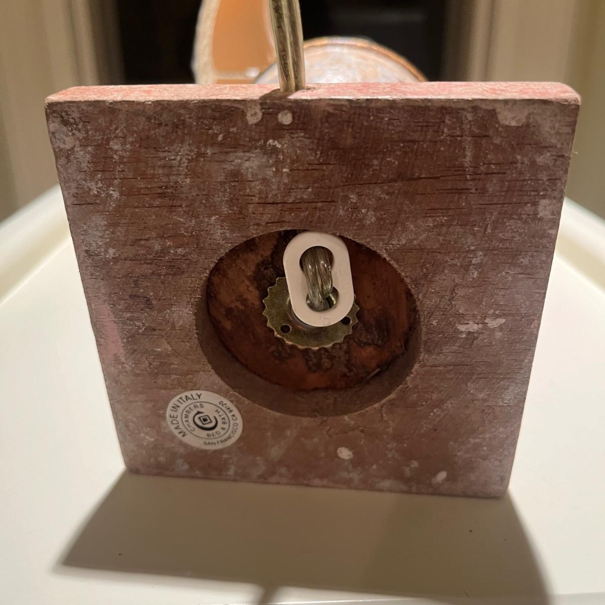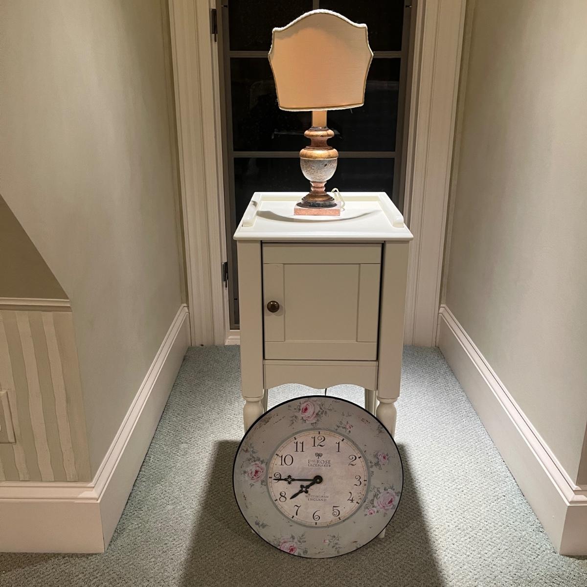 Lot includes a white end table that is made from MDF, fiber board clock and a wooden table lamp made in Italy with a Ventola style shade and an on/off switch. Lamp powered on when plugged in. Table measures 13” x 13” x 24”H.
