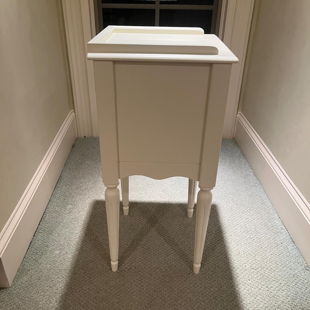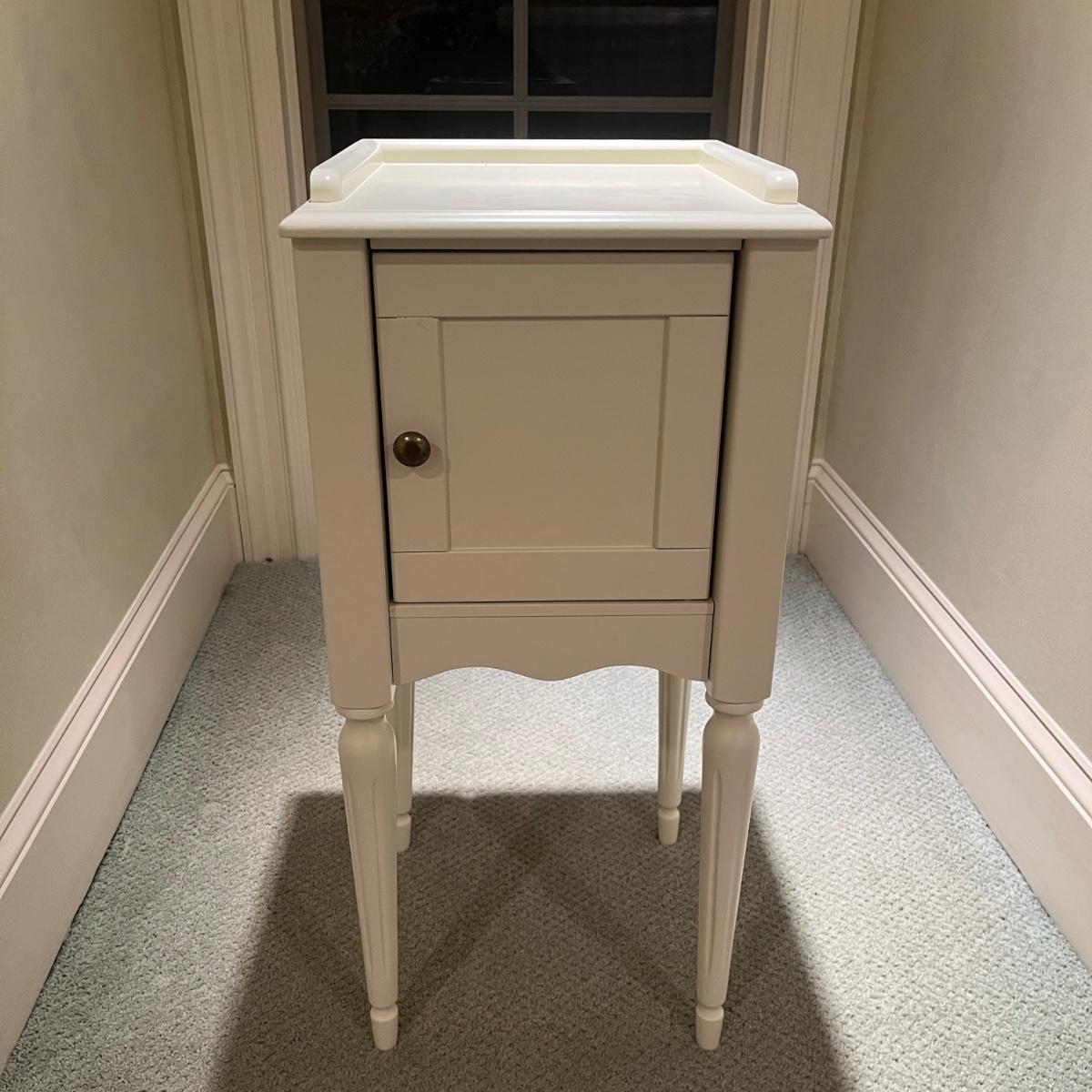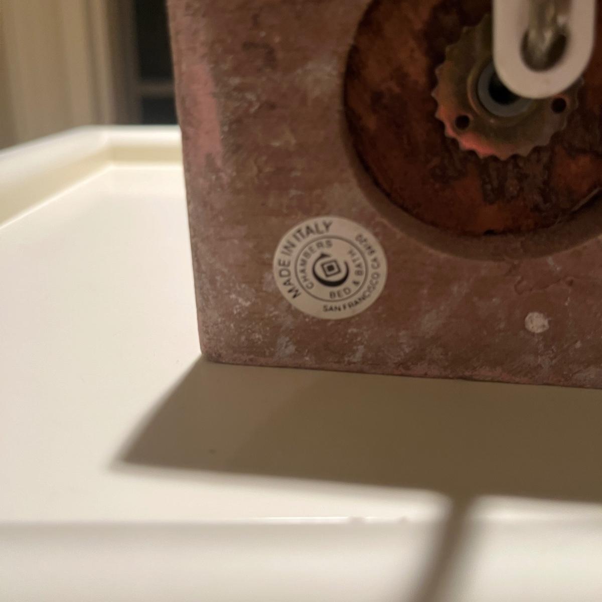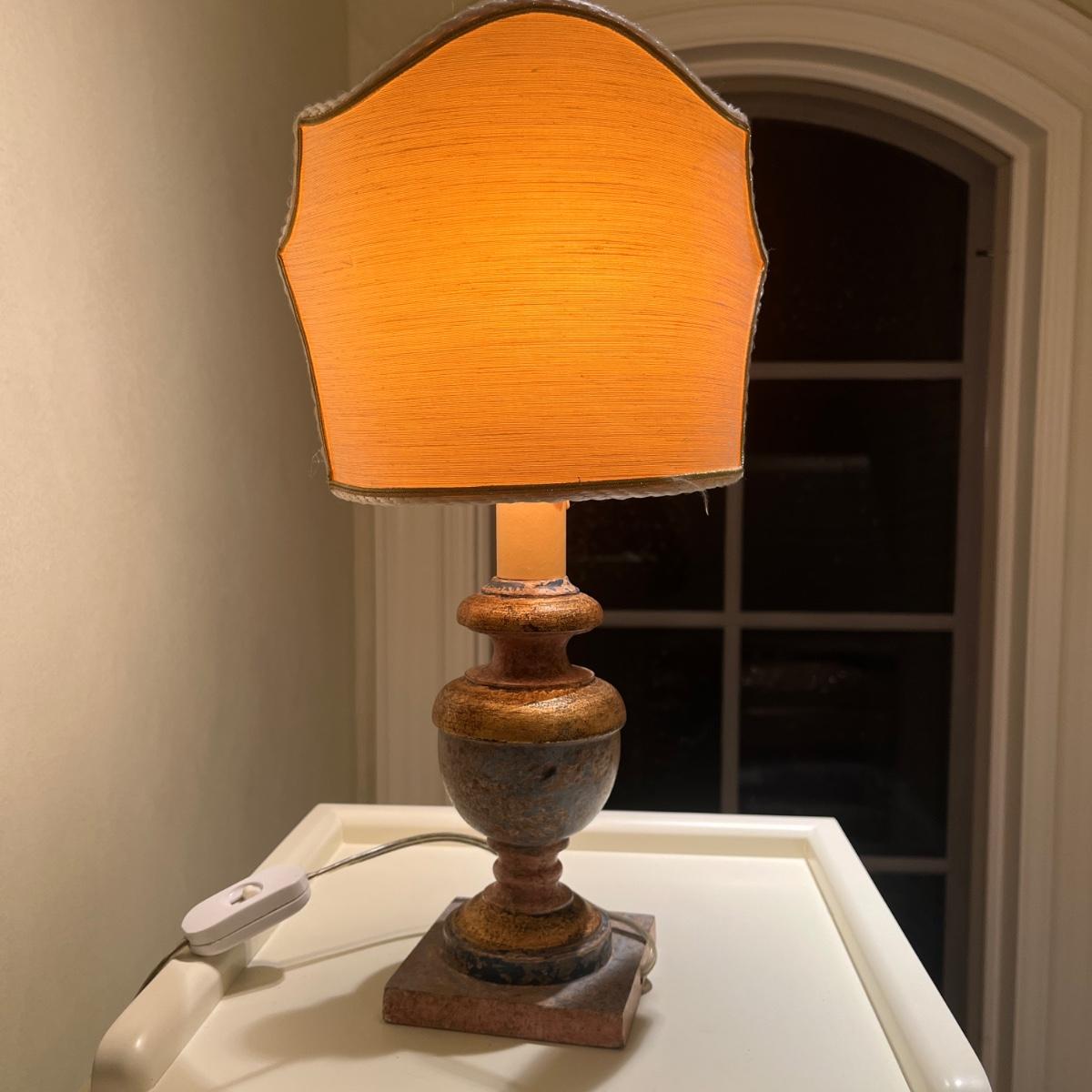 Lot includes a white end table that is made from MDF, fiber board clock and a wooden table lamp made in Italy with a Ventola style shade and an on/off switch. Lamp powered on when plugged in. Table measures 13” x 13” x 24”H.