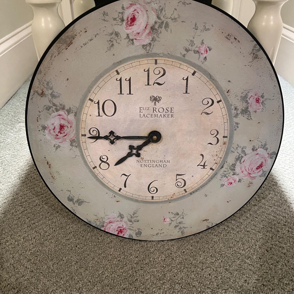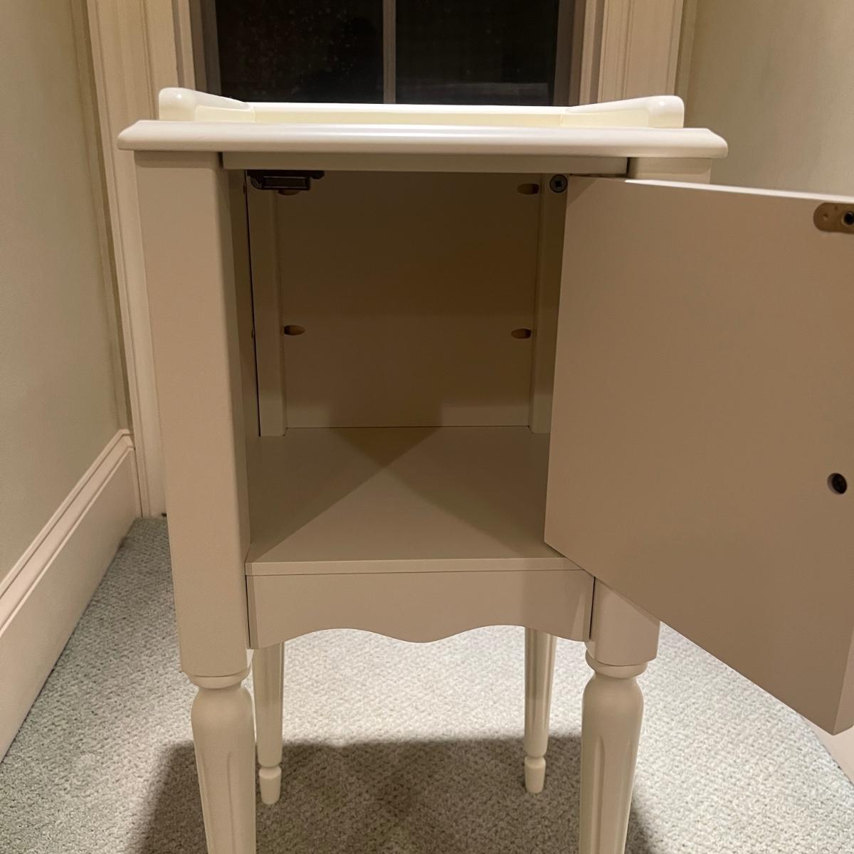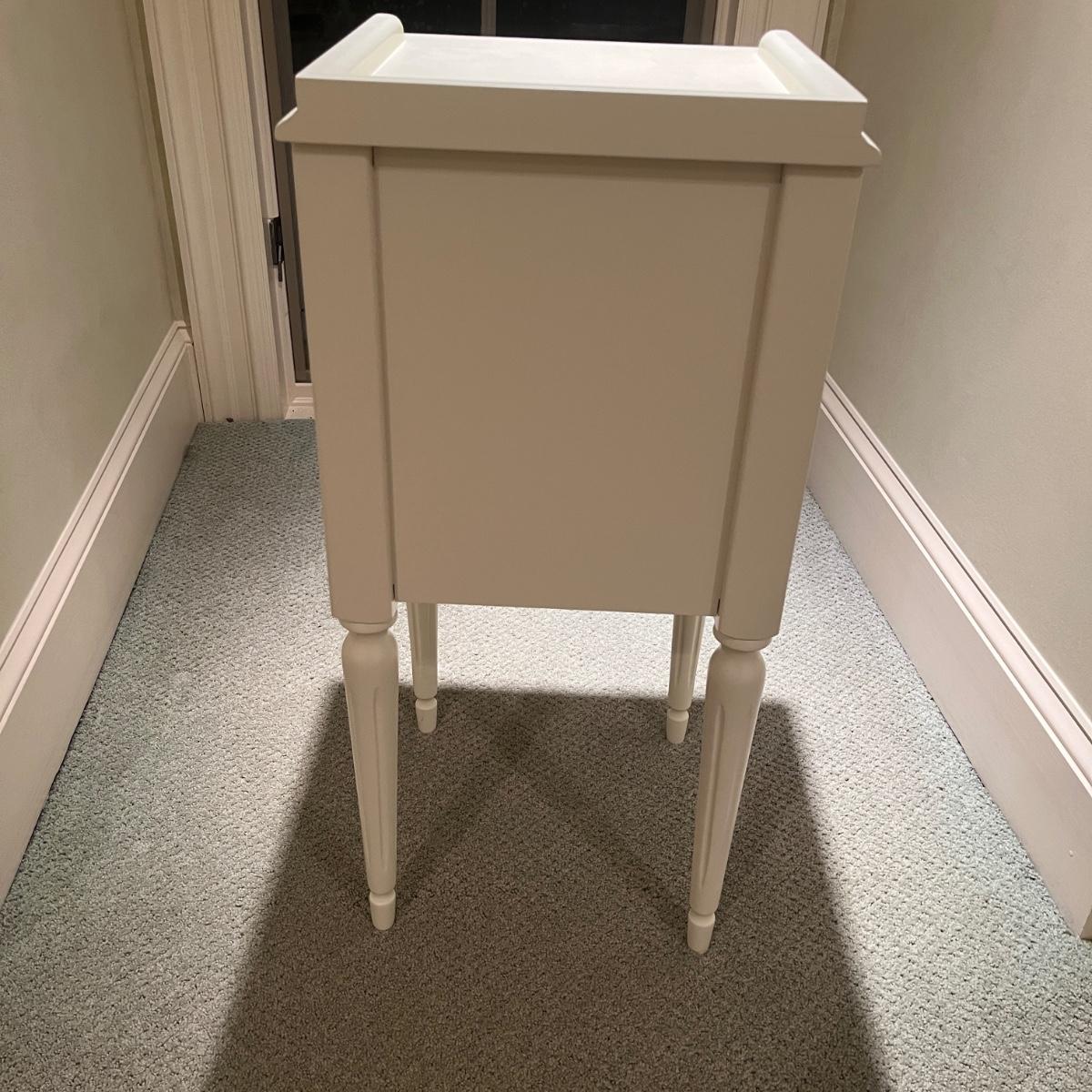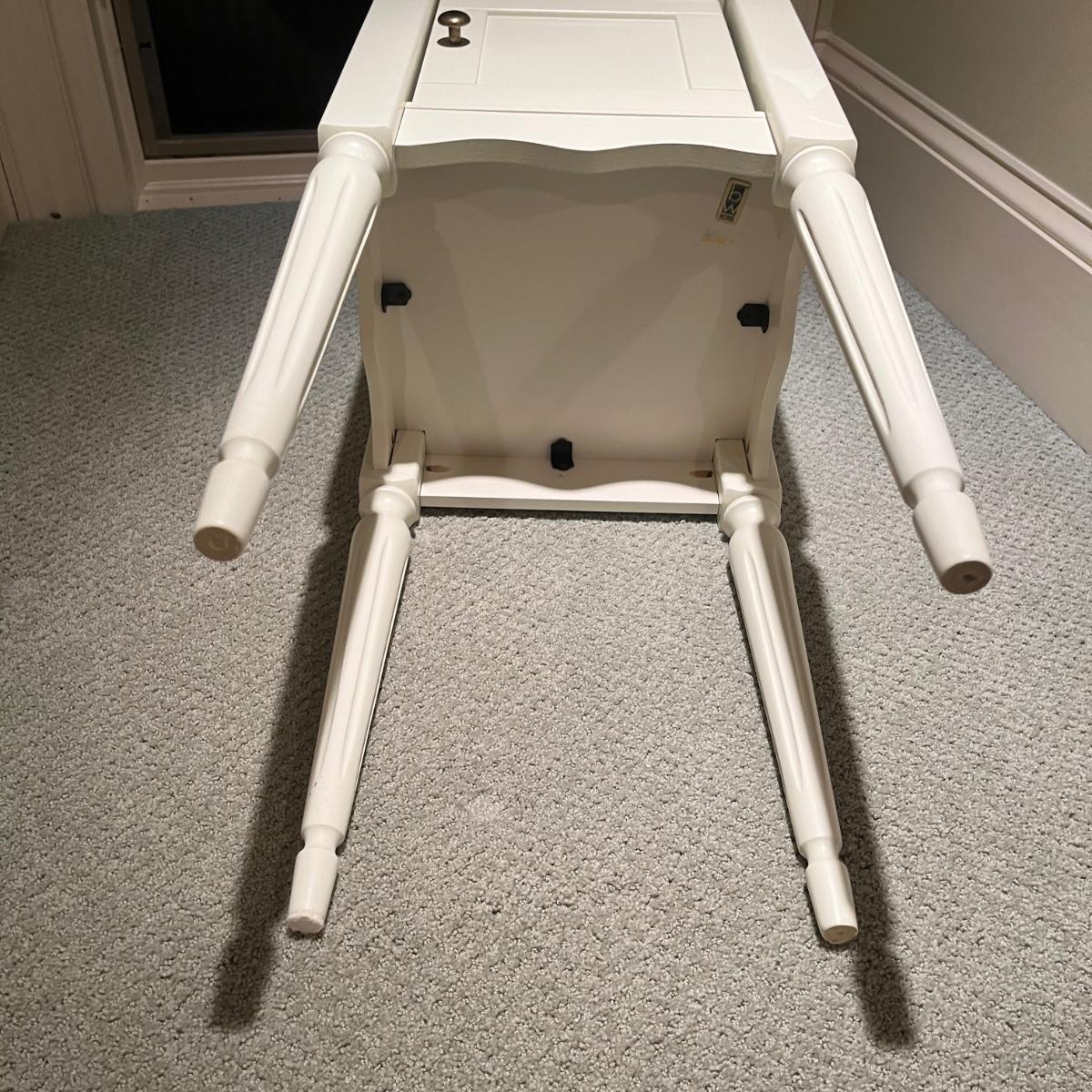 Lot includes a white end table that is made from MDF, fiber board clock and a wooden table lamp made in Italy with a Ventola style shade and an on/off switch. Lamp powered on when plugged in. Table measures 13” x 13” x 24”H.
