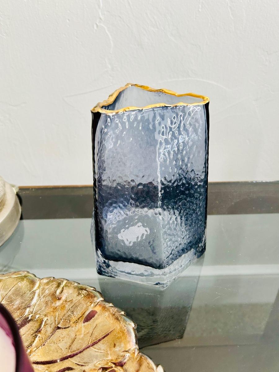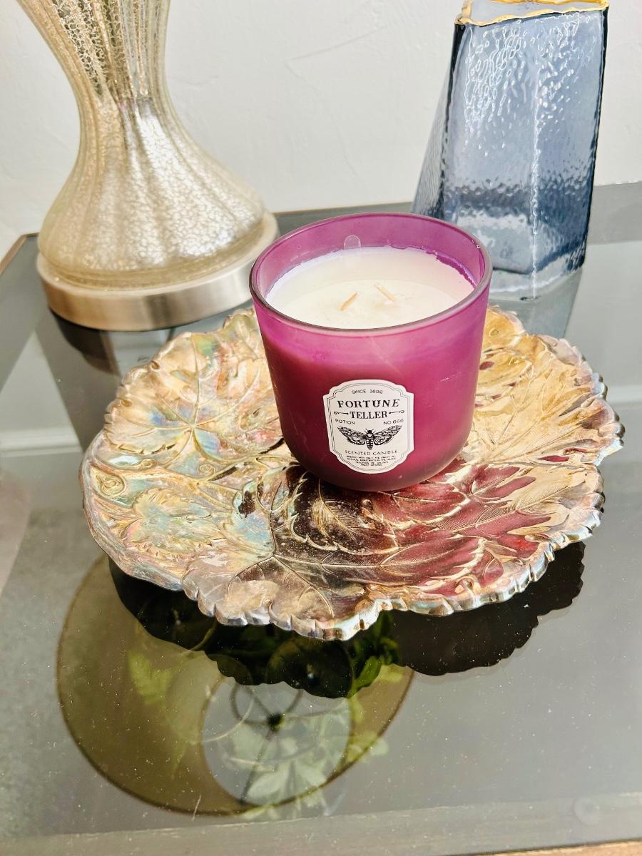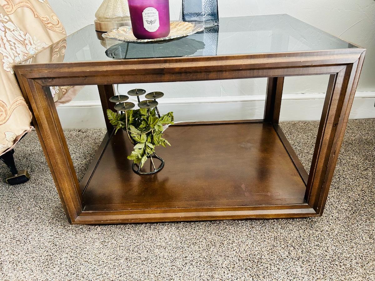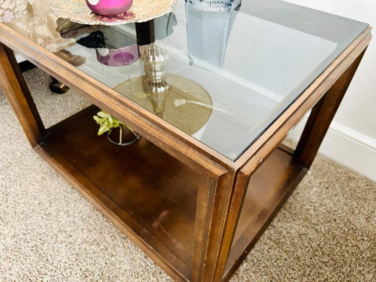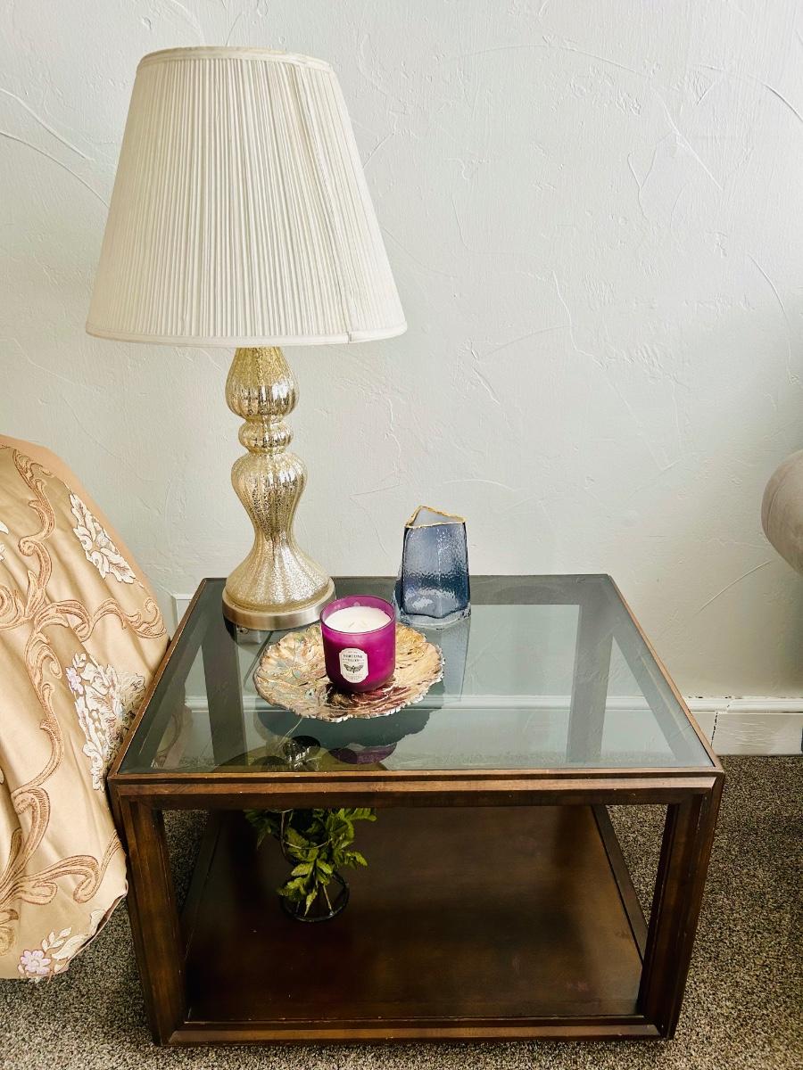 Glass & Wood End table lot - with Lamp, candle & decor