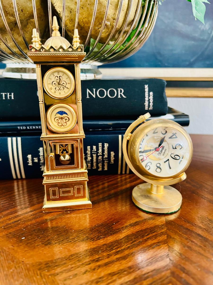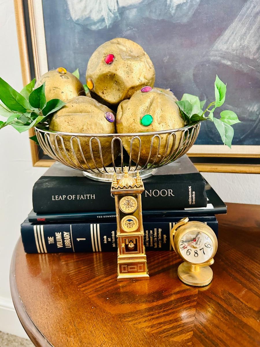 End table lot w/ Cane & Metal chair., clocks, art, and decor