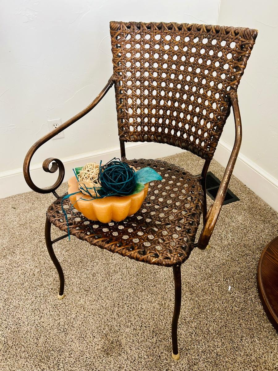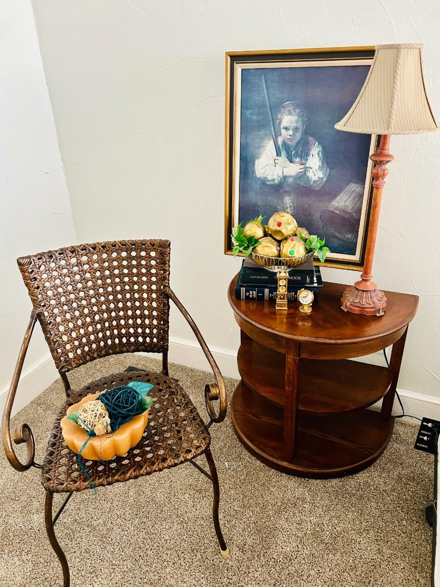 End table lot w/ Cane & Metal chair., clocks, art, and decor. Everything pictured.