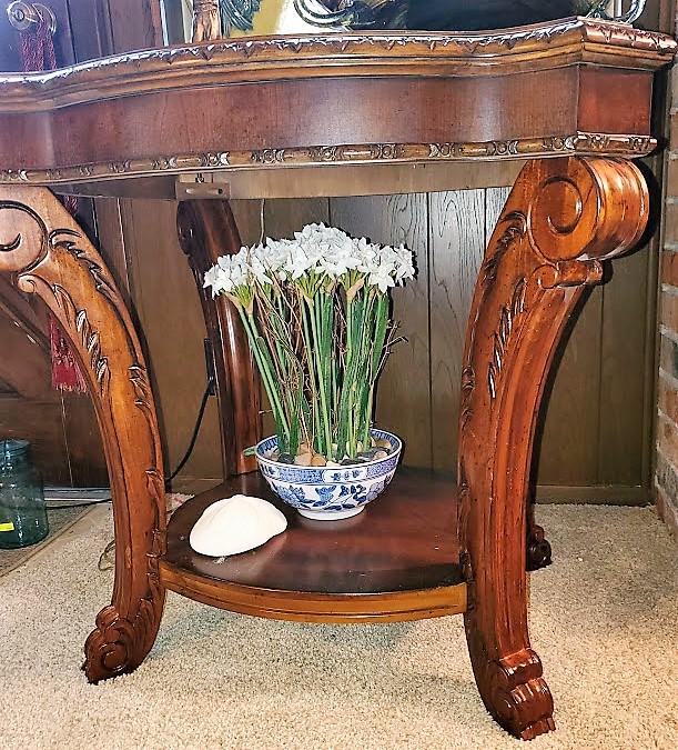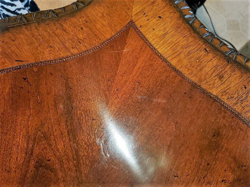 Medium tone, maple wood. Etched design on top, spindle legs. 28.5 T x 30.5 L x 18" W