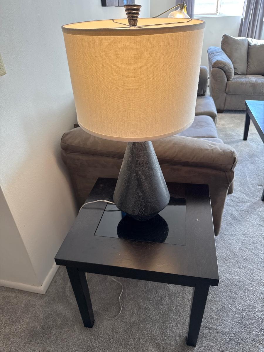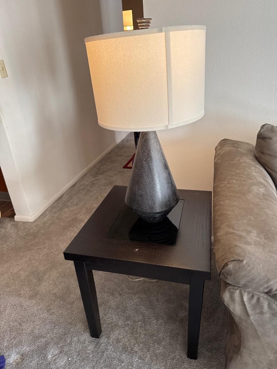 End table with lamp. Dimensions for the end table are 22 inches tall by 22 inches wide by 24 inches deep. The dimension for the lamp is 29 inches tall.