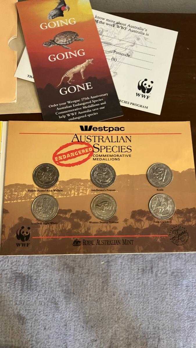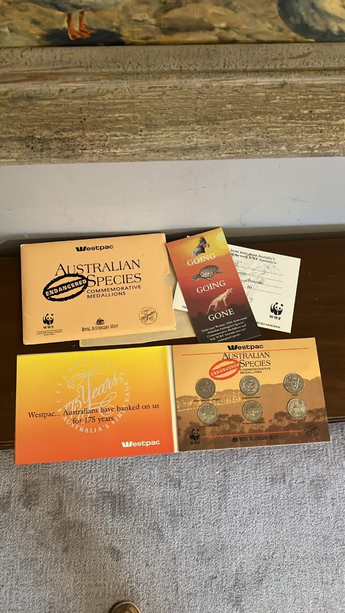 For sale is a complete set of six stunning commemorative medallions from the 1992 Westpac "Australian Endangered Species" series, struck by the prestigious Royal Australian Mint in collaboration with the World Wildlife Fund (WWF). Issued to celebrate the 175th anniversary of Westpac Banking Corporation—Australia's oldest bank, originally founded as the Bank of New South Wales in 1817—these medallions highlight the urgent plight of six iconic endangered Australian species: the Western Swamp Tortoise, Palm Cockatoo, Yellow-footed Rock-wallaby, Koala, Southern Right Whale, and Dingo.