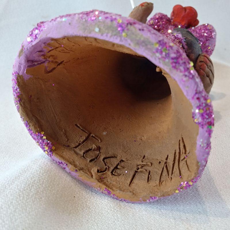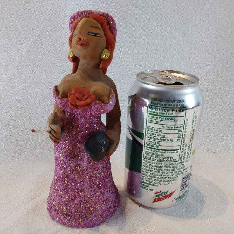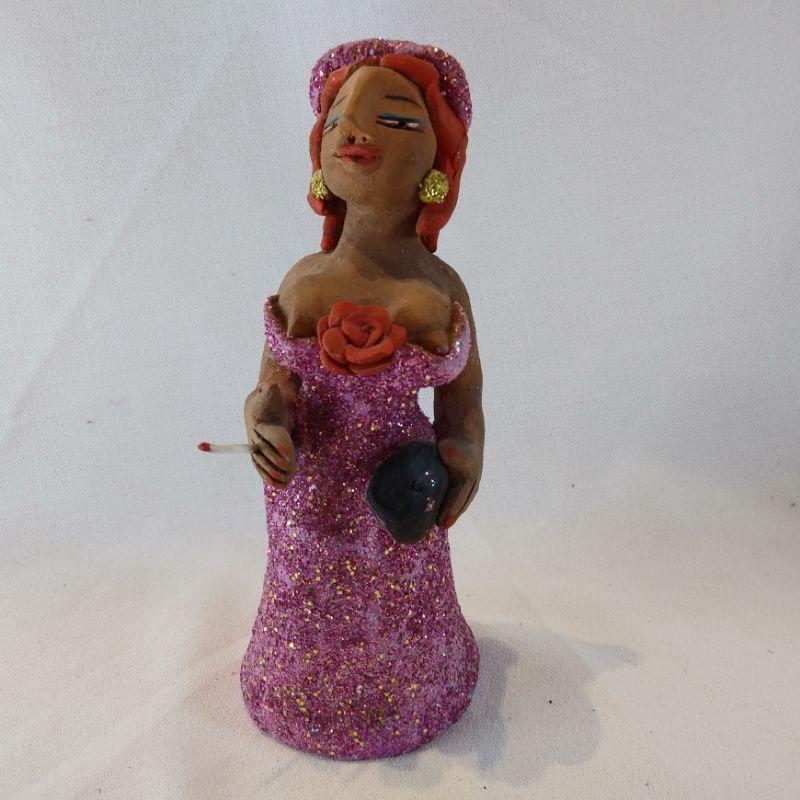 This amazing piece of authentic Josefina Aquilar is Hot! Ms. Aquilar is a Mexican folk artist from Ocotian de Morelas, Oaxaca. She was mentored by her mother Isaura Alcantara Diaz and her grandmother - born in 1945 and working with clay since she was 6 years old, Josefina has collectors and followers around the globe. This stunning work is 7=inches tall X 3-inches in diameter and appears to be in near perfect condition. Josefina is most noted for her Day of the Dead figurines but there is no question this sexy senorita is quite alive!!
