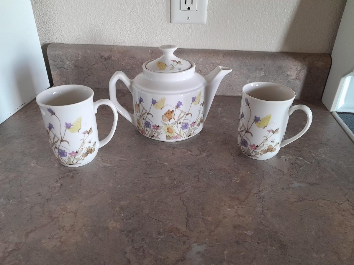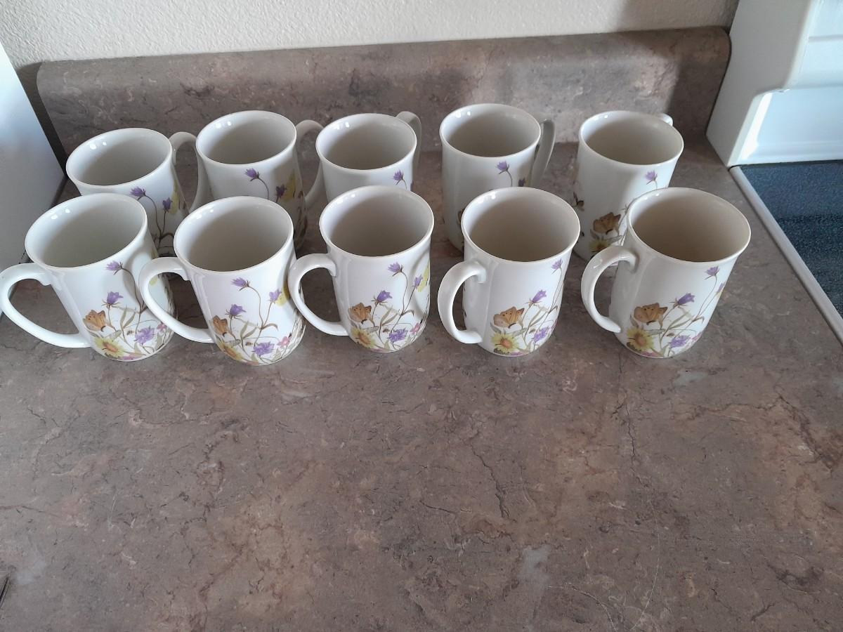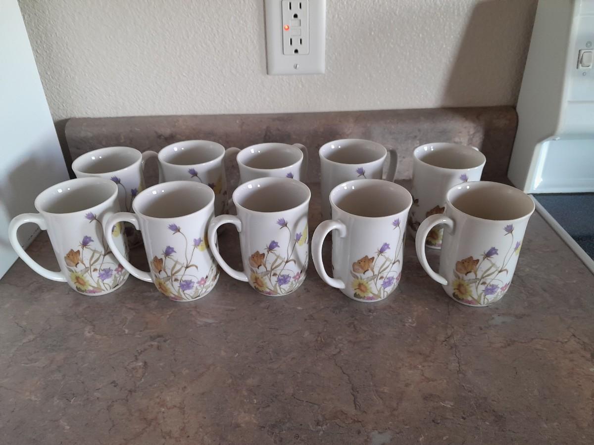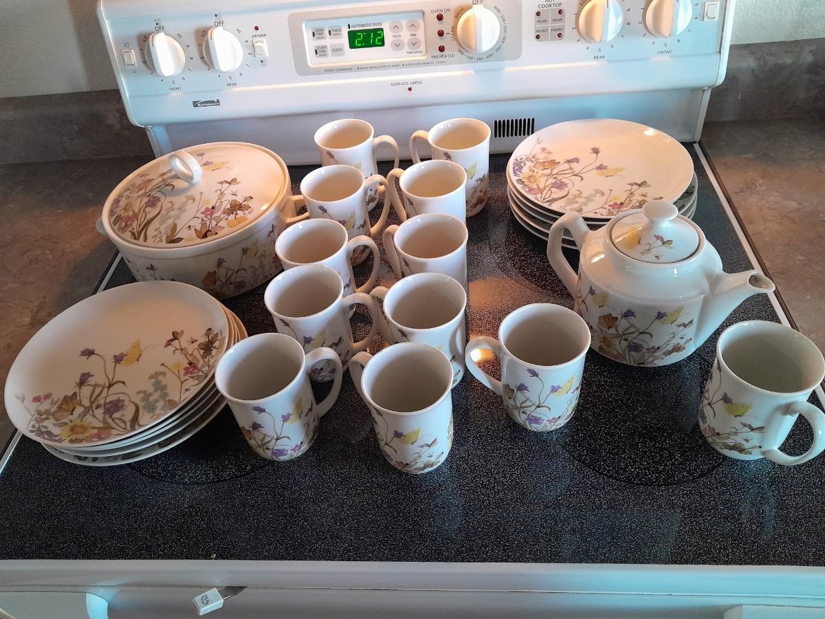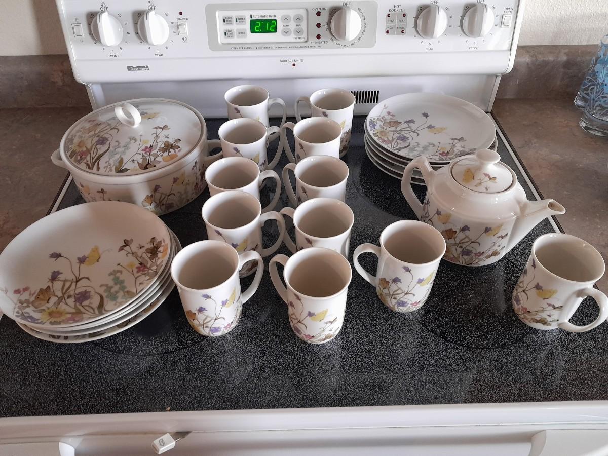 5 DINNER PLATES, 5 SALAD PLATES, CASSEROLE DISH, TEAPOT, 12 COFFEE MUGS