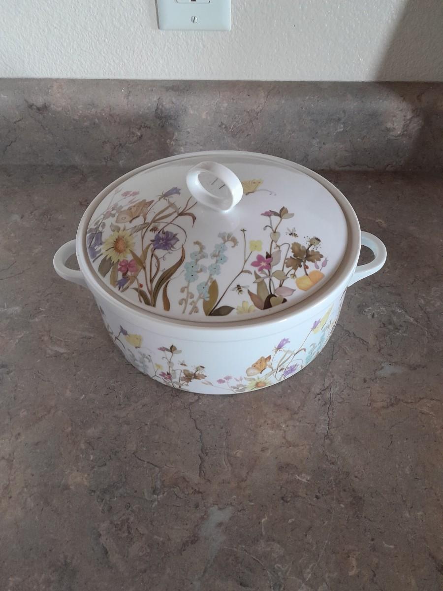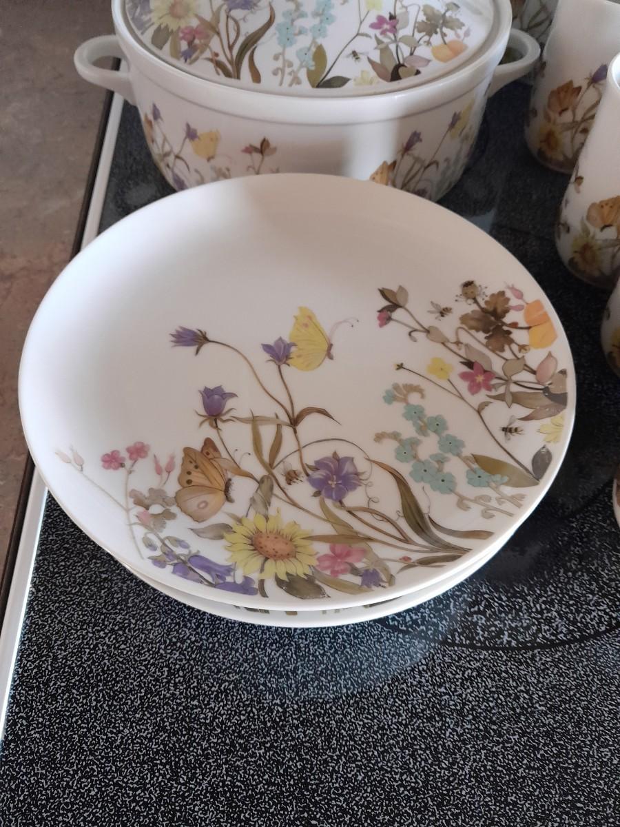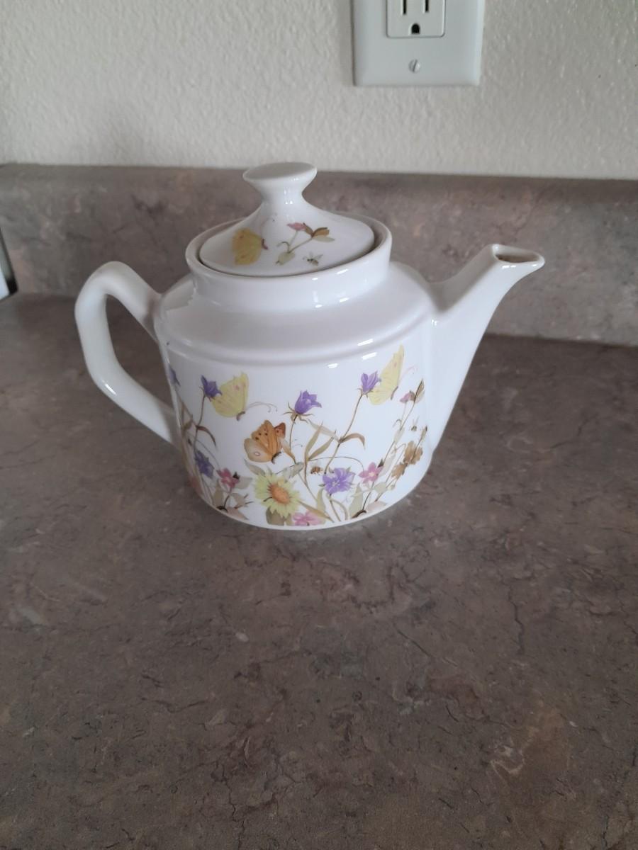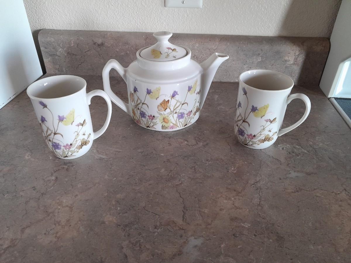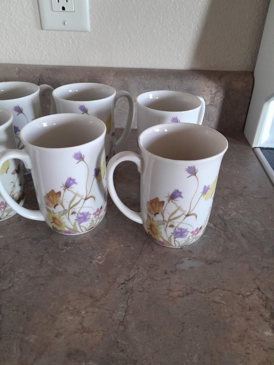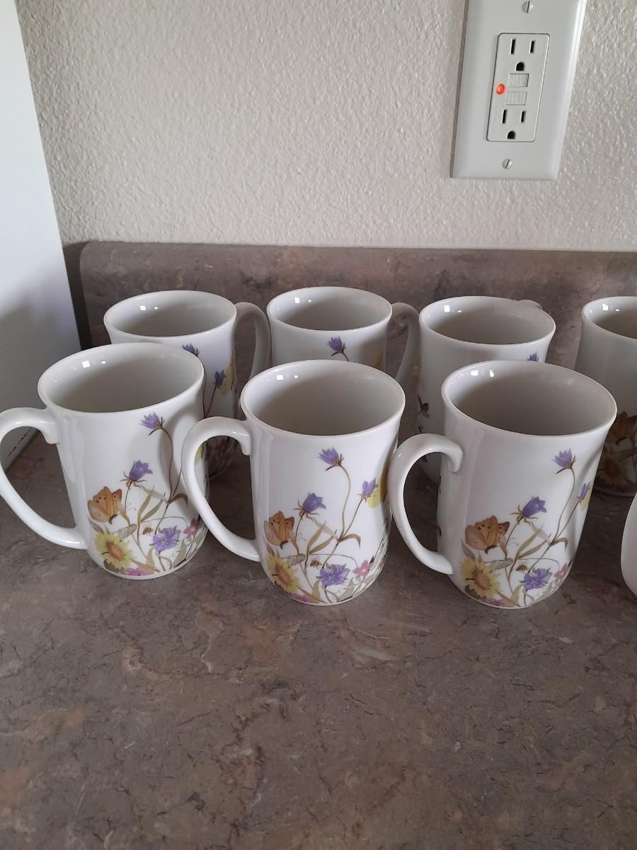 5 DINNER PLATES, 5 SALAD PLATES, CASSEROLE DISH, TEAPOT, 12 COFFEE MUGS