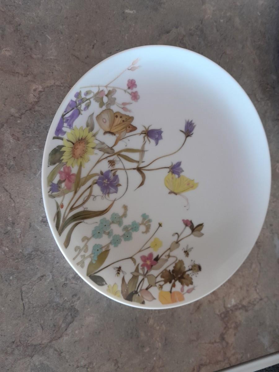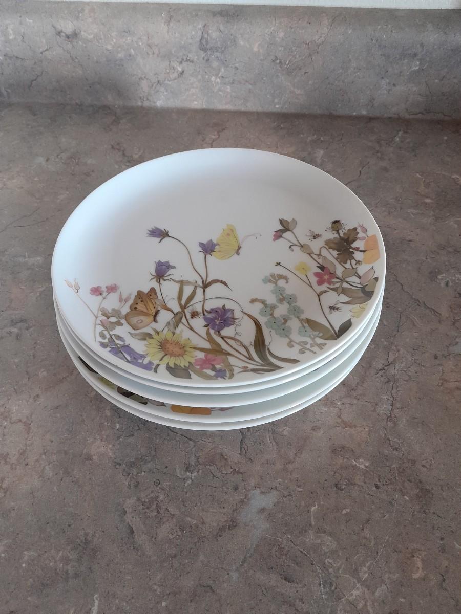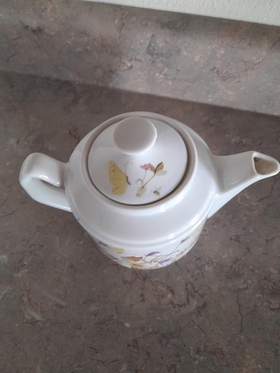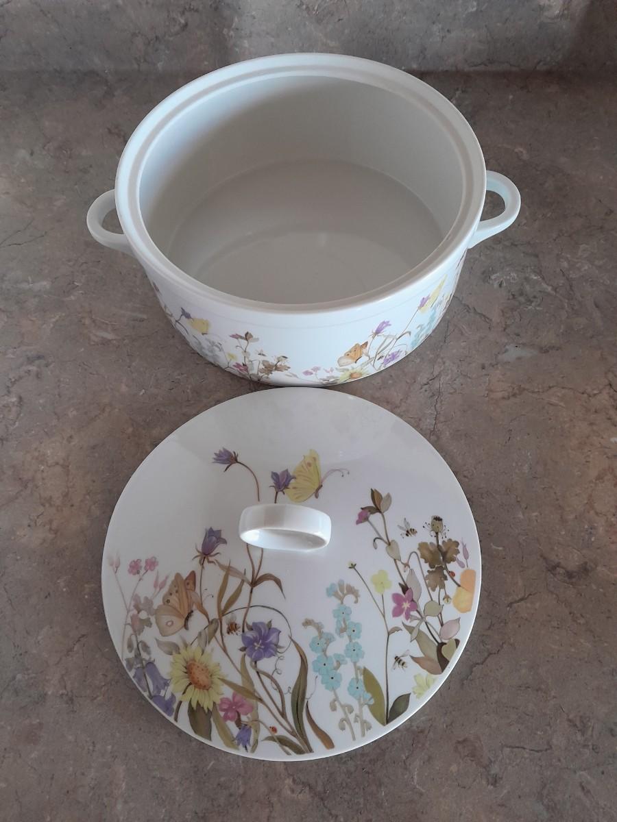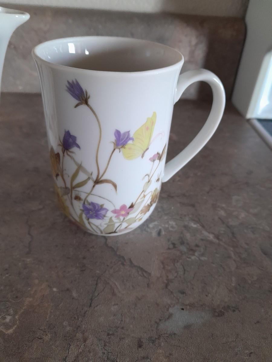 5 DINNER PLATES, 5 SALAD PLATES, CASSEROLE DISH, TEAPOT, 12 COFFEE MUGS