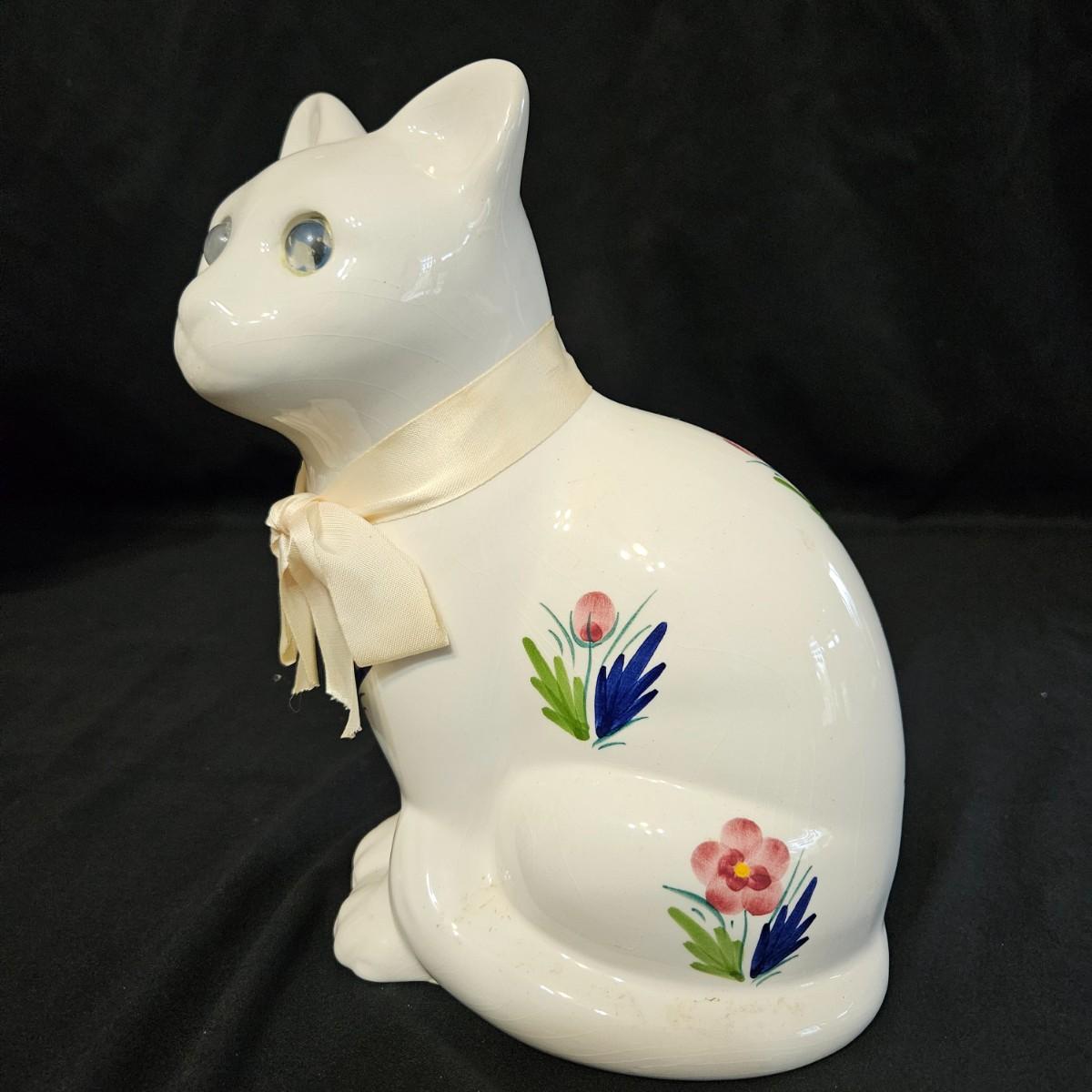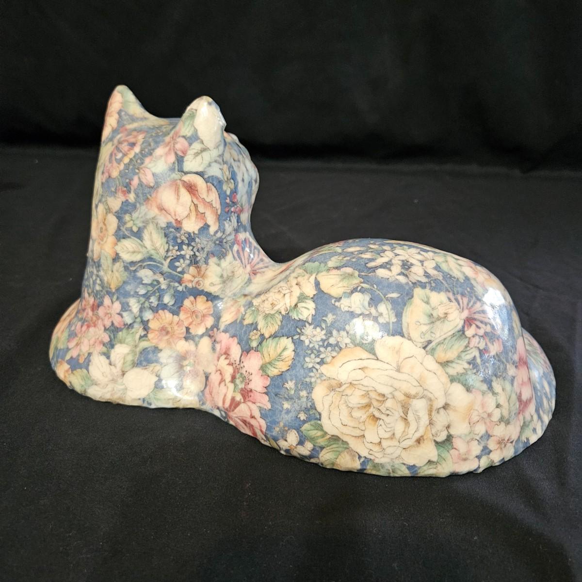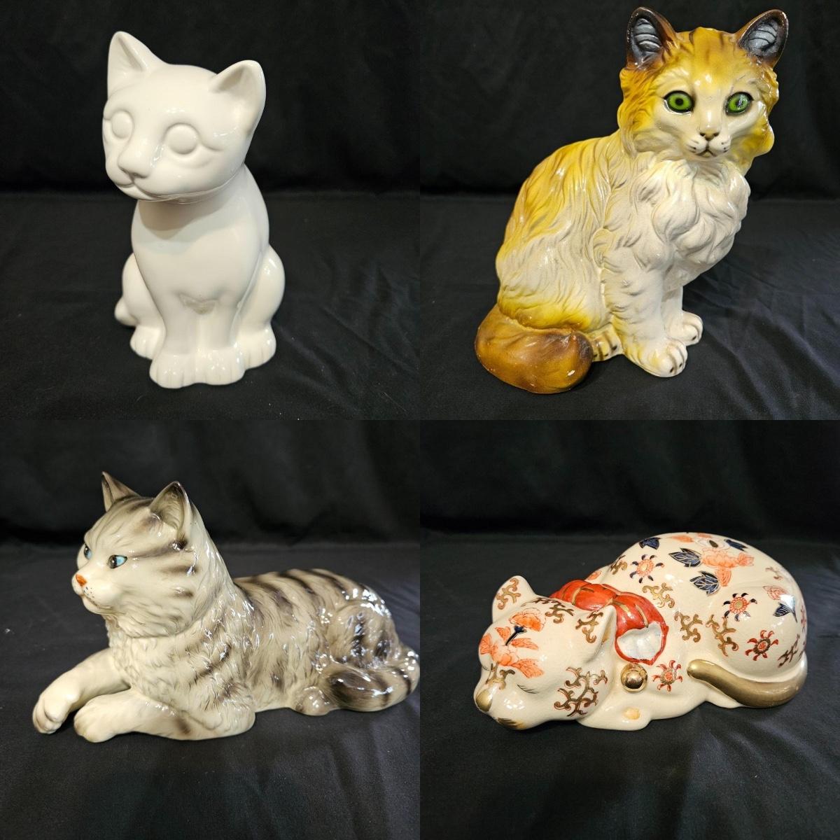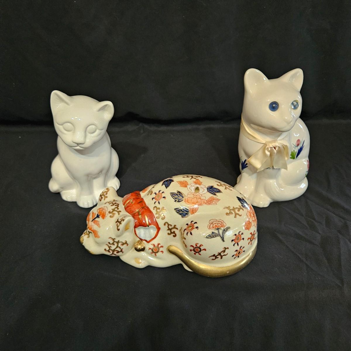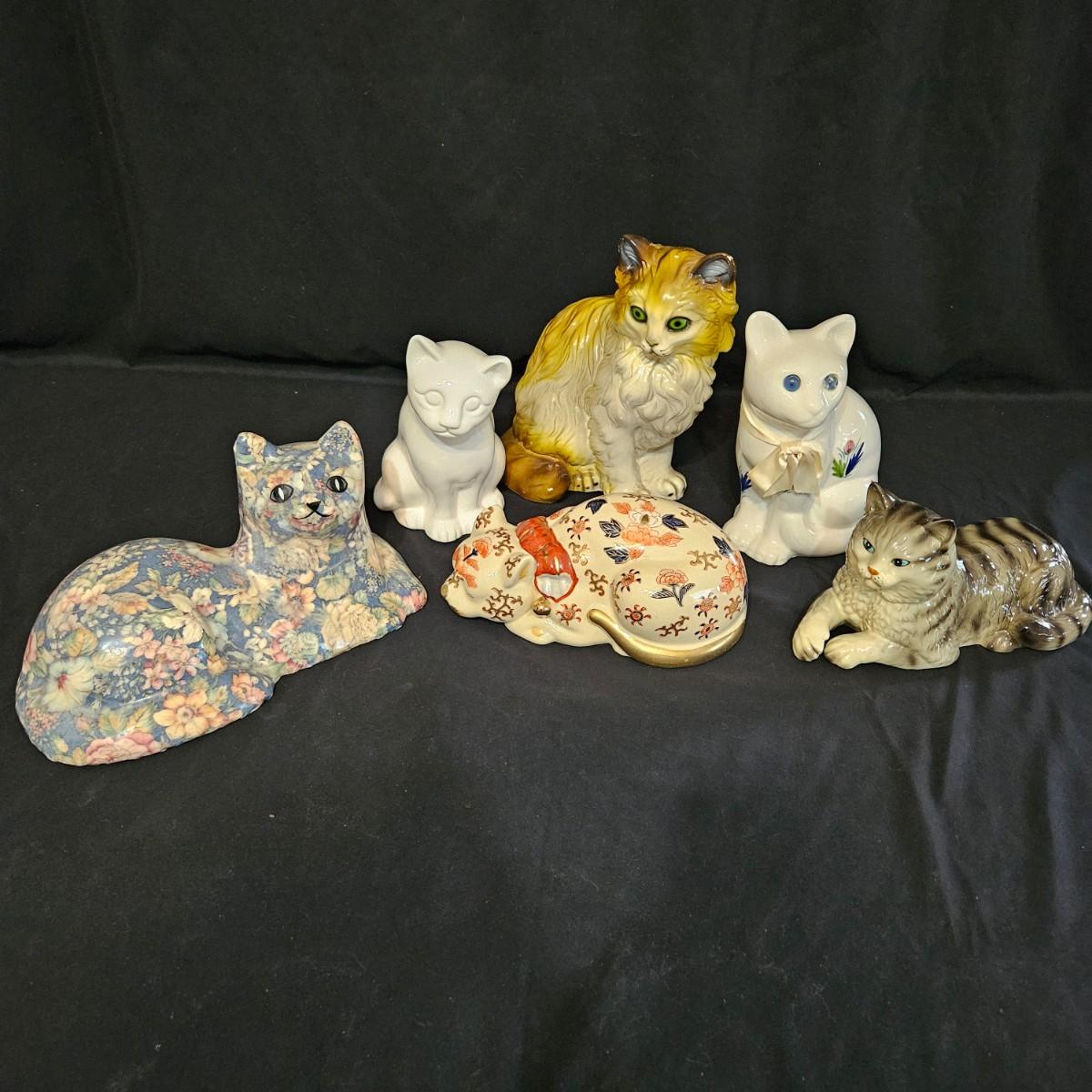 An assortment of ceramic cats from a variety of manufacturers. The solid white cat is an Enesco, the grey cat and Asian themed cat are made by Sadek. The floral print cat measures approximately 11" x 6.5" x 6"H. Shipping available