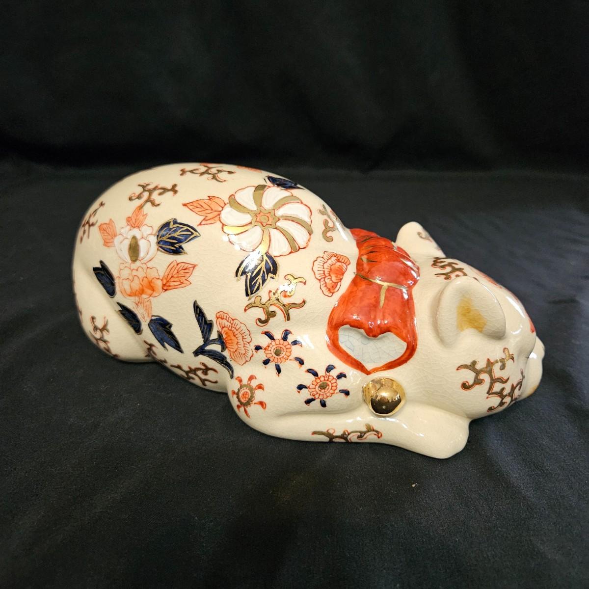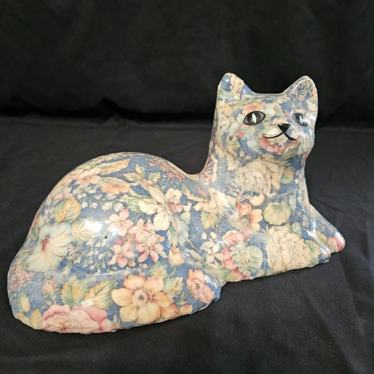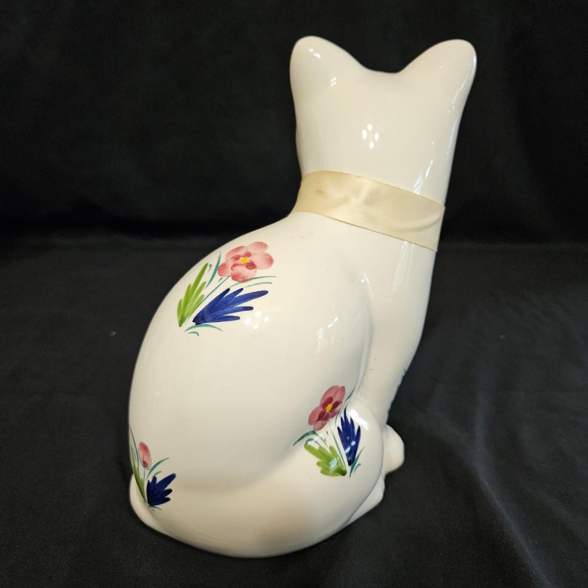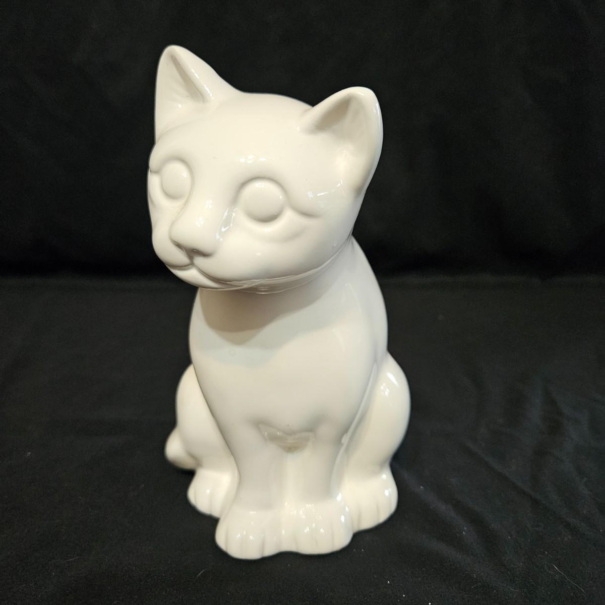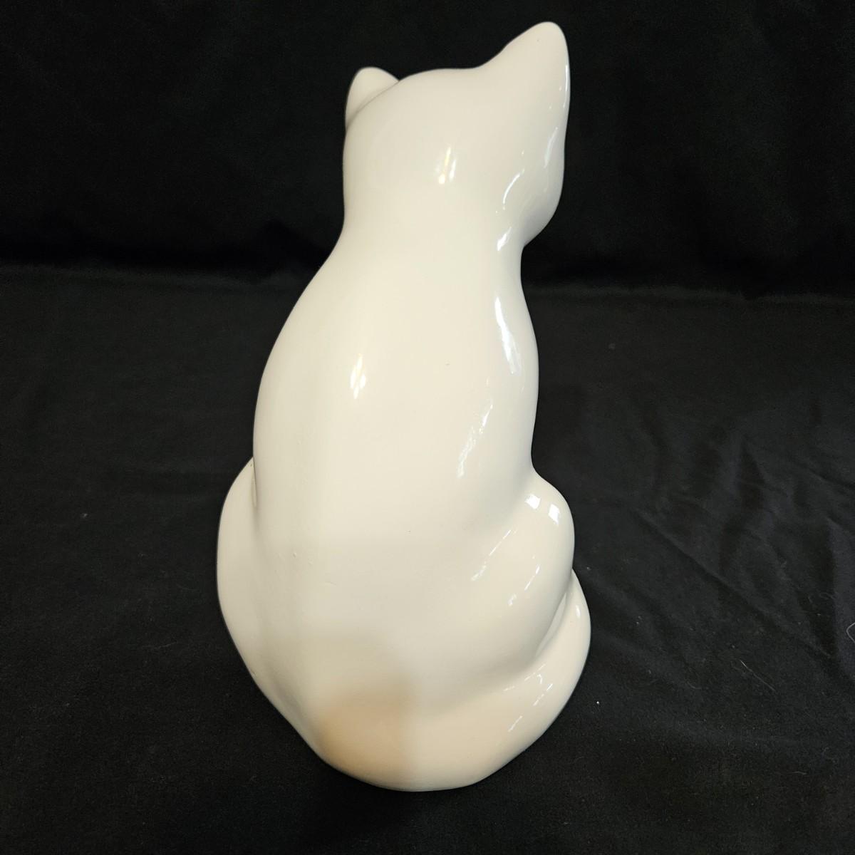 An assortment of ceramic cats from a variety of manufacturers. The solid white cat is an Enesco, the grey cat and Asian themed cat are made by Sadek. The floral print cat measures approximately 11" x 6.5" x 6"H. Shipping available