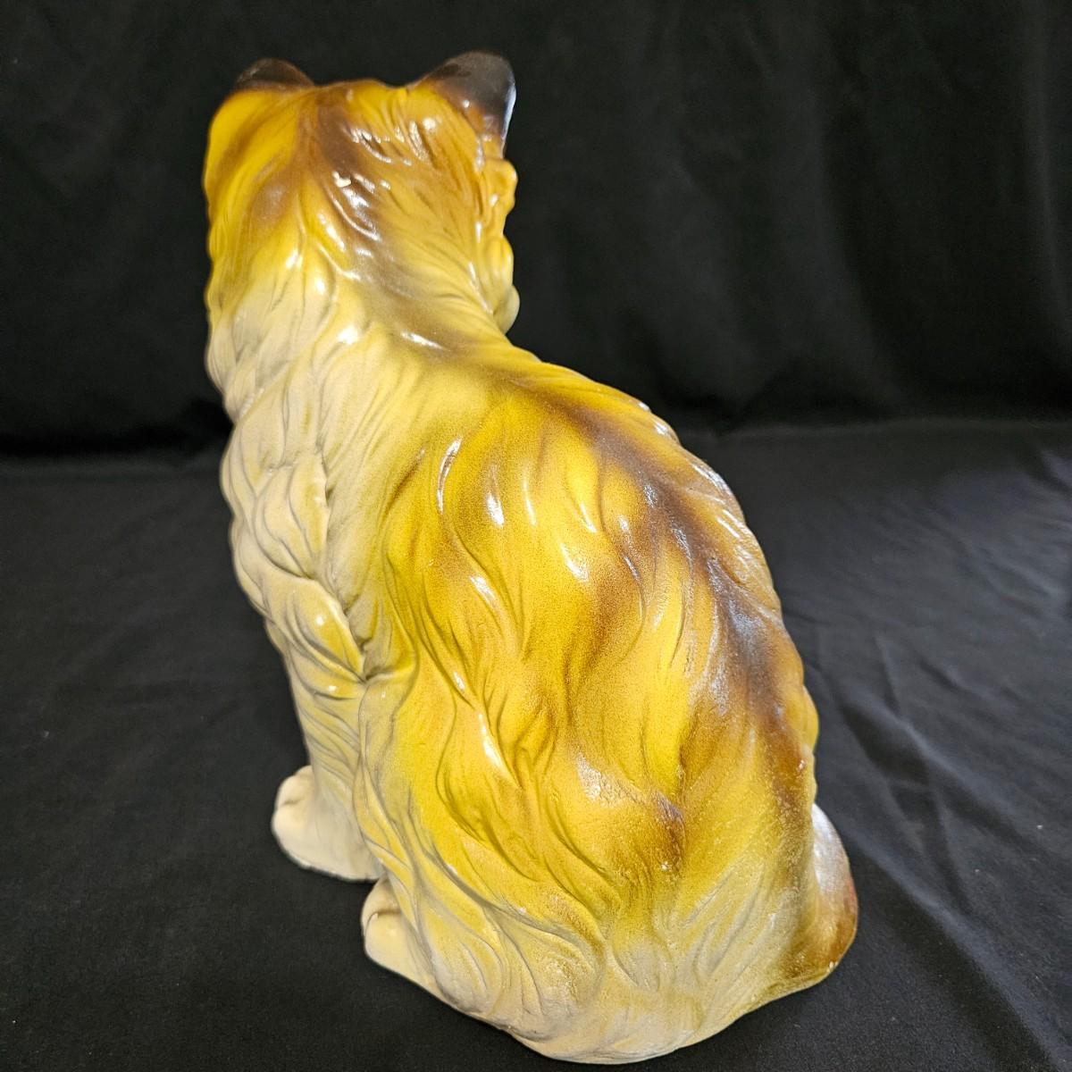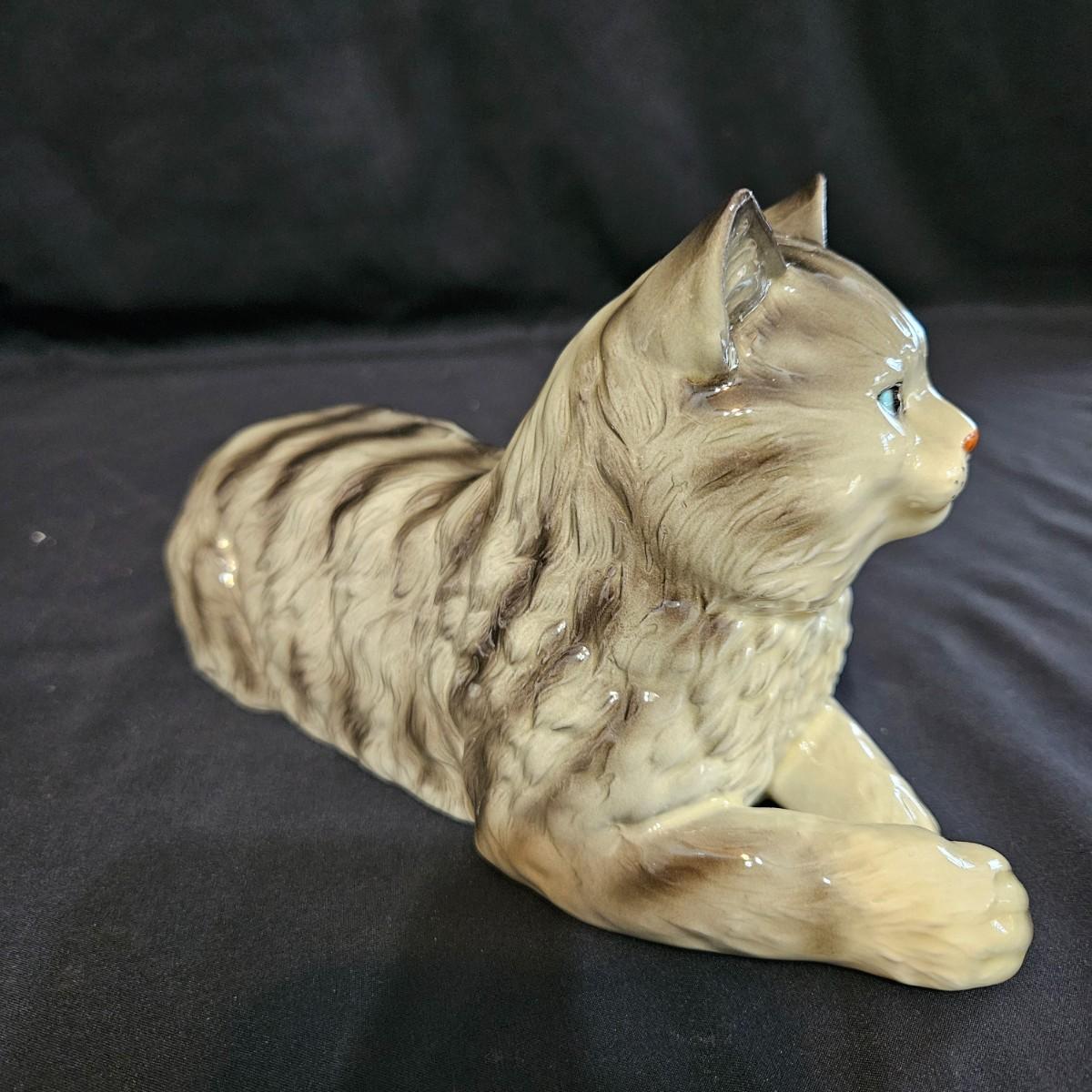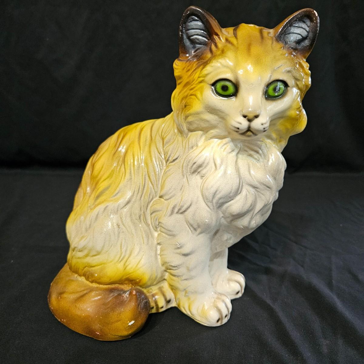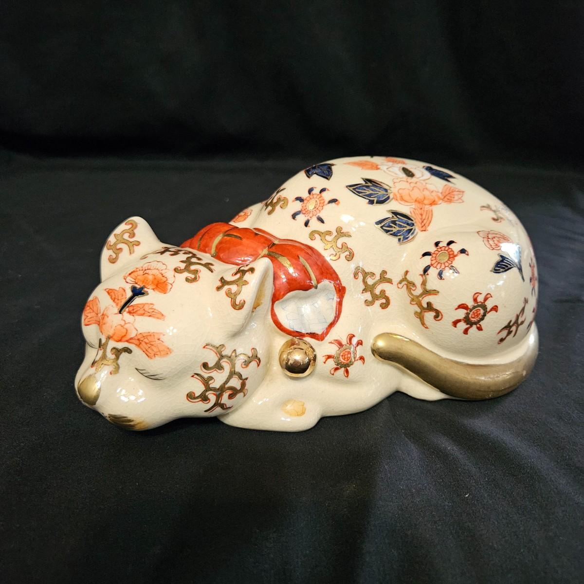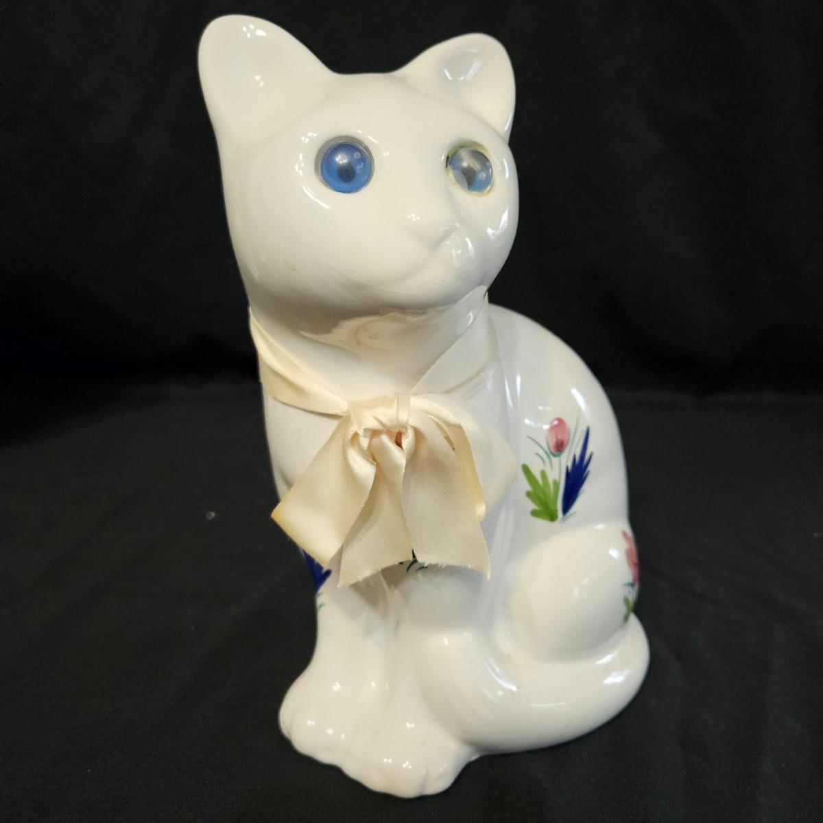 An assortment of ceramic cats from a variety of manufacturers. The solid white cat is an Enesco, the grey cat and Asian themed cat are made by Sadek. The floral print cat measures approximately 11" x 6.5" x 6"H. Shipping available