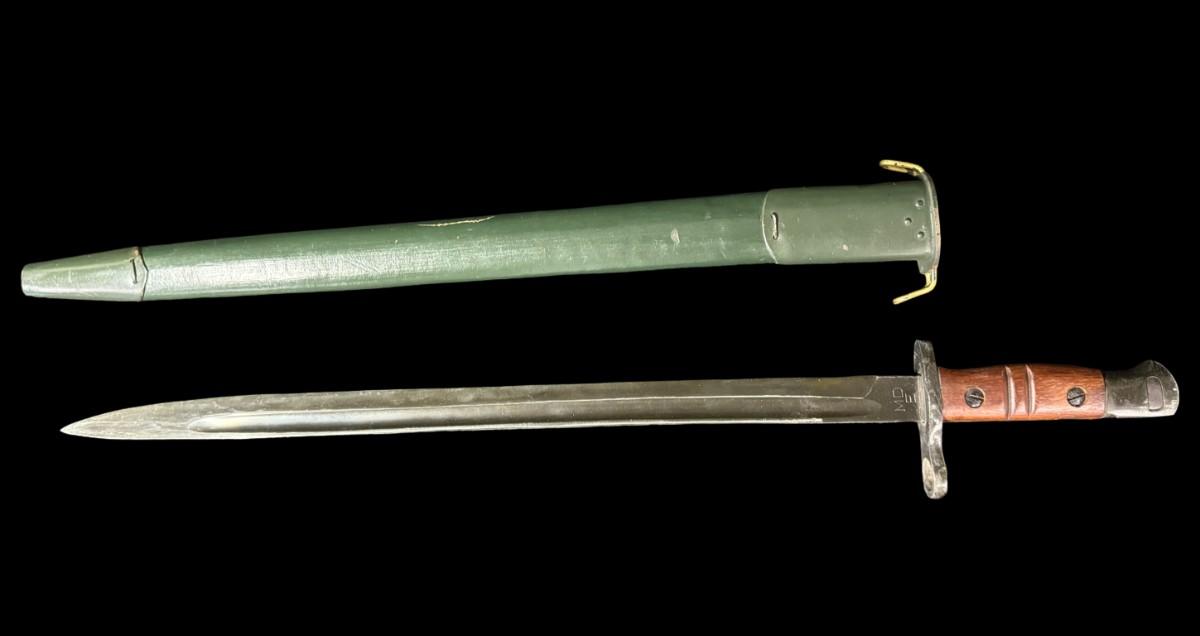 This is an exact reproduction of the classic WW1 Enfield M-1917 bayonet. It has hardwood grips, and comes with a steel-mounted leather scabbard complete with correct hooks. This bayonet was also the standard issue for military shotguns, AKA “Trench Guns,” from WW1 to Vietnam. Measurement: 21.5”L (bayonet). Pre-auction estimate: $100-$150. [JS]