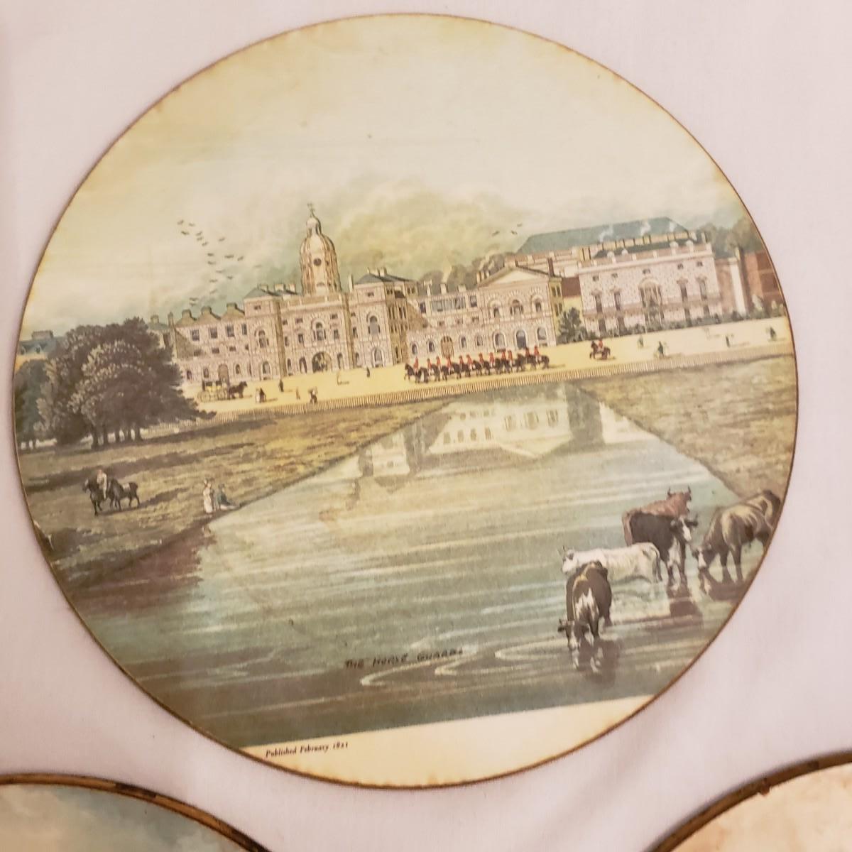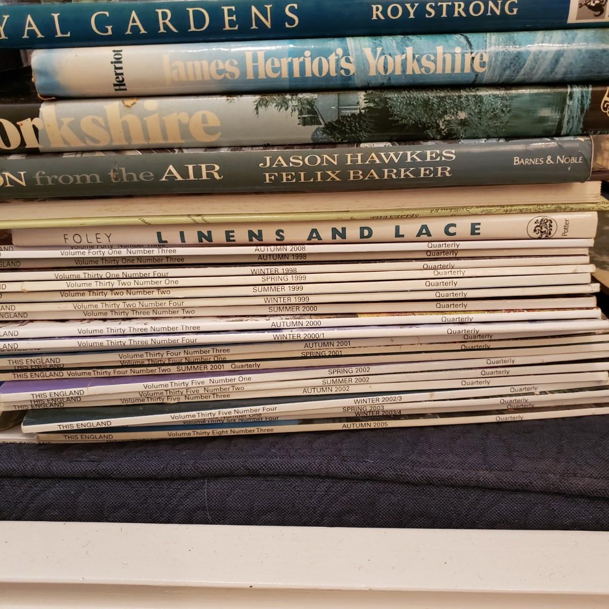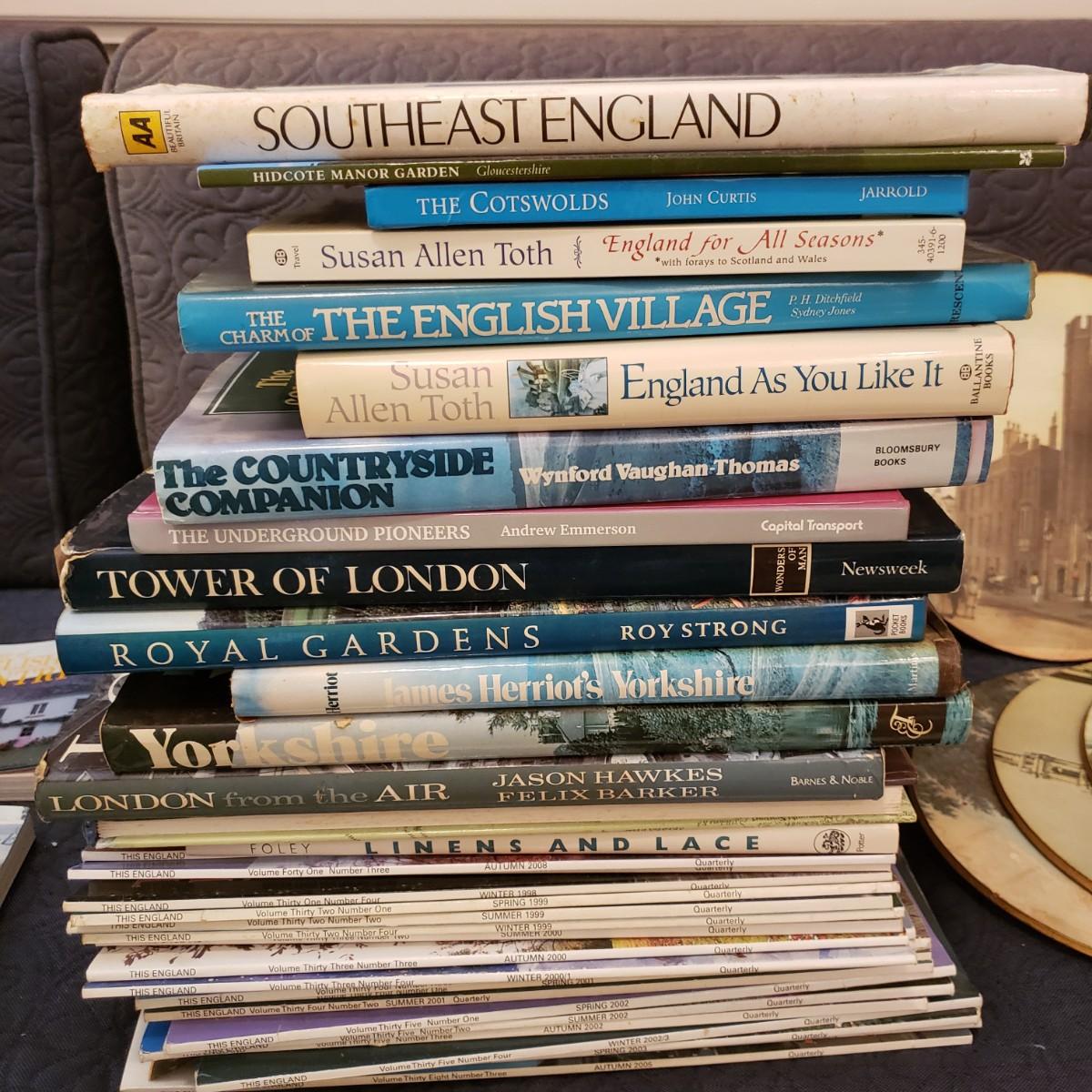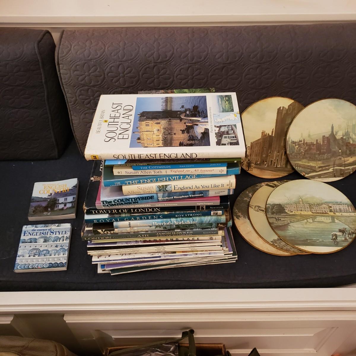 This large lot of books and magazines about England will spark your travel bug! See pictures for titles. Also included are five felt bottom trivet with various pictures from England.