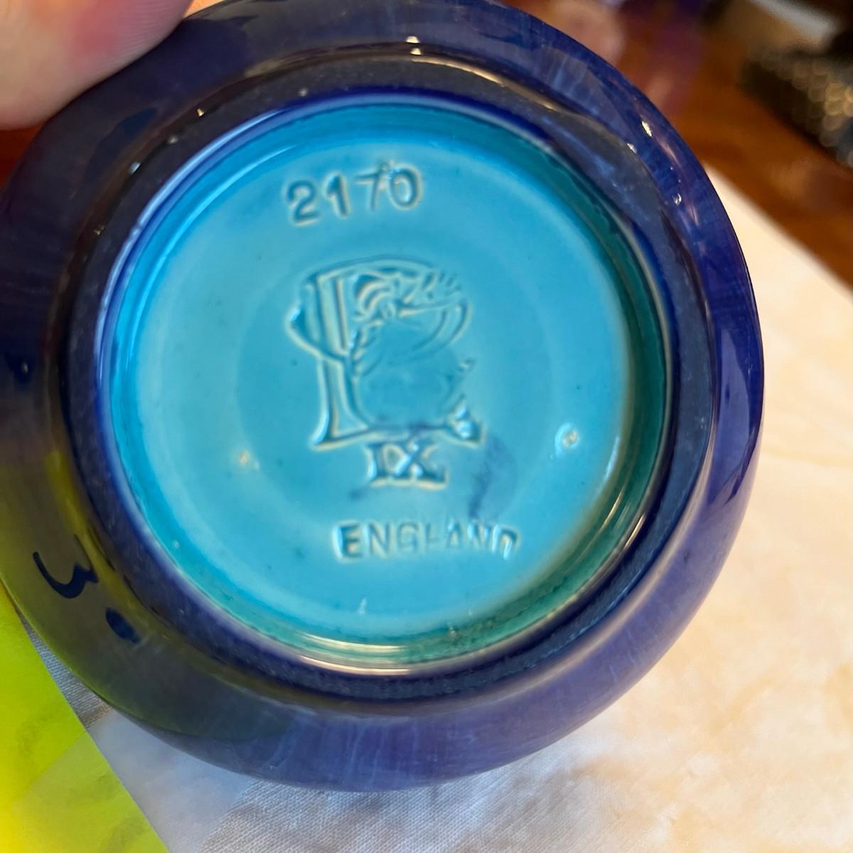 By the mark, it looks to be pre-1940. Might be majolica. 3" tall.