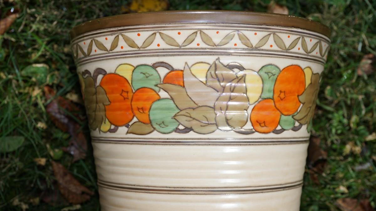 very colorful pot of bright fruit colors. accented of hand painted enameled applied dots and outline