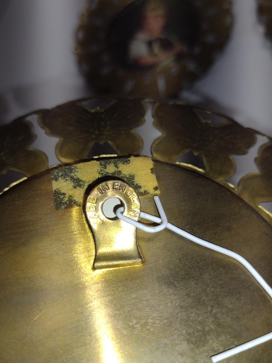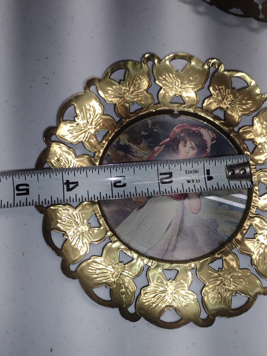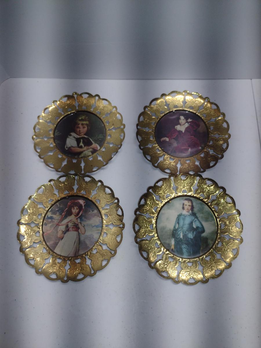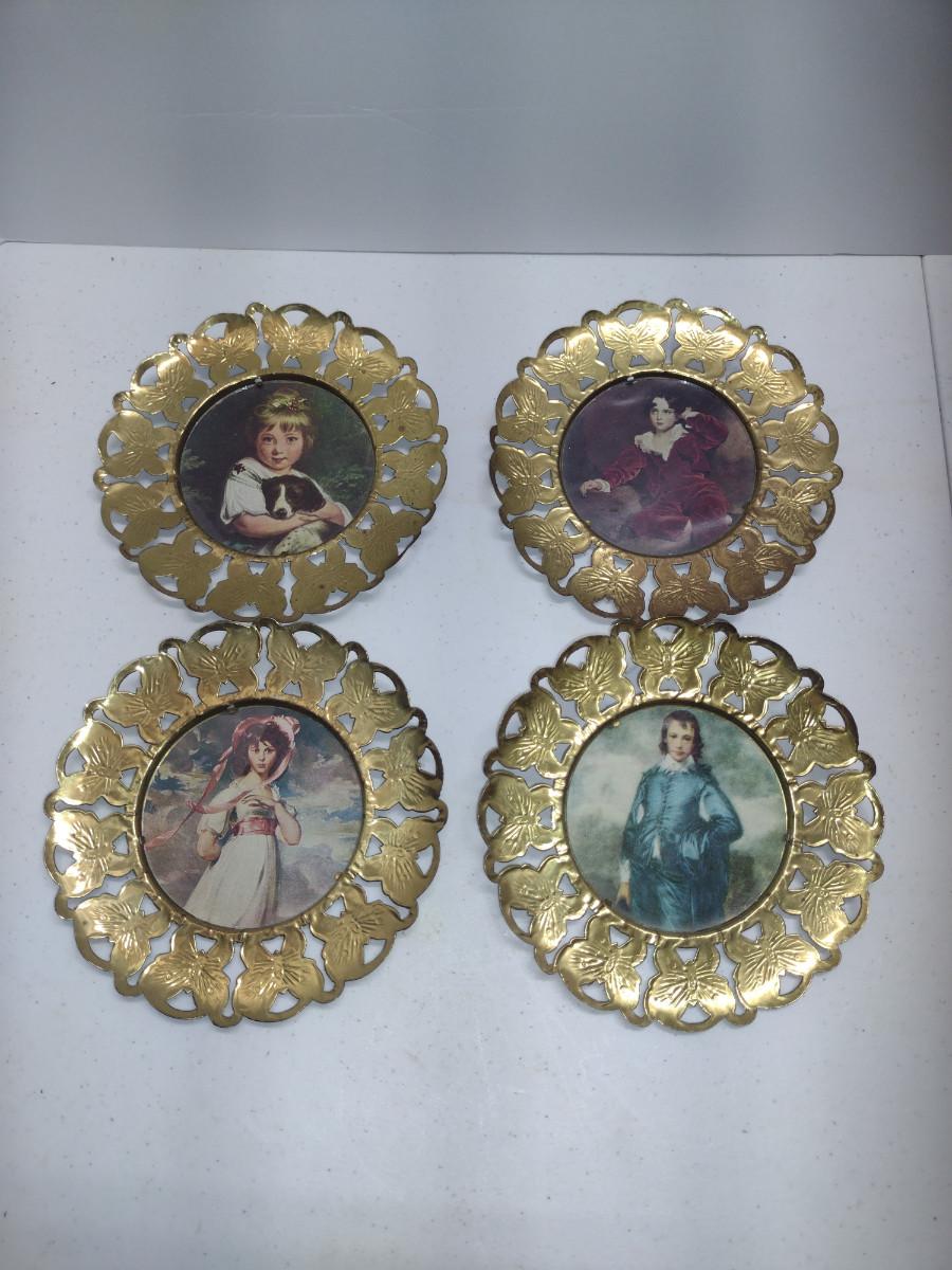 English Metal Picture Frames with Vintage Prints- Four Pieces- Approx 4 3/4" in Diameter