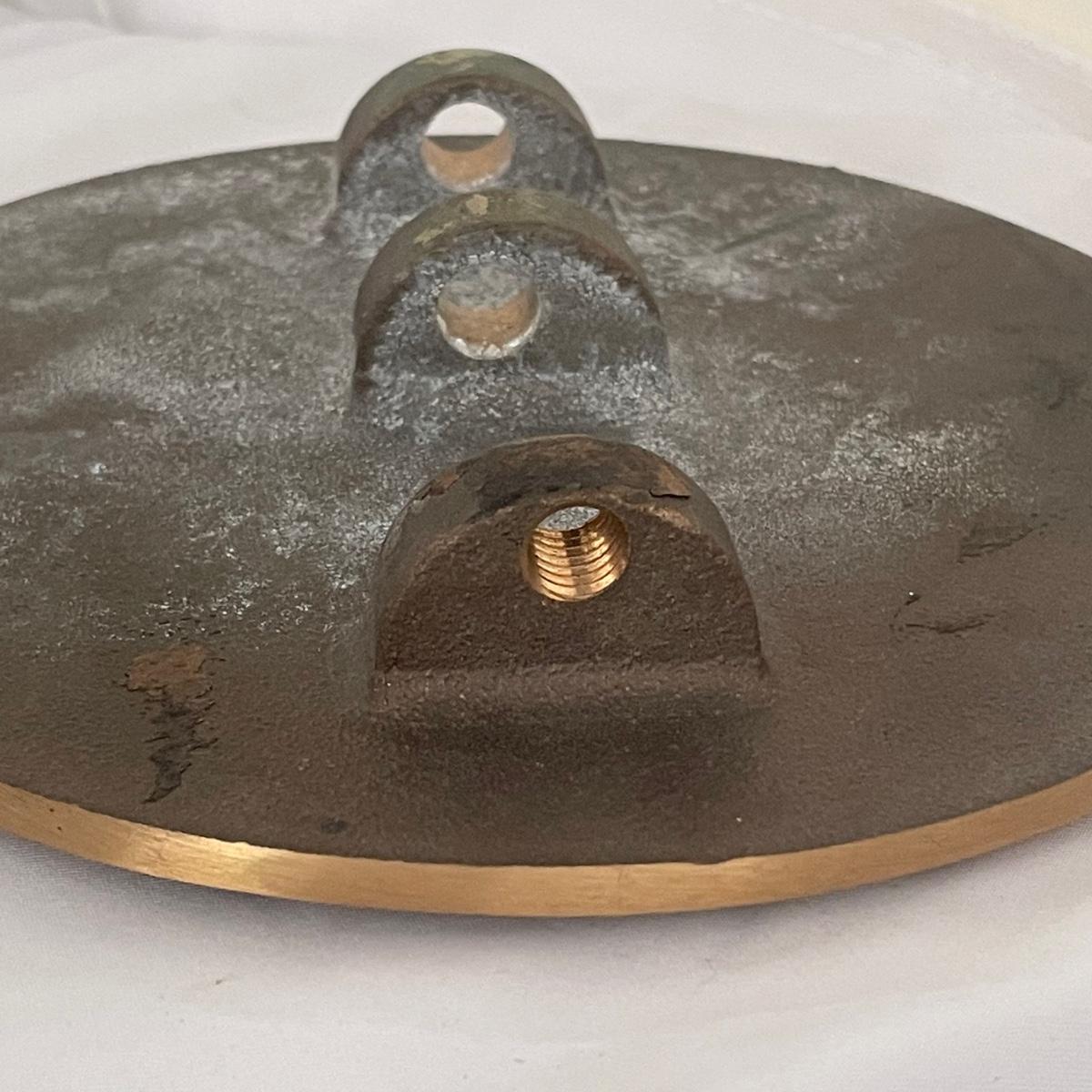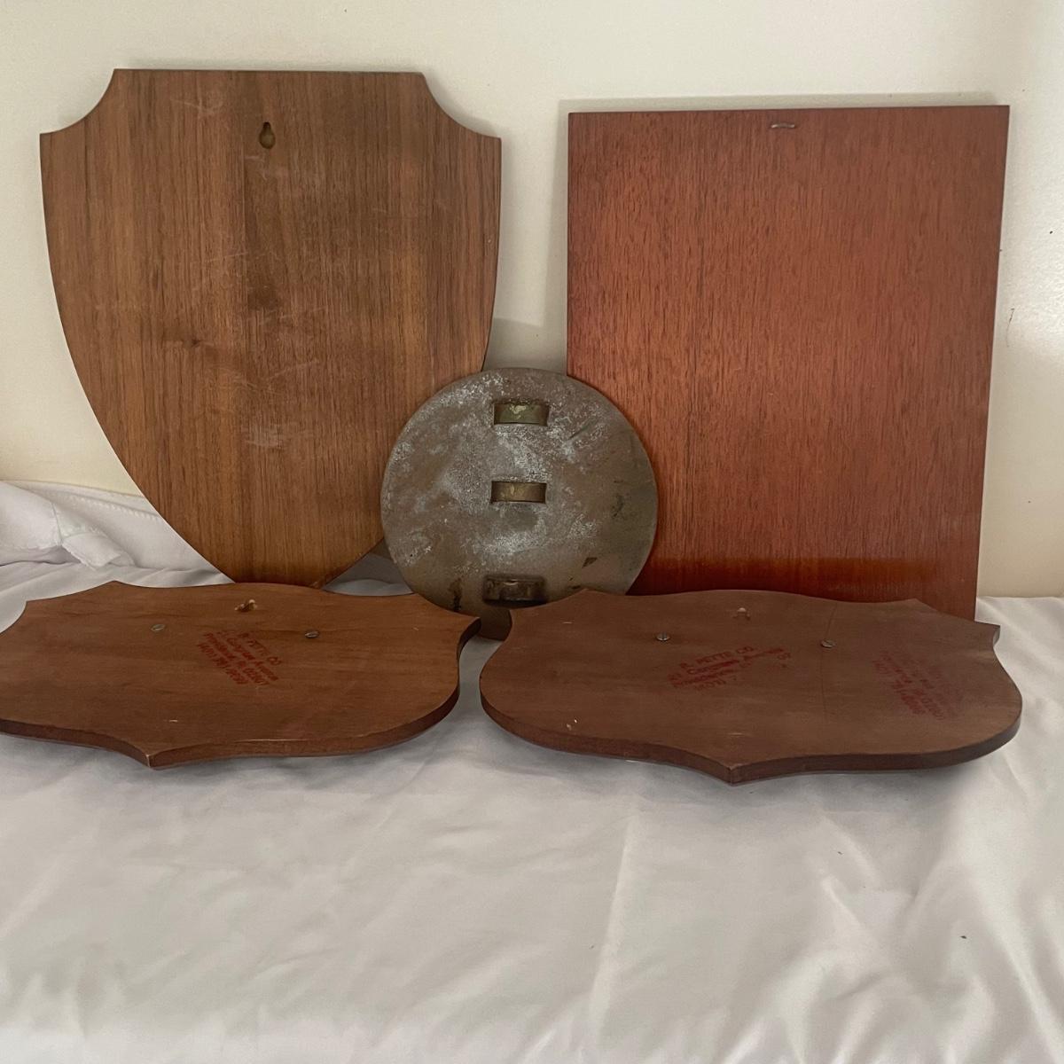 These 6 items include a clear bottomed English Pewter tankard, a brass round plaque with threaded holes for a rod and 4 wood and metal plaques.
