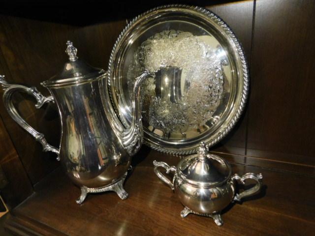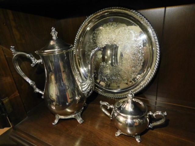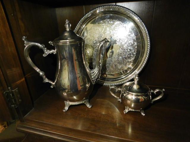 English Silver Plate Coffee Pot, Sugar Bowl and Serving Platter