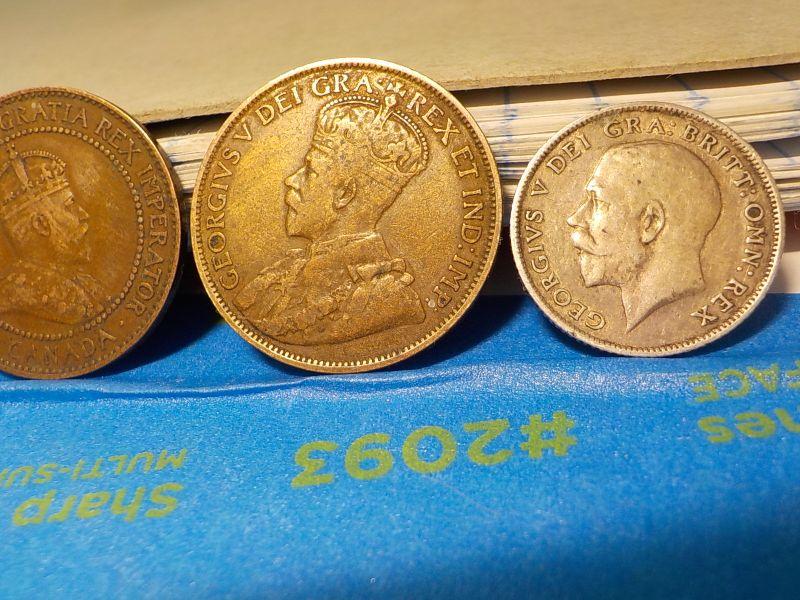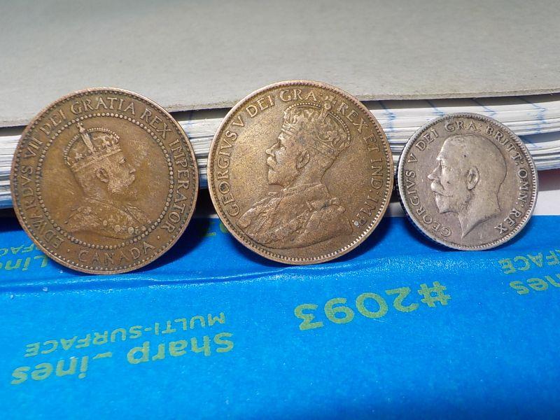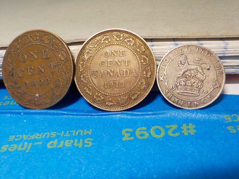 English six pence 1914, 2- canada one cents 1909, 1912.