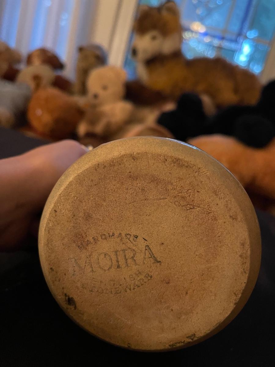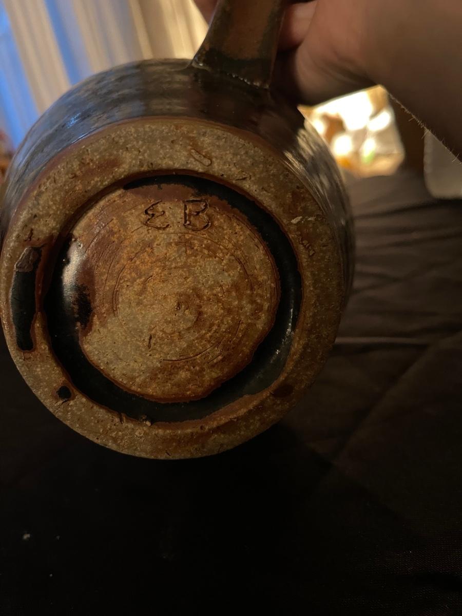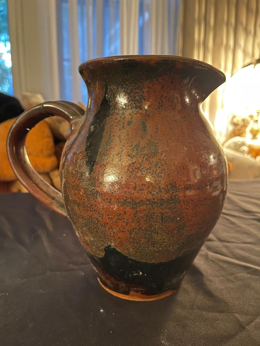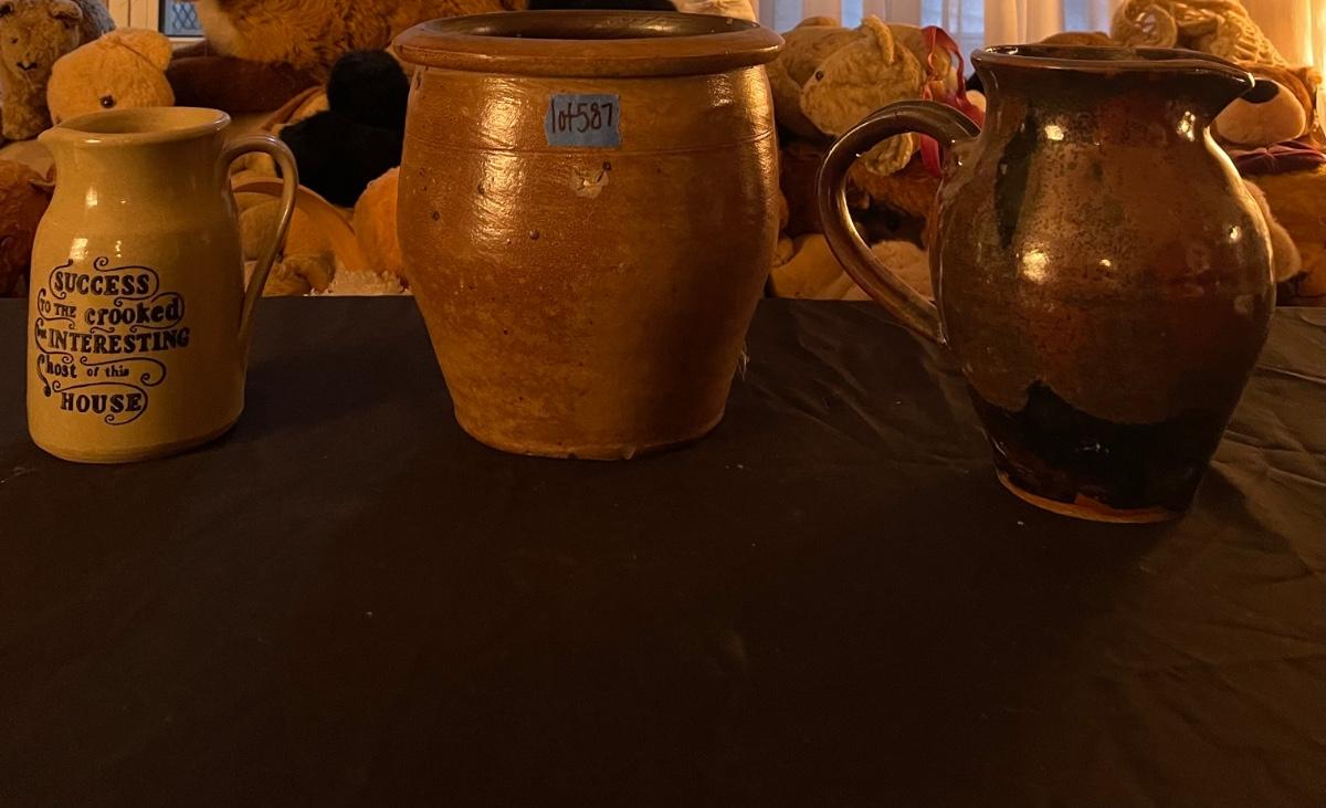 Vintage Moira English Stoneware; Jug (6 x 5"), old pottery vase - (8 x 7"), colored vintage pottery jug signed EB - (8 x 8").