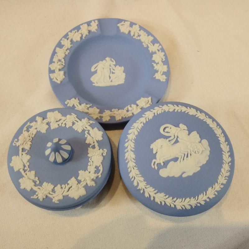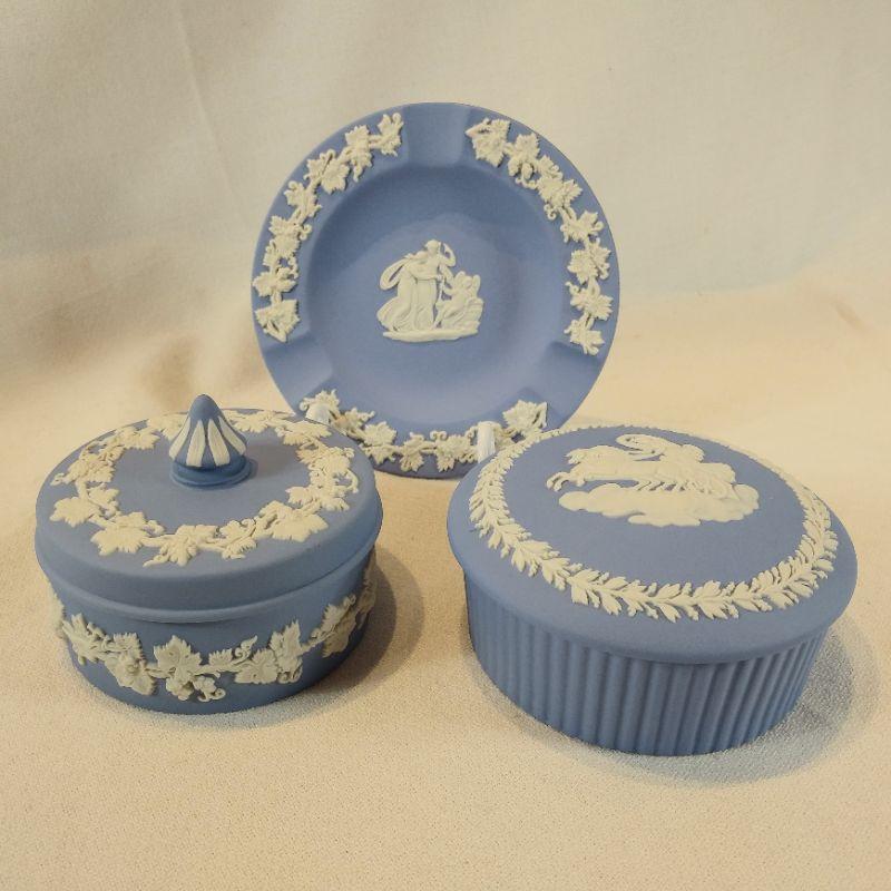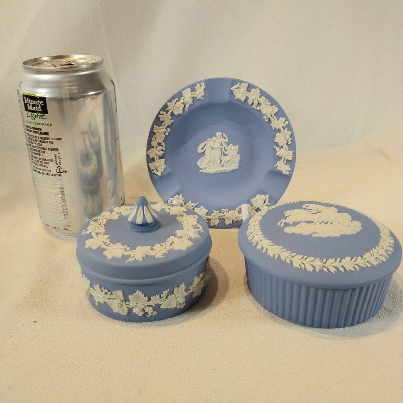 This is a nice grouping of soft blue Wedgewood Jasperware made in England. It was brought home by our client in the "50's from a trip to London. Includes two dresser jars with lids, one is 3-inches in diameter the other is 3 1/2-inches in diameter and an ashtray that is 4-inches in diameter. All are in very good condition - no chips or cracks.
