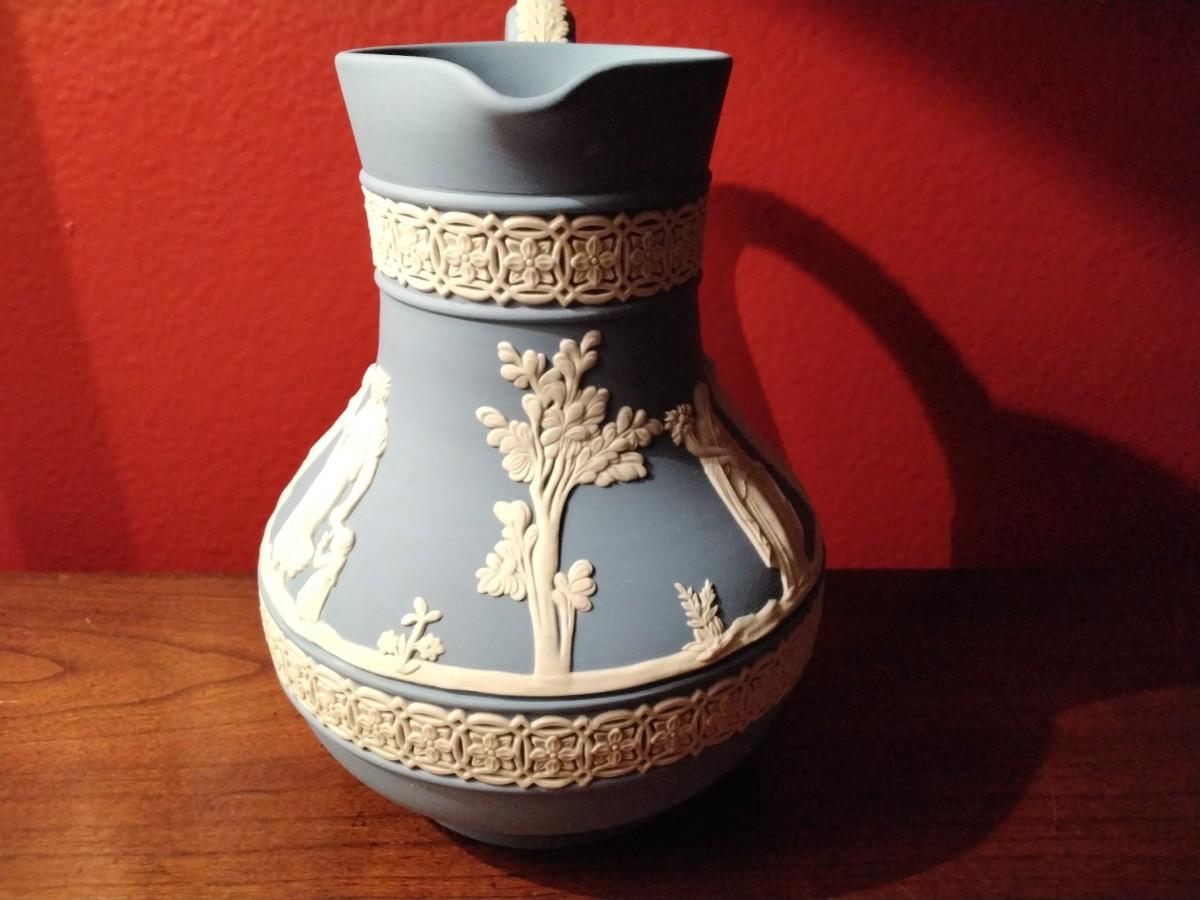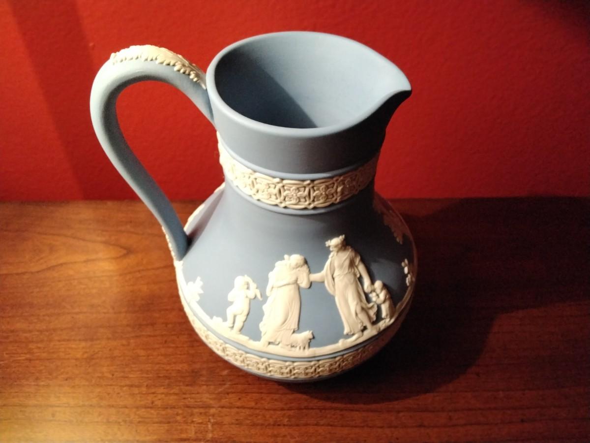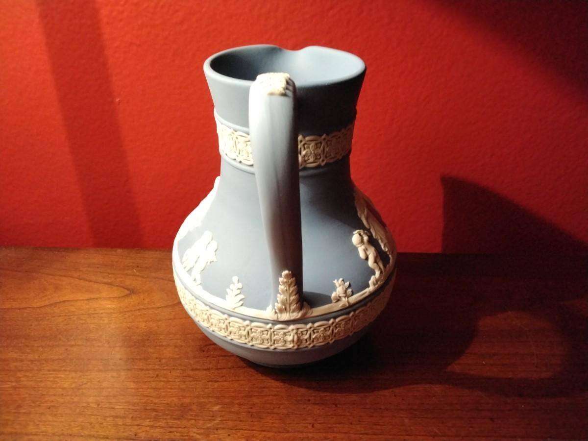 Beautiful mid-20th century English Wedgwood blue and white jasperware pitcher in the neoclassical style, 1951, England. A beautiful raised white relief around pitcher/vessel. Maker's mark and other markings on bottom.