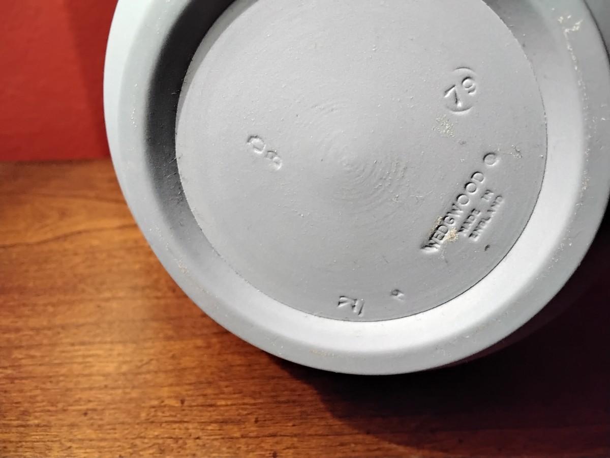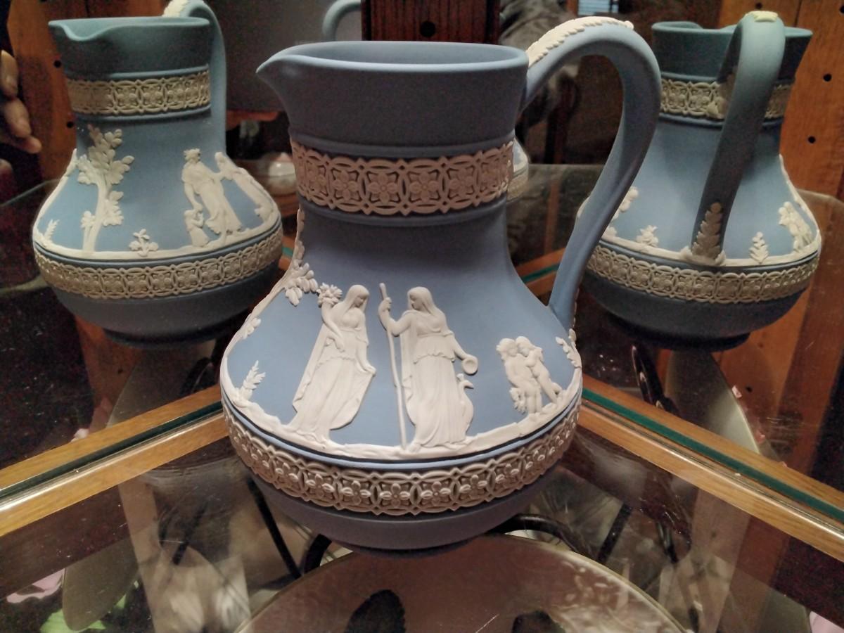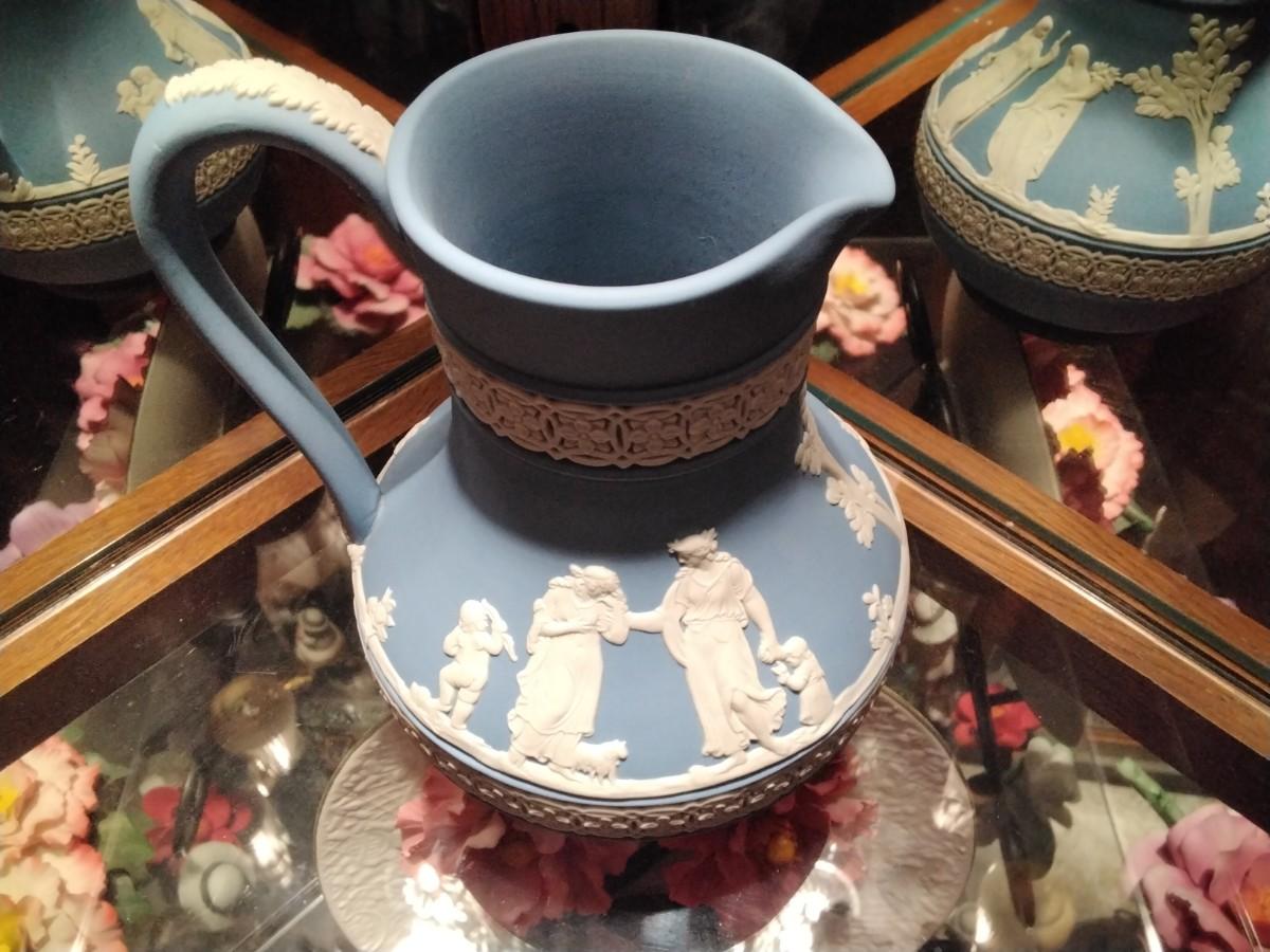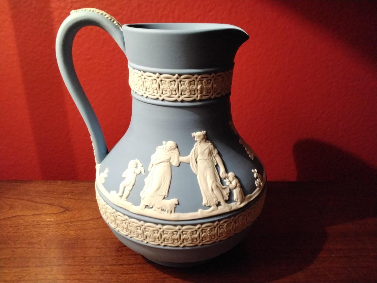 Beautiful mid-20th century English Wedgwood blue and white jasperware pitcher in the neoclassical style, 1951, England. A beautiful raised white relief around pitcher/vessel. Maker's mark and other markings on bottom.
