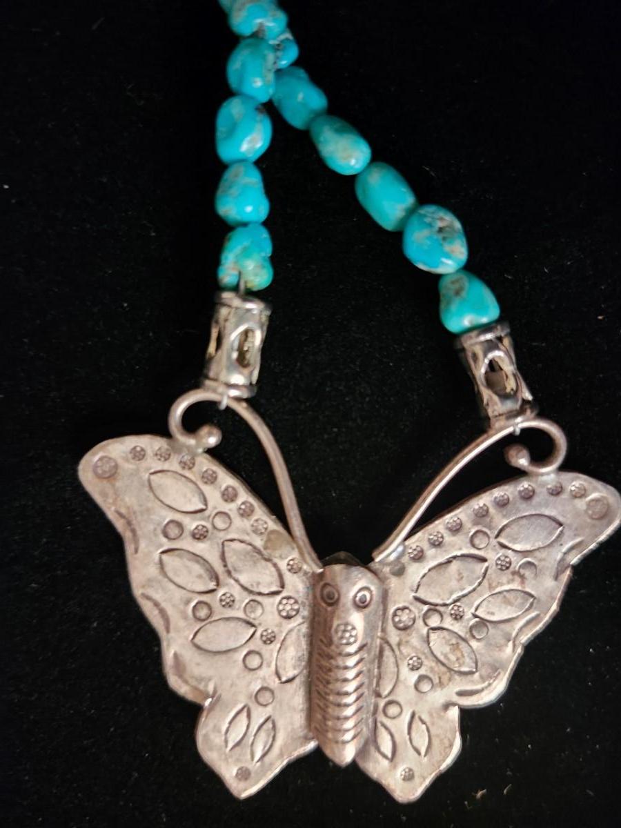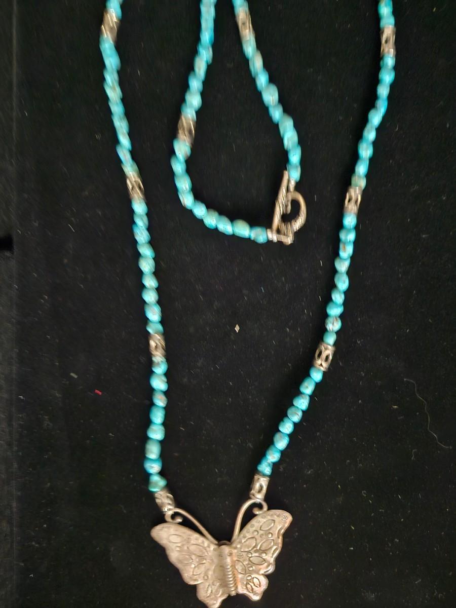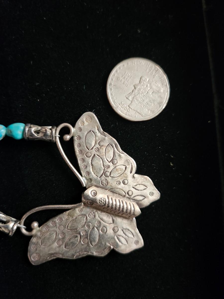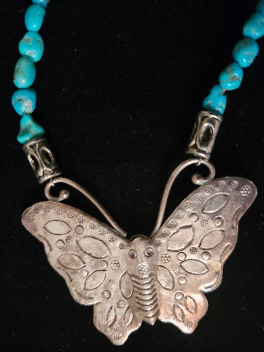 Turquoise and silver beads accent this engraved butterly necklace. 16" drop to the top of the butterfly pendant.