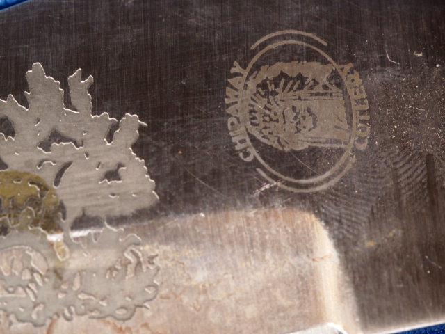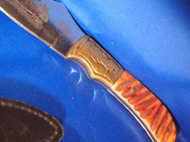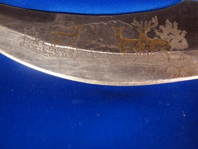 Engraved sheath knife with sheath Engraving is an outdoors with deer and trees. Overall length is 10 to 12 inches. Stainless steel blade. Hand Made cow Hide sheath