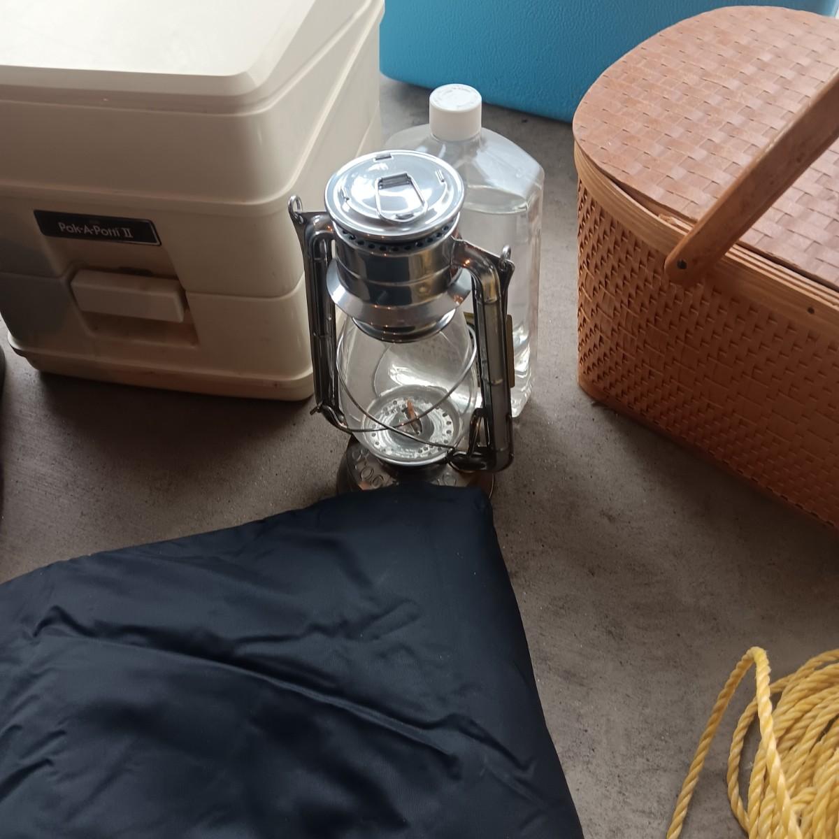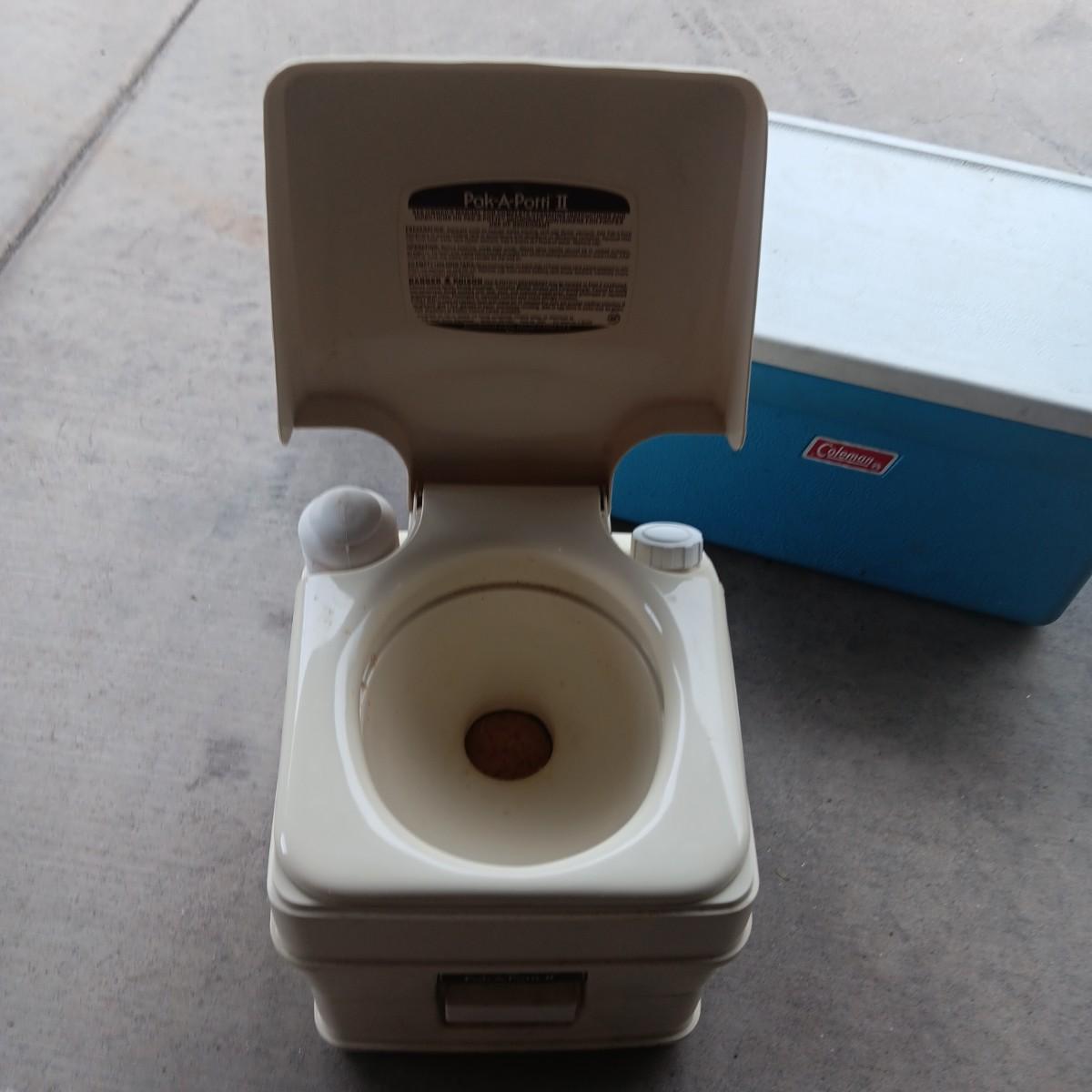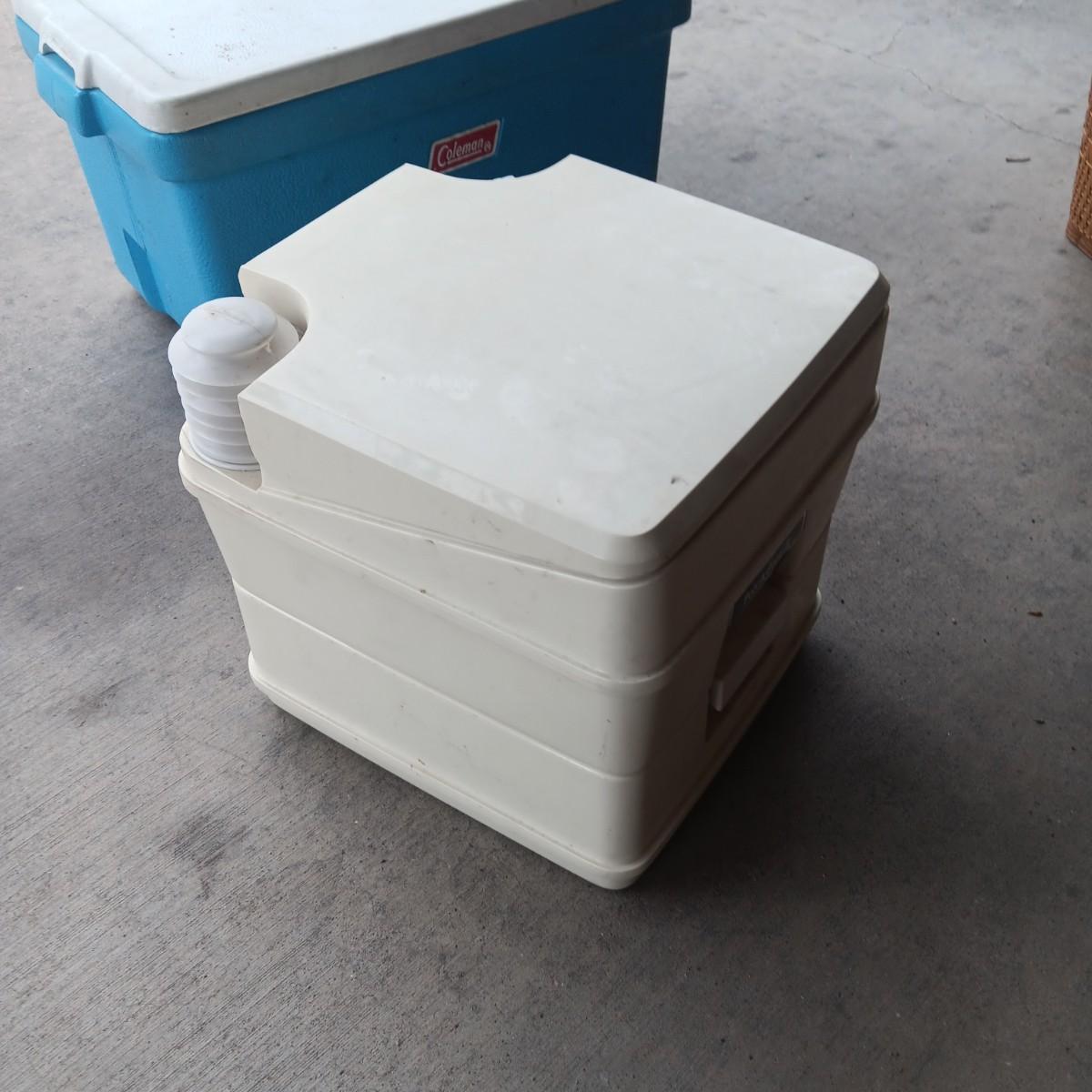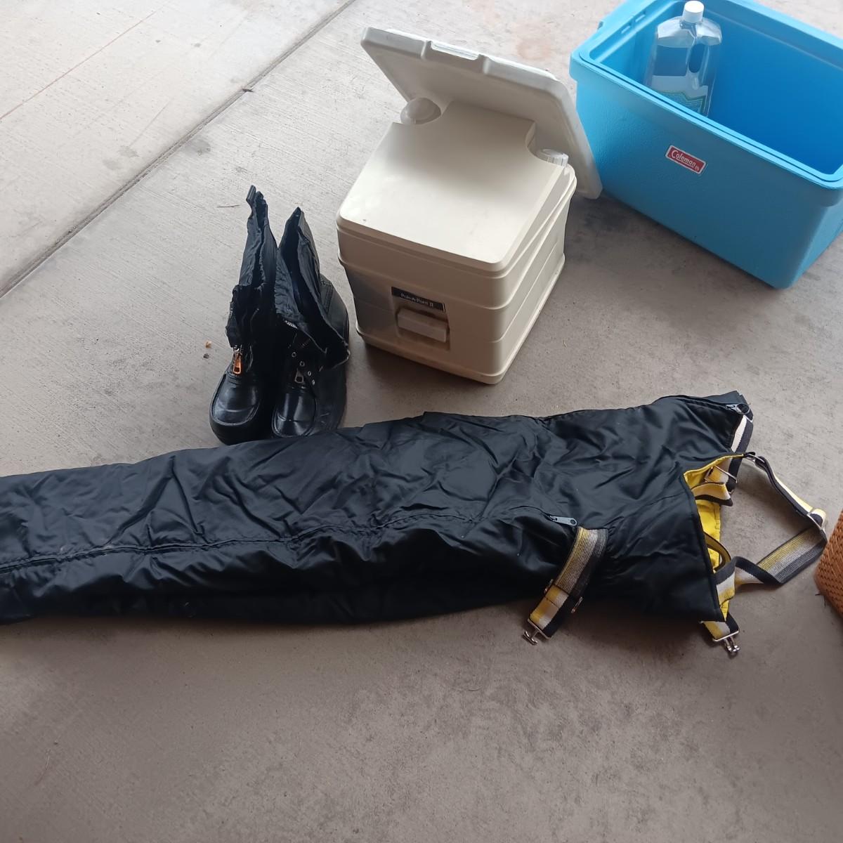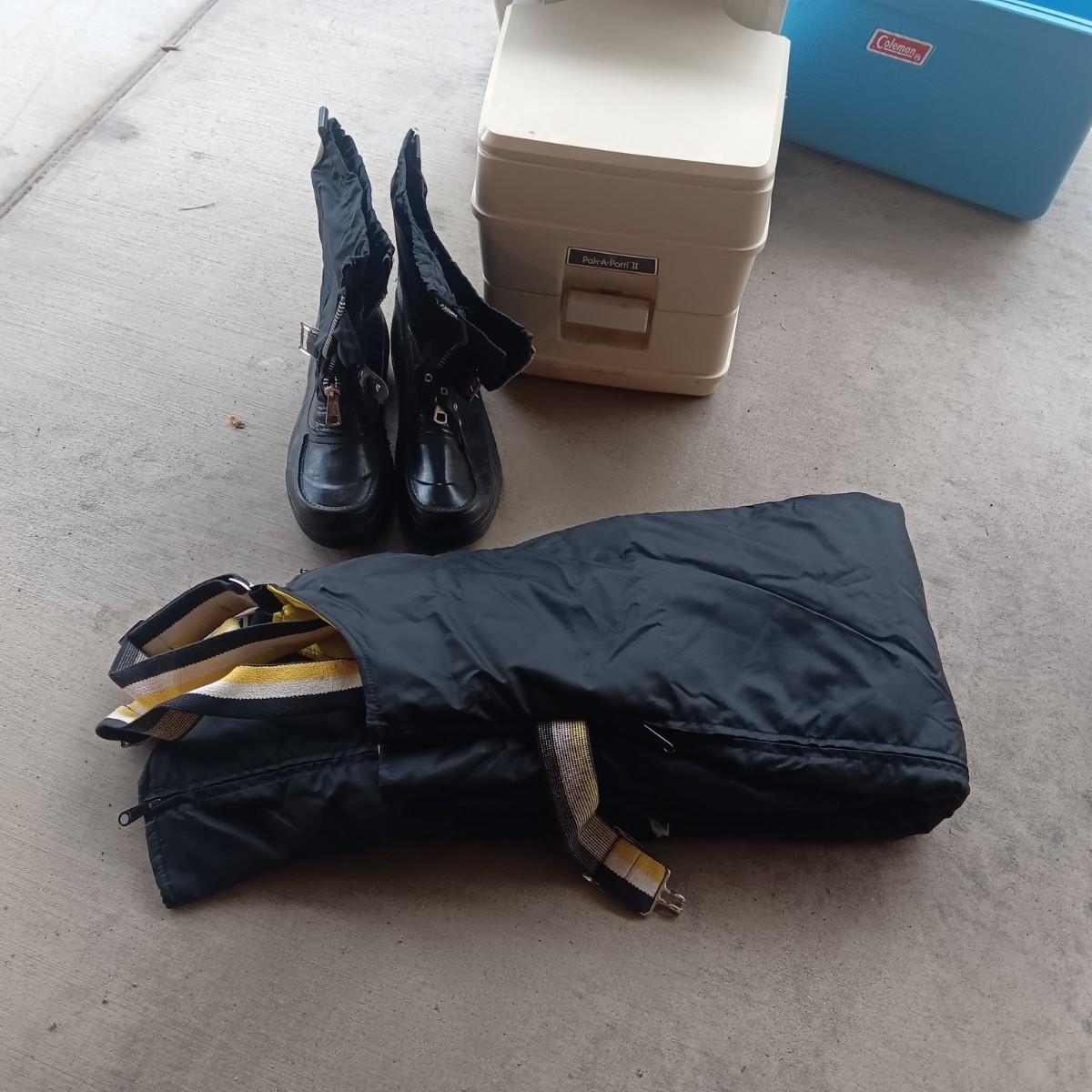 Port a potty, cooler, lantern, picnic basket, John Deere winter bib coveralls, Winter boots size 10