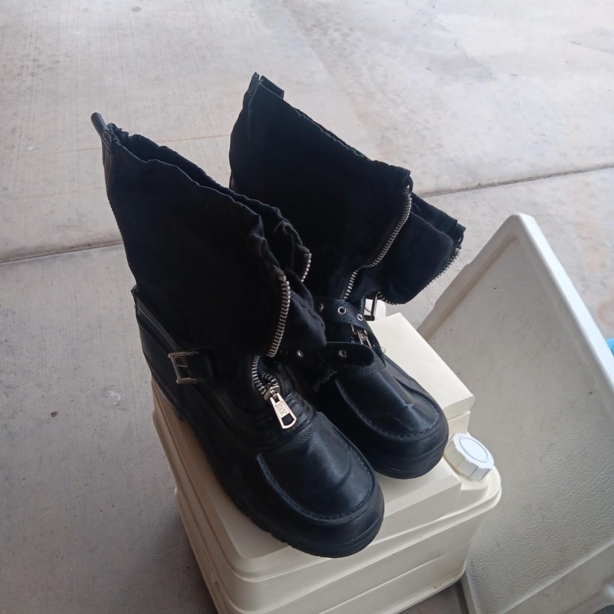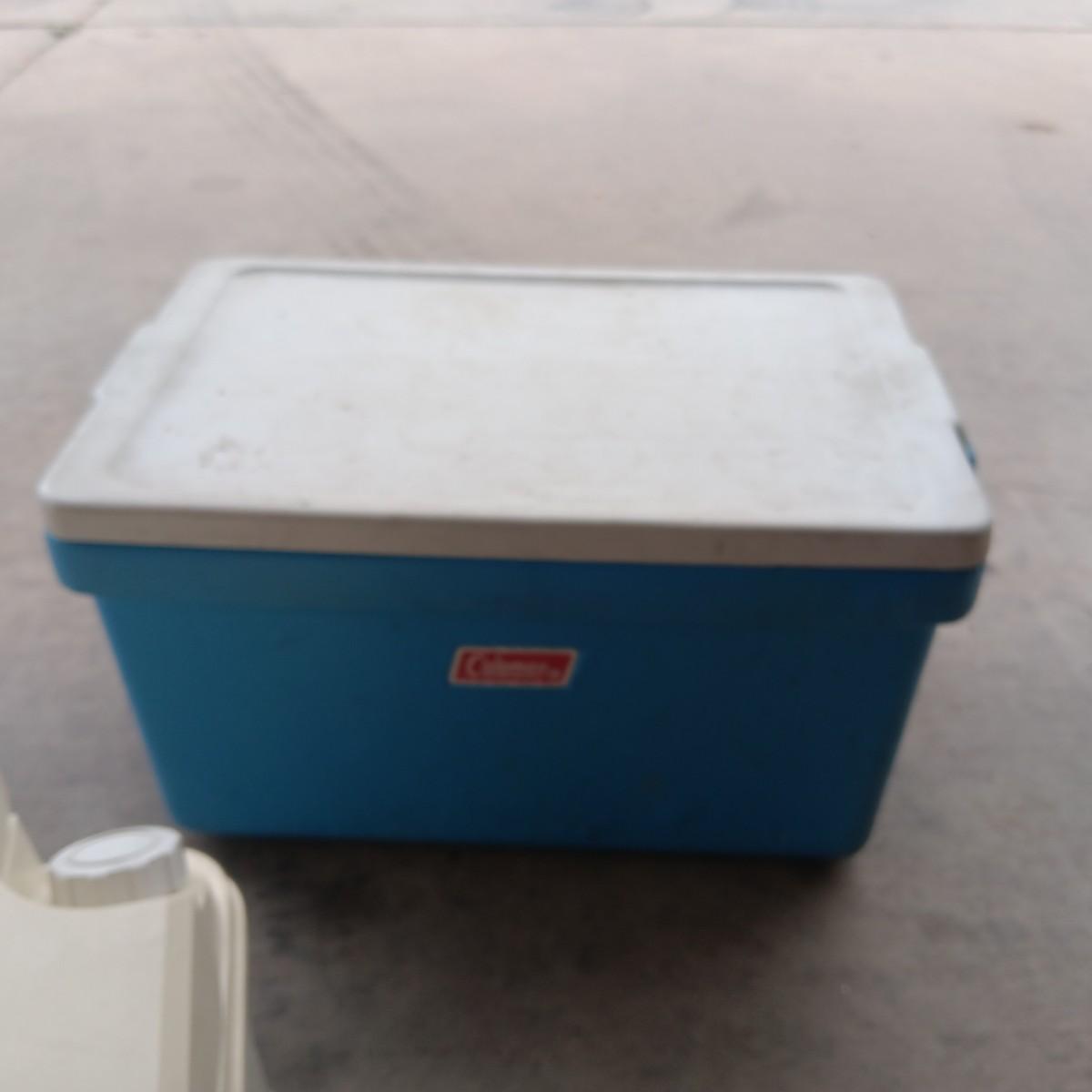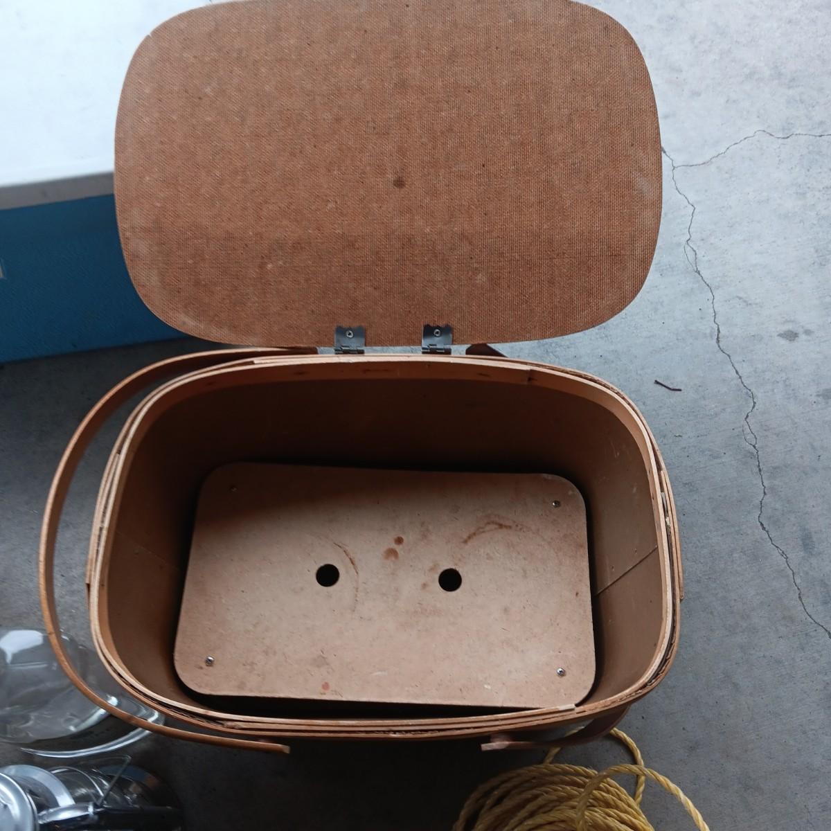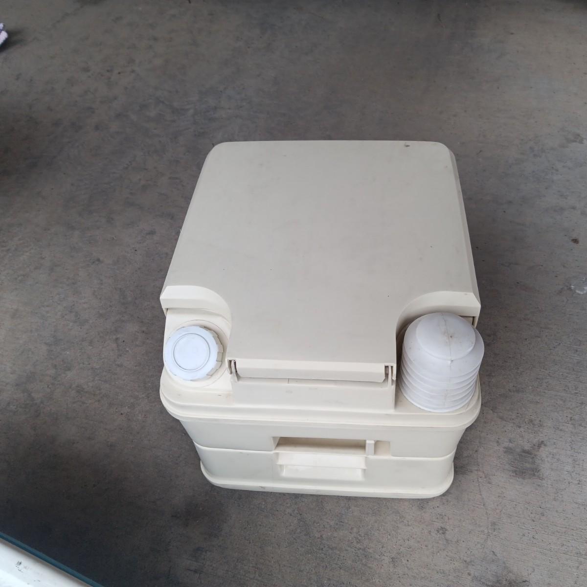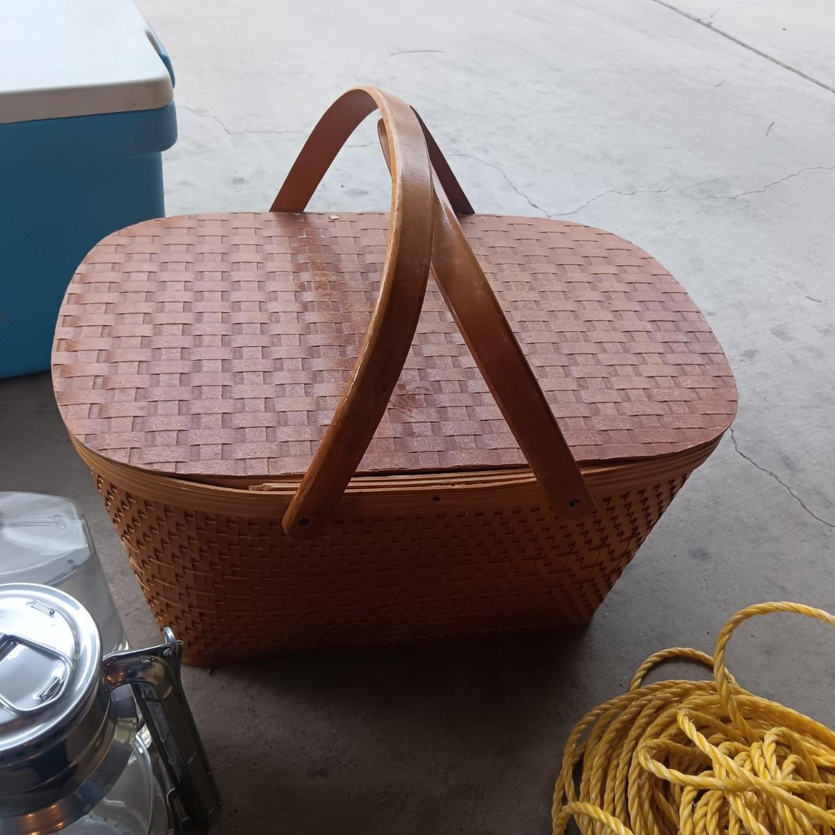 Port a potty, cooler, lantern, picnic basket, John Deere winter bib coveralls, Winter boots size 10