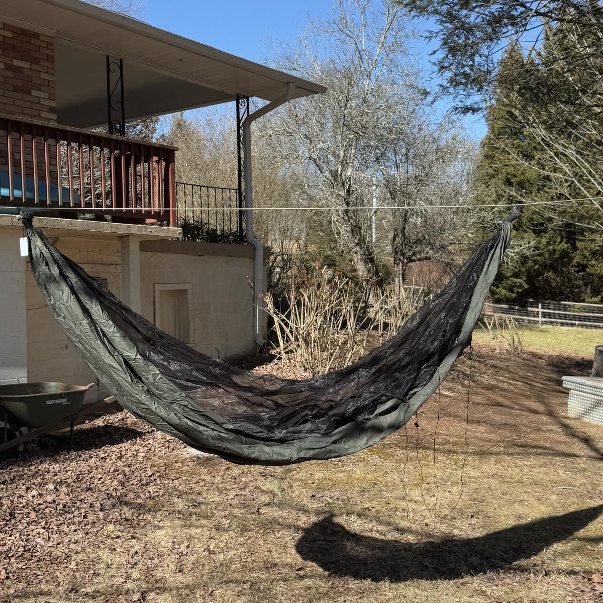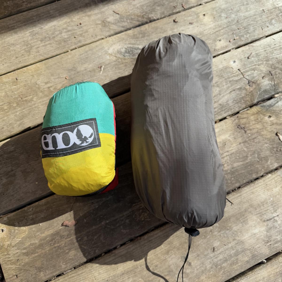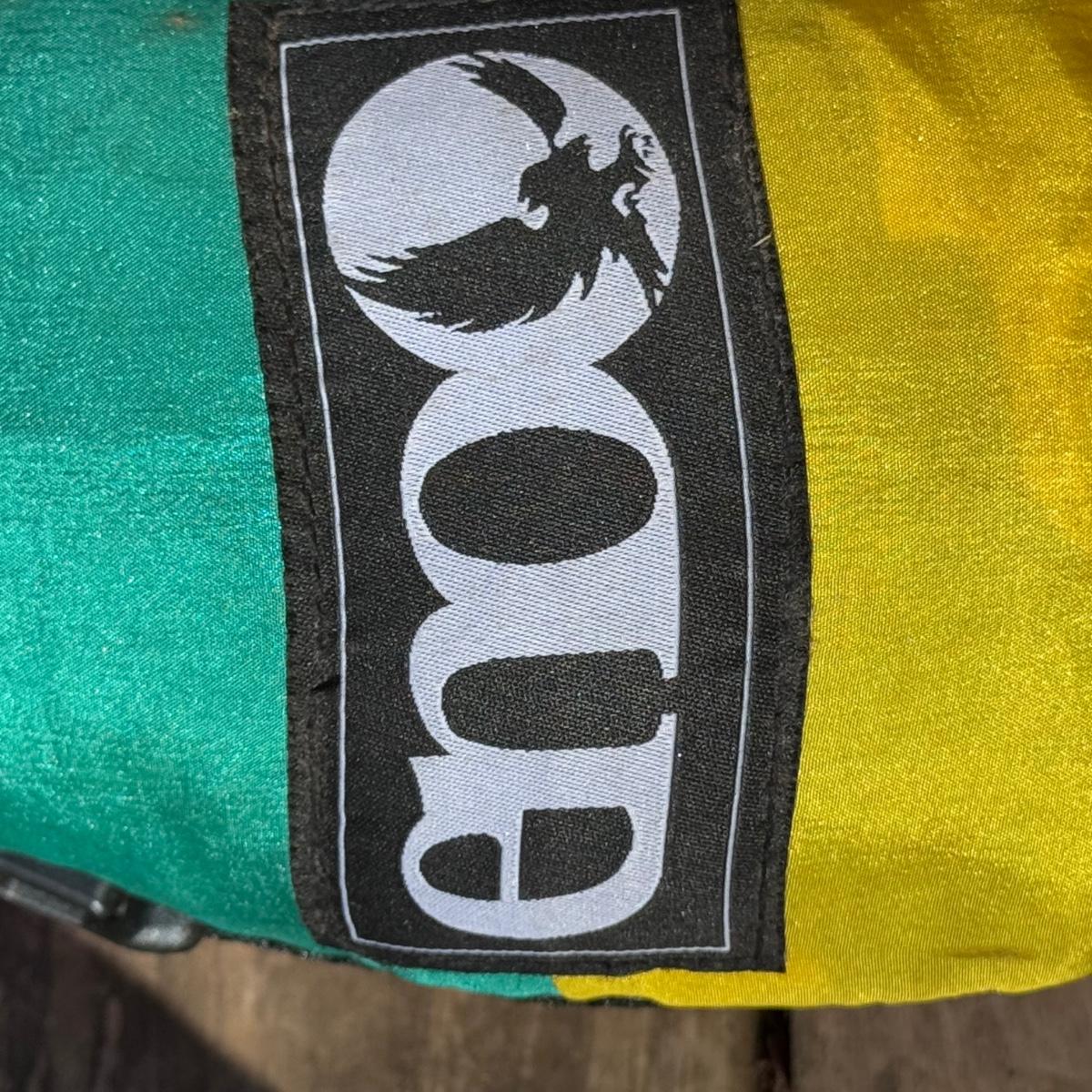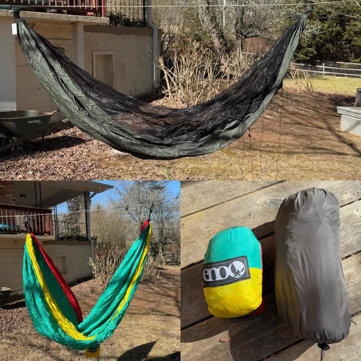 Lot includes one Eno hammock that’s a double nester. It also includes a Warbonnet mosquito net hammock that appears to be new. The Eno double nester measures 6’9” long and 6’4” wide. Both hammocks come in their original bag. Shipping available.