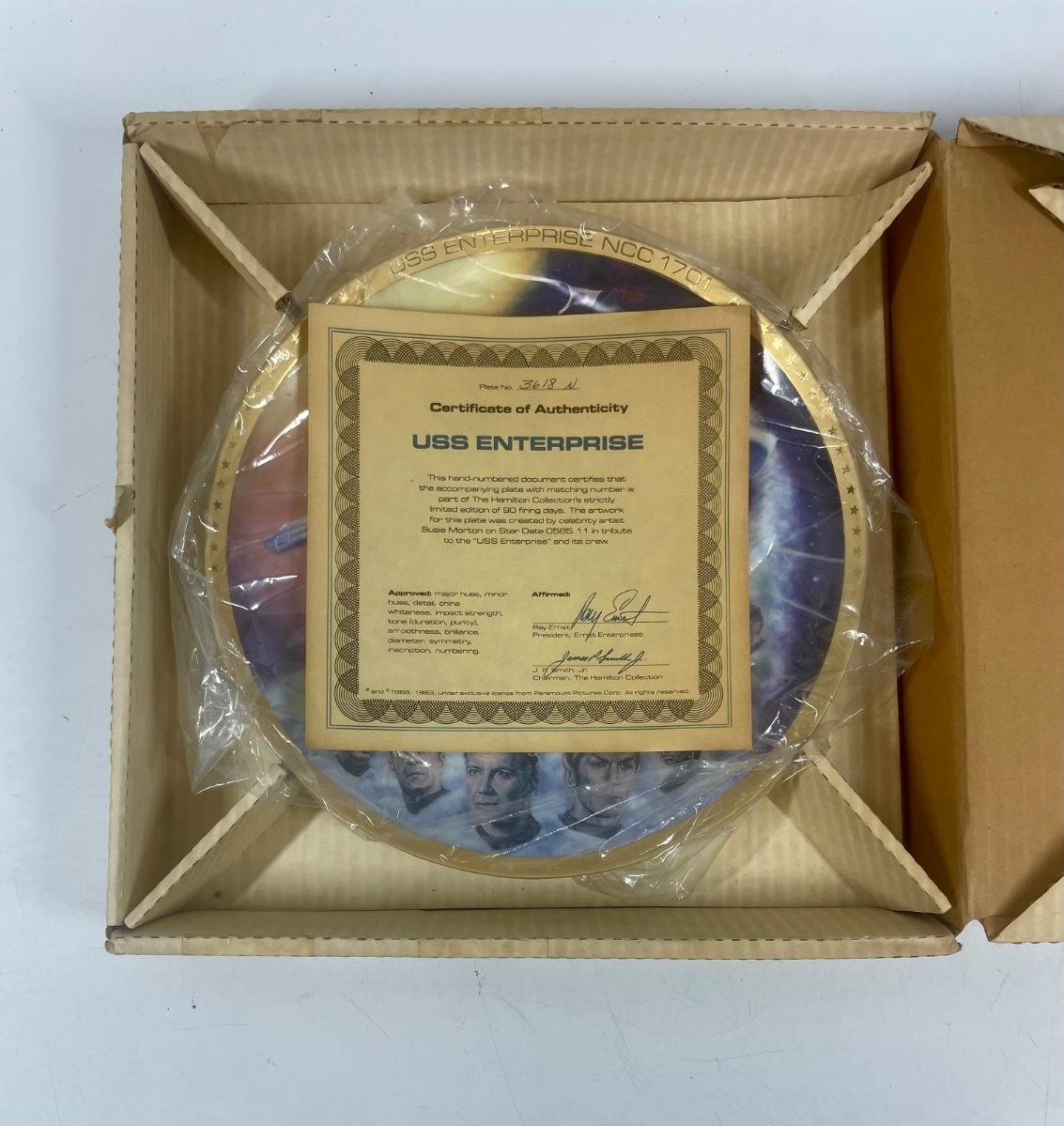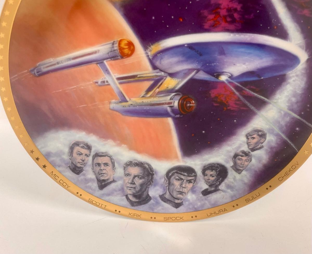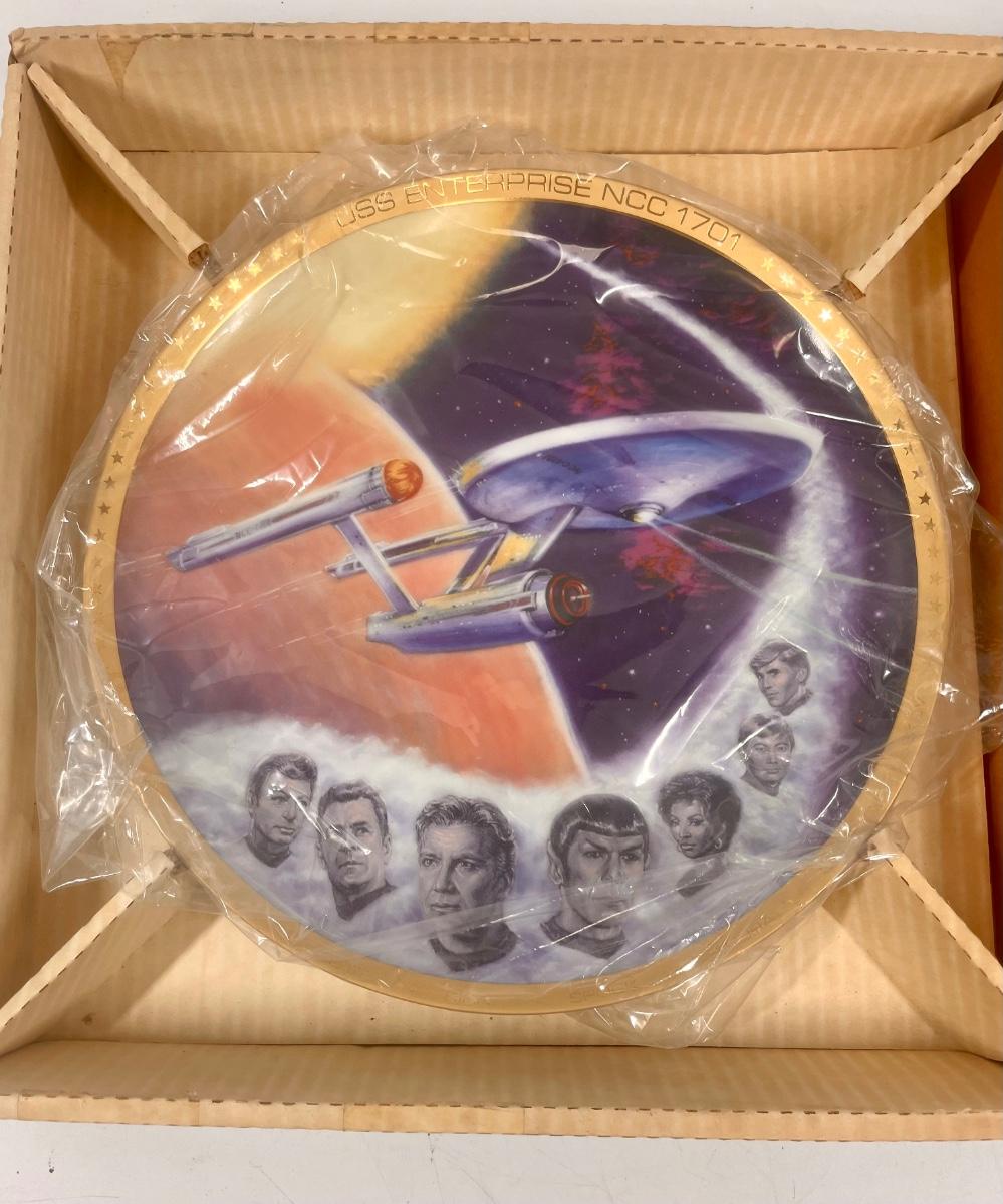 10” Star Trek Collector plate from 1984. Image of main cast of the original series and the USS Enterprise in orbit. With certificate of authenticity, In original shipping box. Part of a set of 9, see other auctions for more.