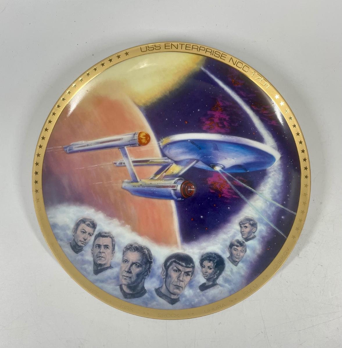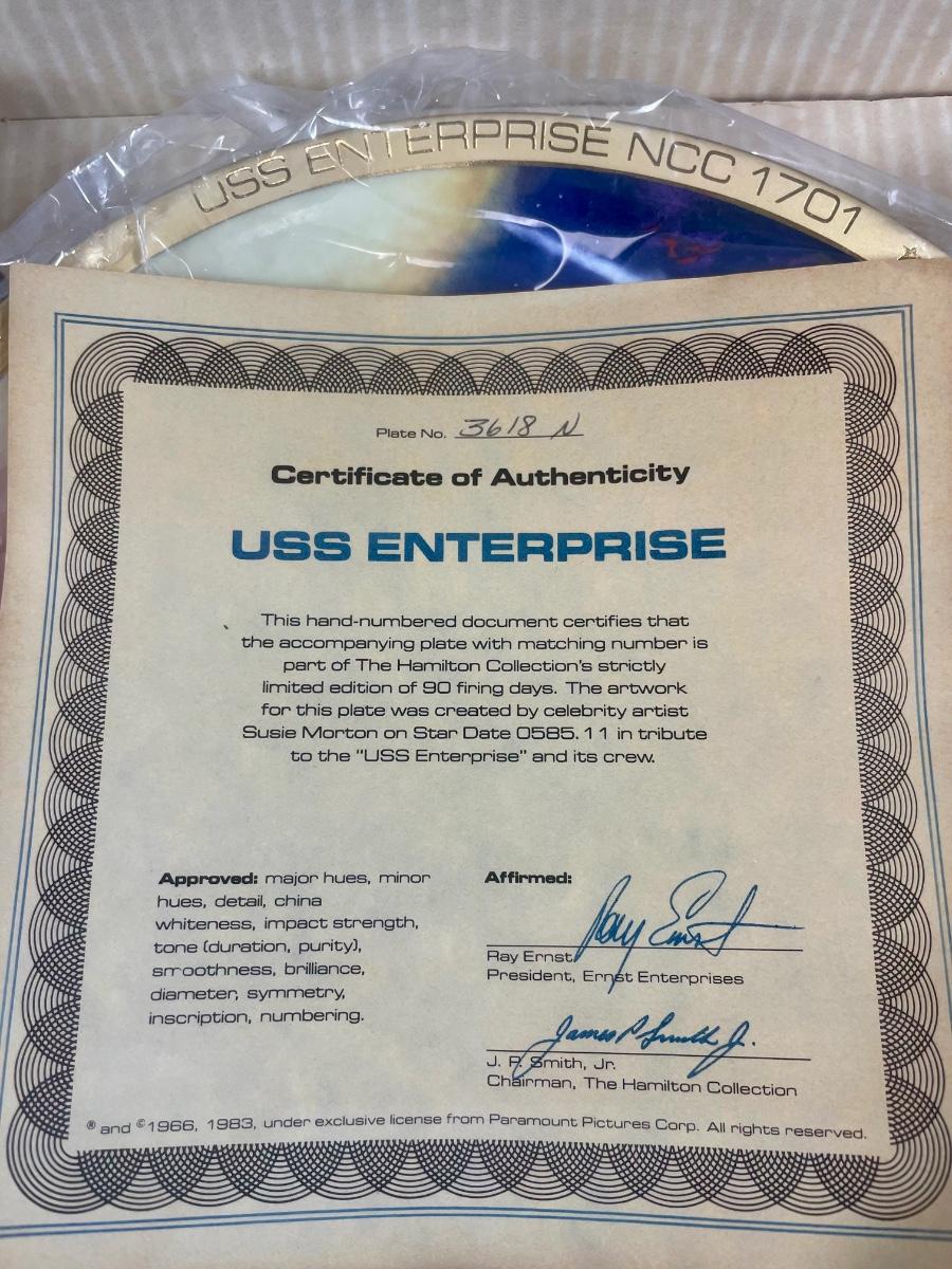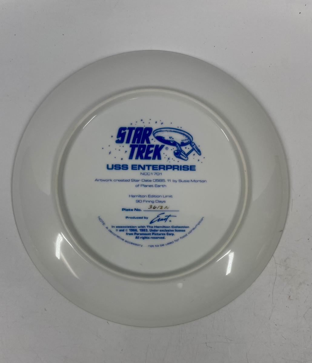 10” Star Trek Collector plate from 1984. Image of main cast of the original series and the USS Enterprise in orbit. With certificate of authenticity, In original shipping box. Part of a set of 9, see other auctions for more.