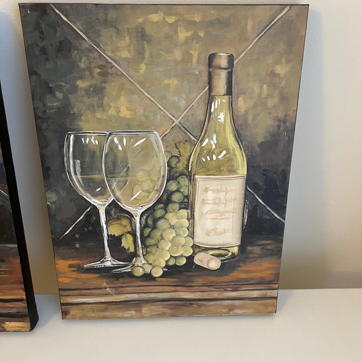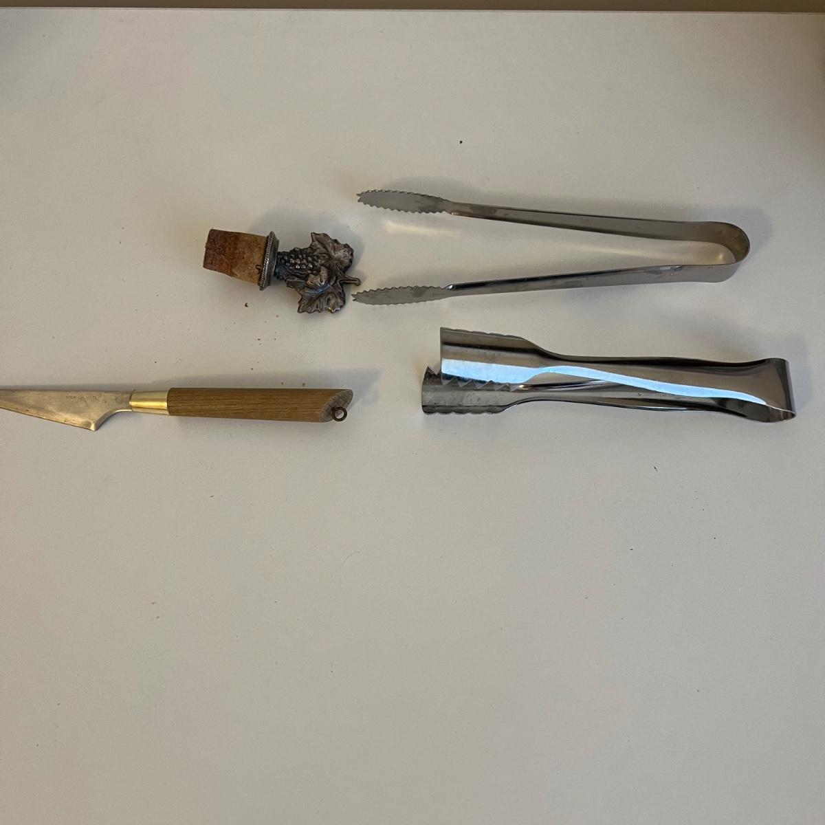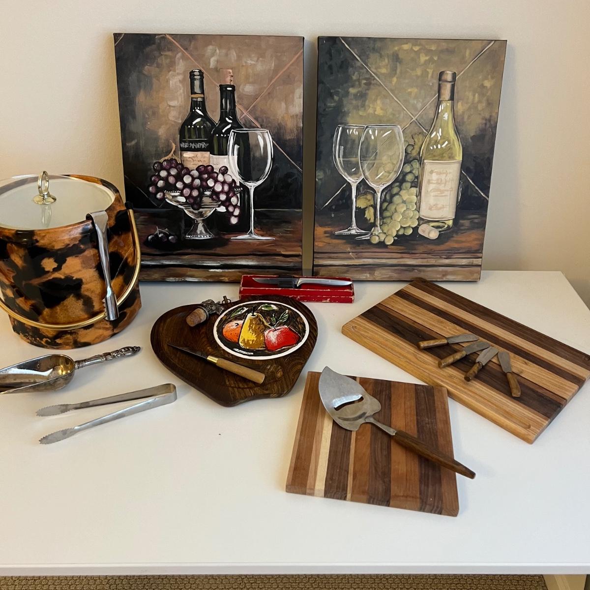 Three wooden cheese/serving cutting boards with several knives for cheese and spreads. Large is 12” x .5” x 8.5”H and smallest is 8” square. One Pixie Gerber Legendary Blade, a wine bottle stopper, an ice scoop and two sets of ice tongs. Two canvas red and white wine themed decor prints are both 12” x 1” x 16”H.