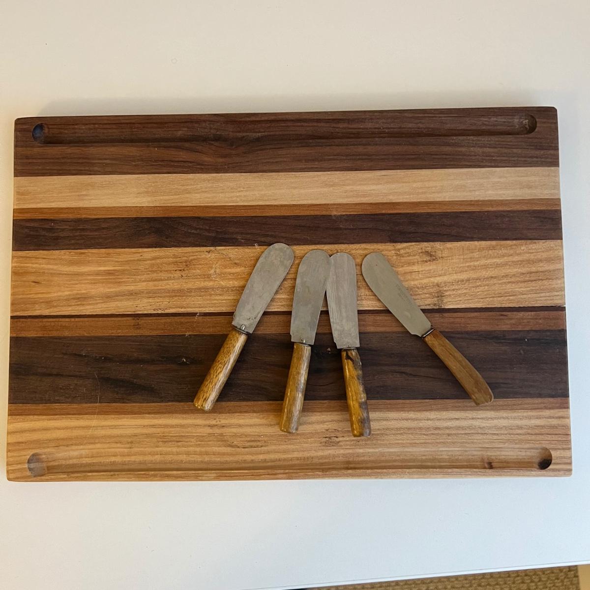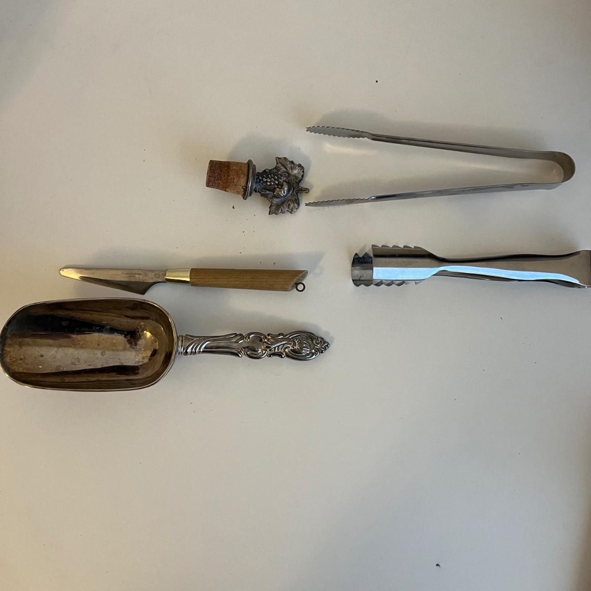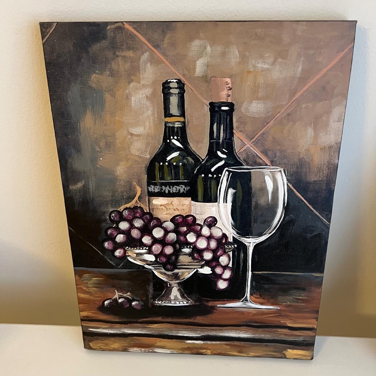 Three wooden cheese/serving cutting boards with several knives for cheese and spreads. Large is 12” x .5” x 8.5”H and smallest is 8” square. One Pixie Gerber Legendary Blade, a wine bottle stopper, an ice scoop and two sets of ice tongs. Two canvas red and white wine themed decor prints are both 12” x 1” x 16”H.