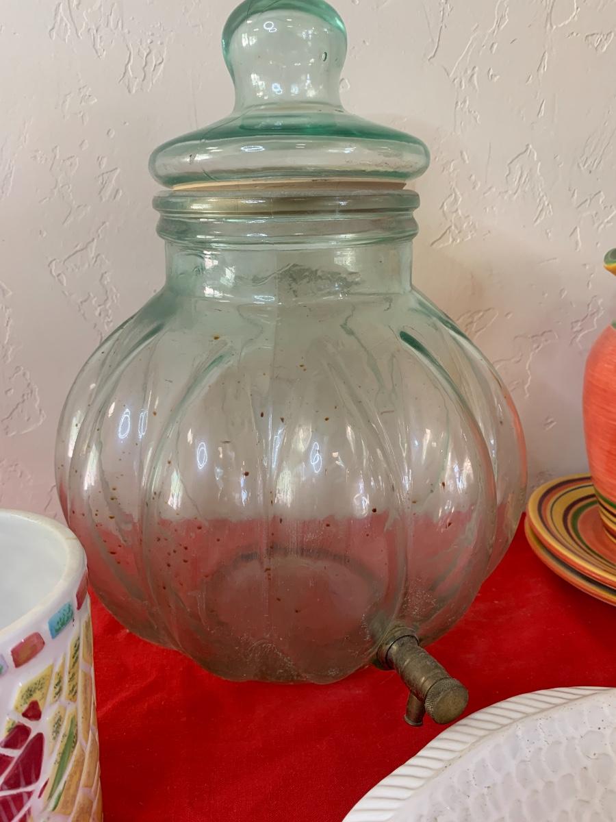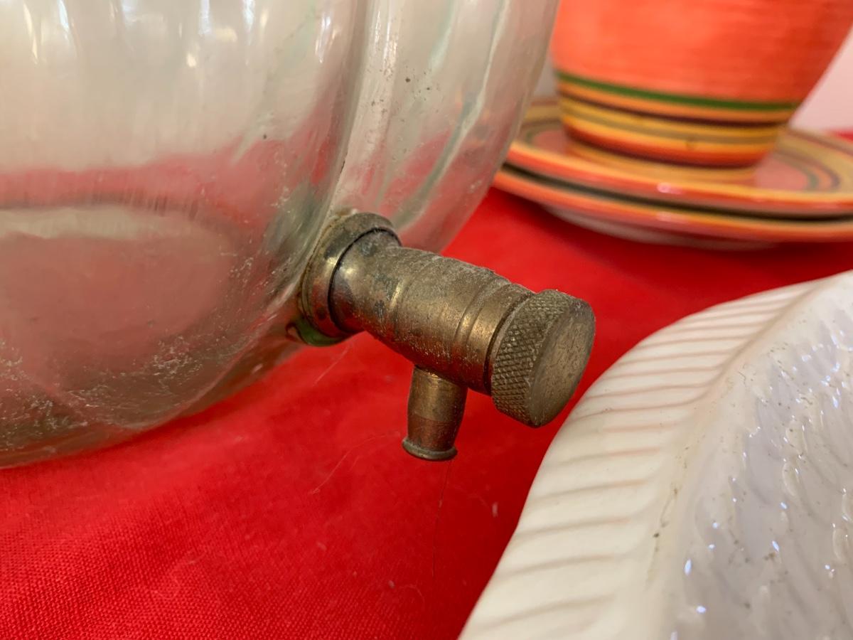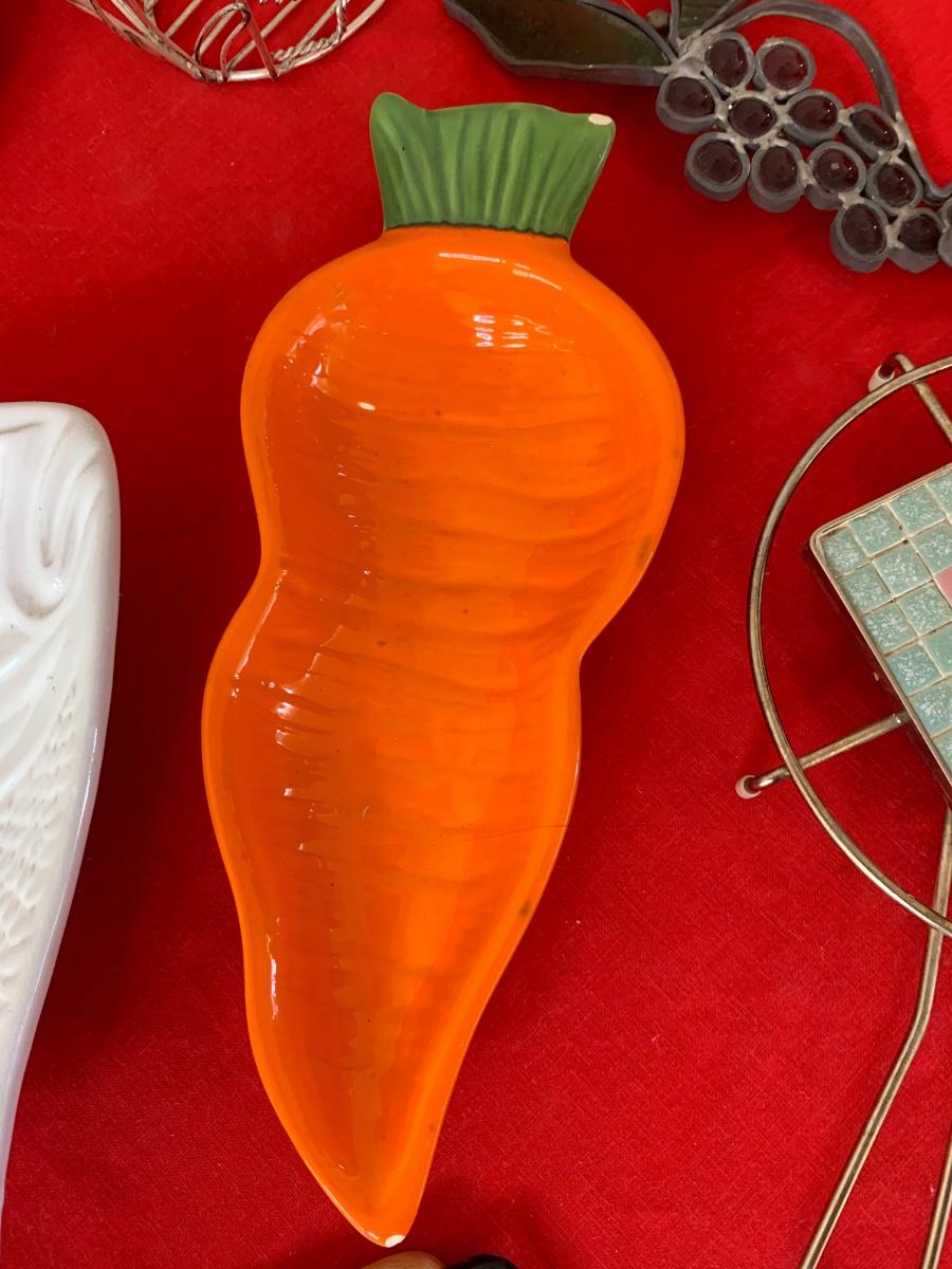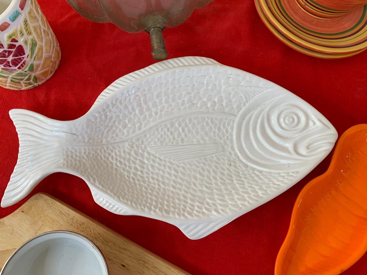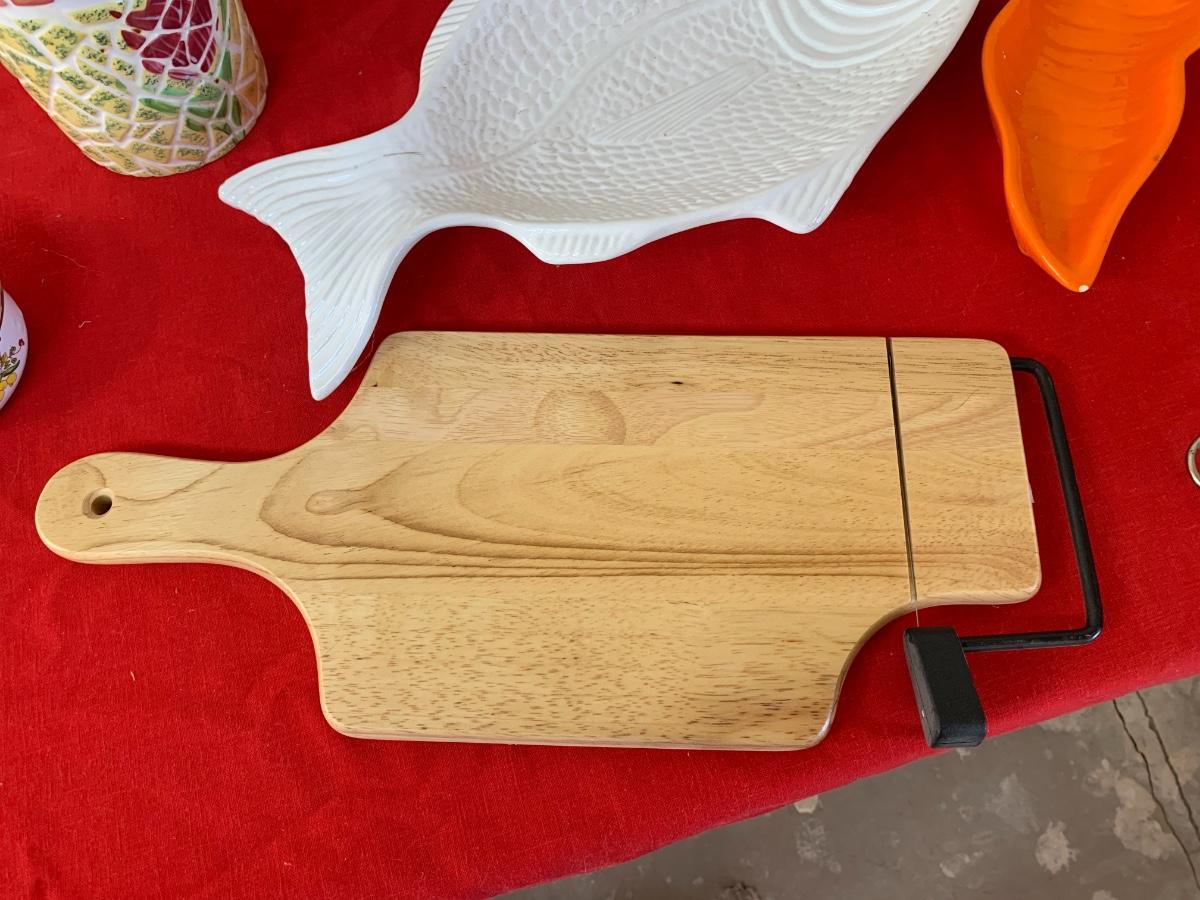 Entertaining lot includes one glass beverage dispenser with lid, one wire basket, one pacific rim china pitcher and two matching plates, one ceramic carrot platter with two small chips, one faux mosaic tile planter, one stained glass hanging grapes decor piece, one wood cheese board with built in slicer, one ceramic fish platter from Portugal and one mid century mosaic tile trivet