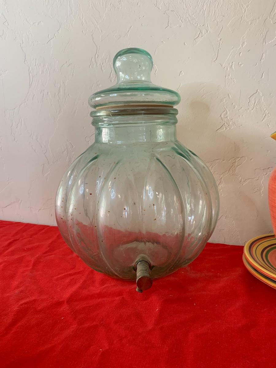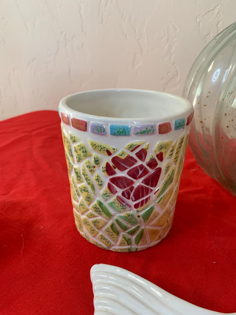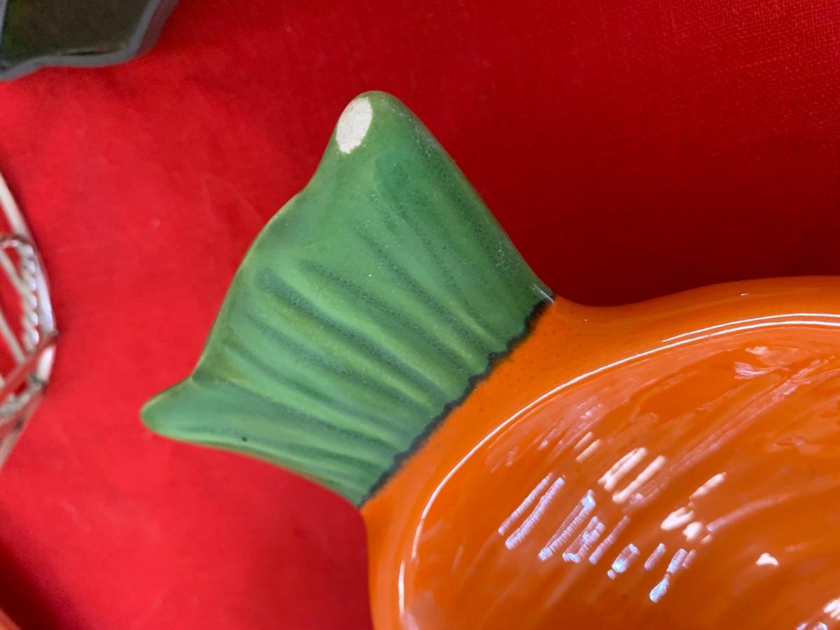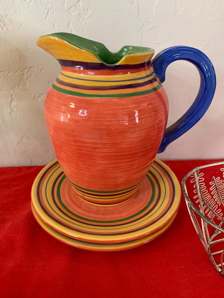 Entertaining lot includes one glass beverage dispenser with lid, one wire basket, one pacific rim china pitcher and two matching plates, one ceramic carrot platter with two small chips, one faux mosaic tile planter, one stained glass hanging grapes decor piece, one wood cheese board with built in slicer, one ceramic fish platter from Portugal and one mid century mosaic tile trivet