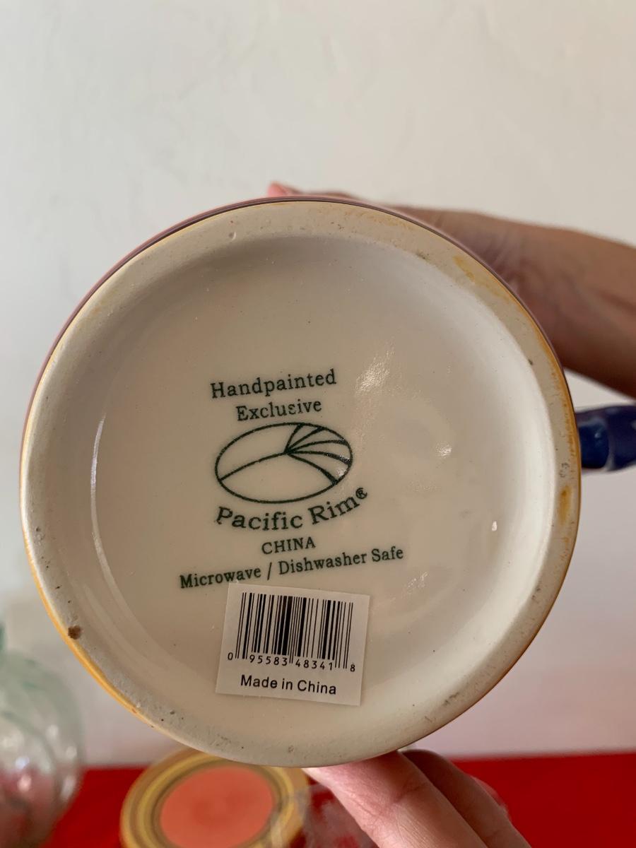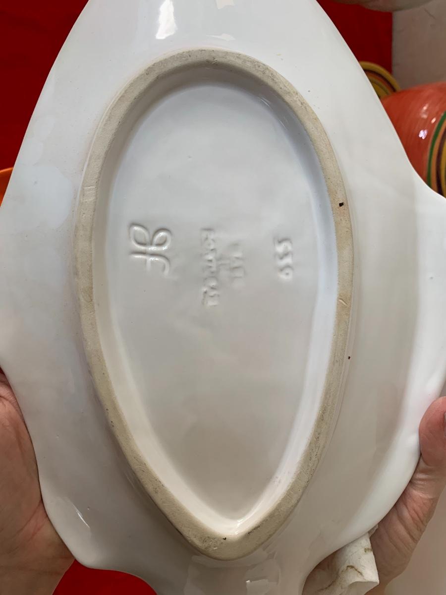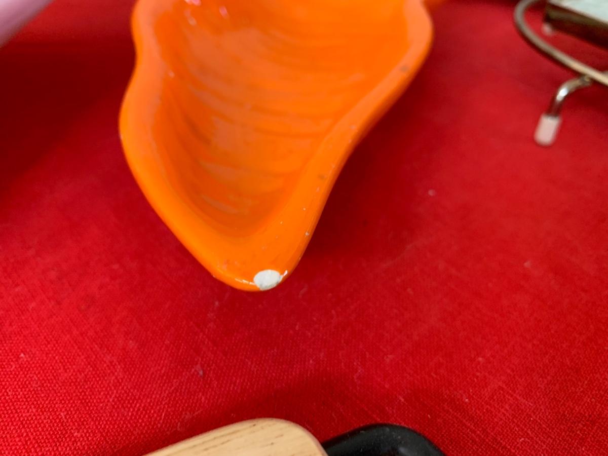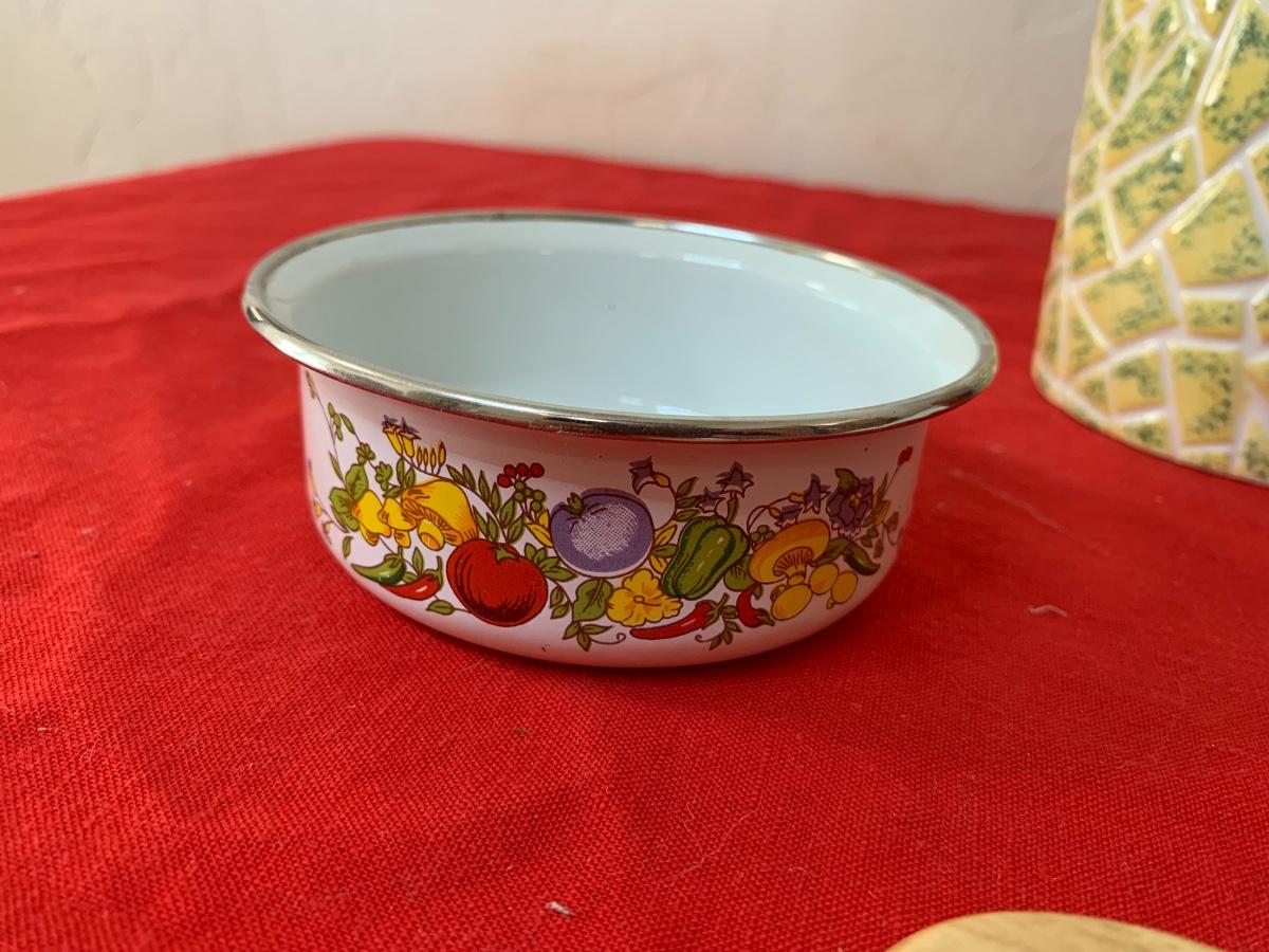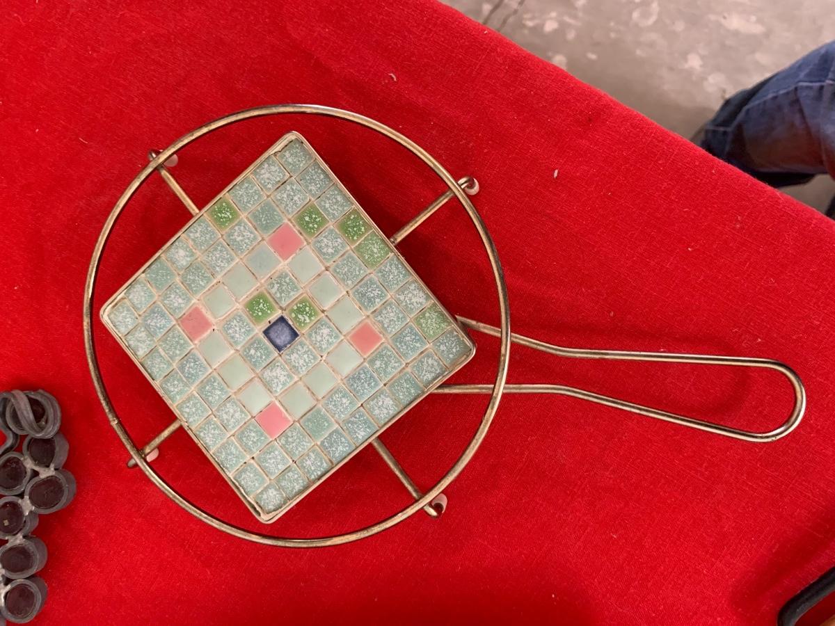 Entertaining lot includes one glass beverage dispenser with lid, one wire basket, one pacific rim china pitcher and two matching plates, one ceramic carrot platter with two small chips, one faux mosaic tile planter, one stained glass hanging grapes decor piece, one wood cheese board with built in slicer, one ceramic fish platter from Portugal and one mid century mosaic tile trivet