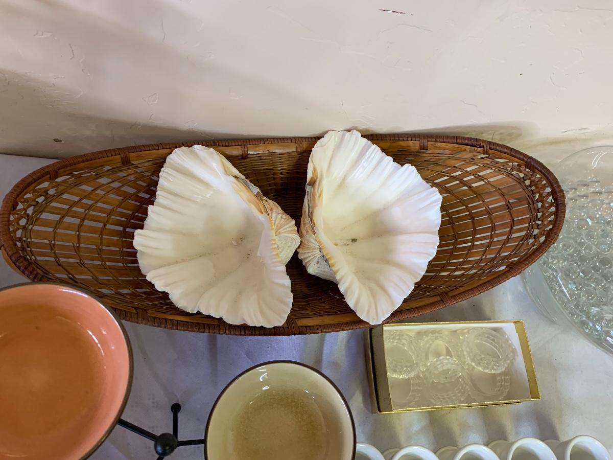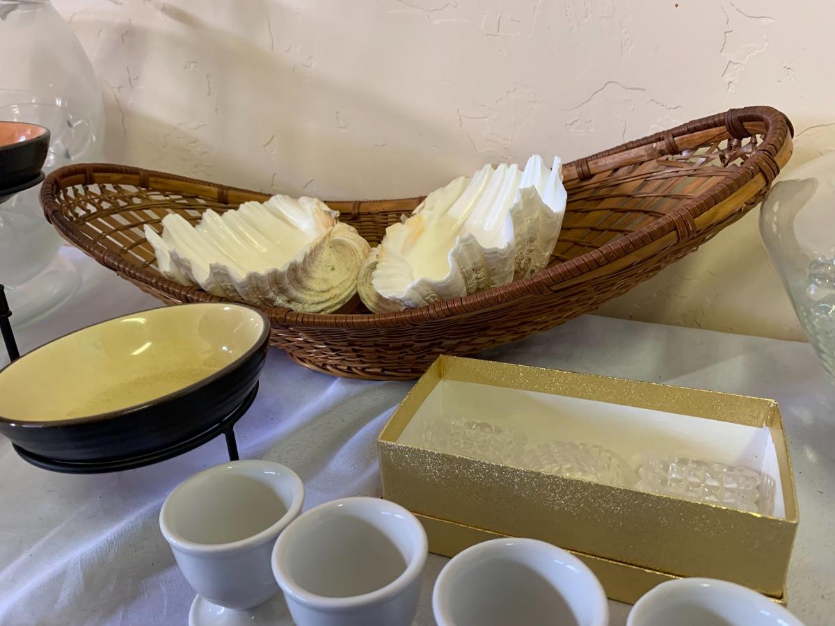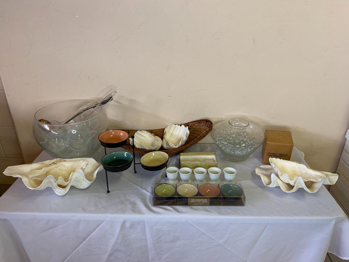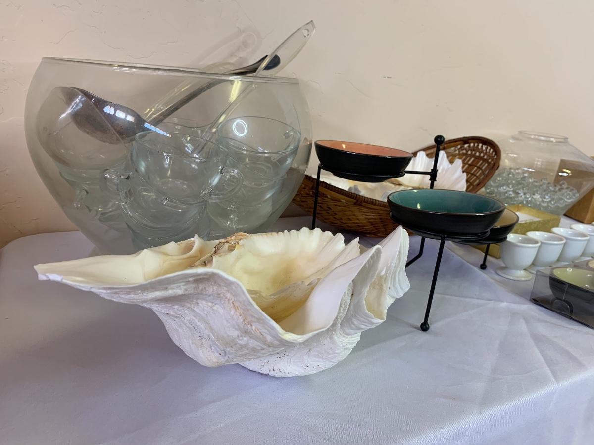 Includes punch bowl with cups and ladles, large shells for serving, wood basket, appetizer bowls etc.